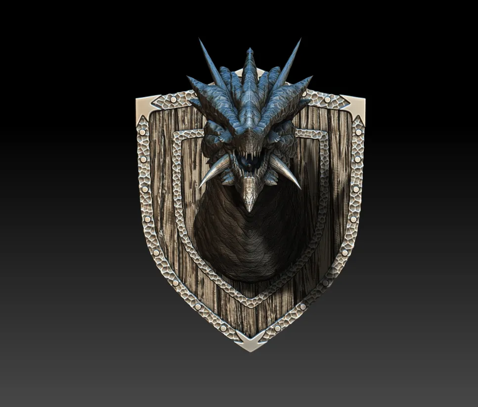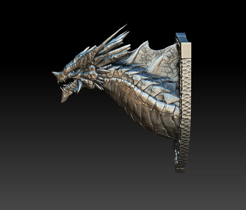 Apply bright silver along the crest edges to accentuate the fractured geometry. Introduce subtle blue-grey shadows between scale plates to deepen the metallic illusion. Edge-highlight the jawline to sharpen its triangular silhouette. Finally, review the rotating showcase video to observe how the sculpt’s layered facets interact with directional light.