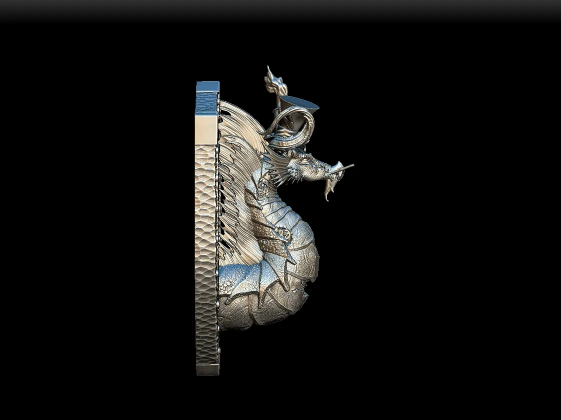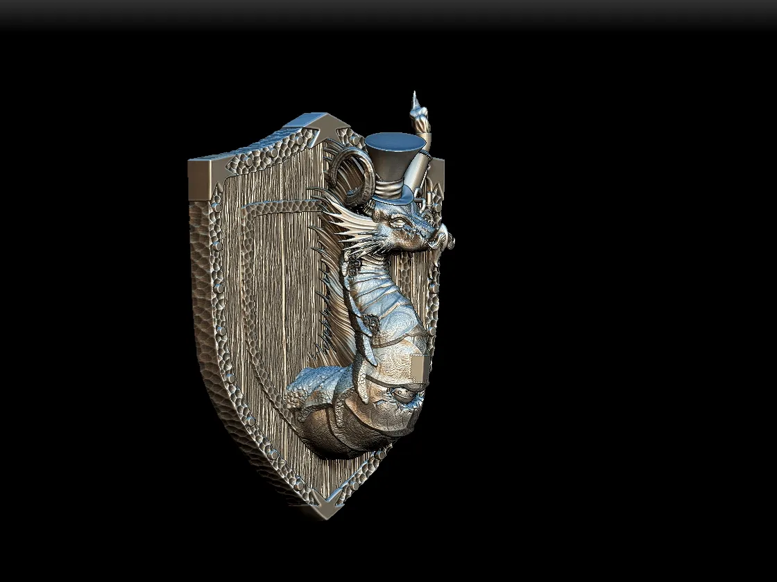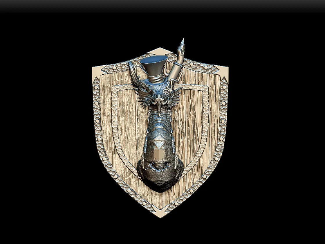 Begin with a dark metallic base to anchor the structure. Then layer warm brass or copper tones across the hat trim and ornamental accents. Add subtle patina effects within recessed lines to suggest age and refinement. Finally, adjust directional lighting to highlight the interplay between organic scales and engineered embellishments.