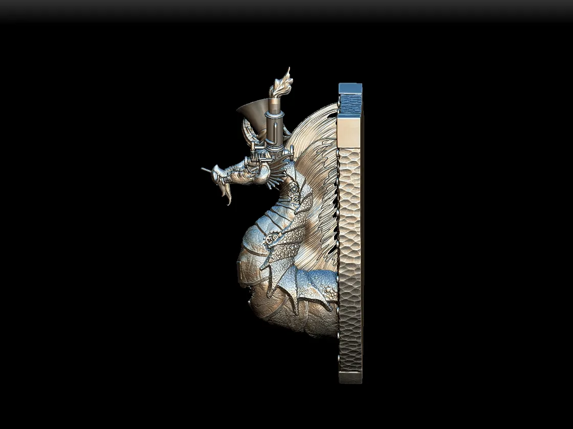 Segmented neck plates descend in structured rows, echoing the rhythm of precision machinery. Fine spines rise along the crest, directing attention toward the expressive facial lines and fitted eyewear. In addition, subtle rivet-like textures and ornamental trim reinforce the industrial theme without overwhelming the form. Therefore, painters can combine antiqued brass, brushed steel, deep copper, or muted leather tones to enhance the steampunk character while preserving sculpt clarity.