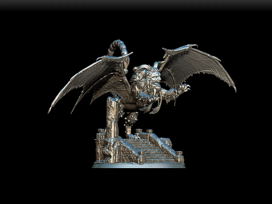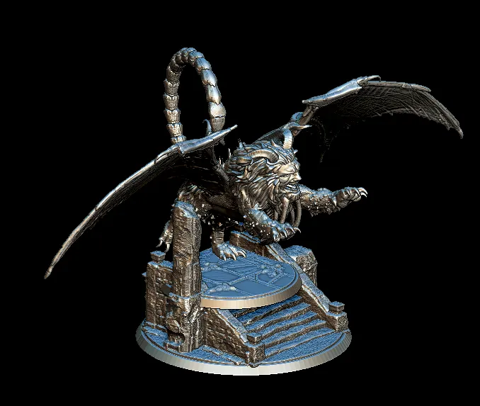 The Manticore crouches atop stone steps, wings spread wide as a barbed tail arches overhead in lethal readiness. A snarling leonine face frames curved horns, while clawed forelimbs grip the ruined platform. Moreover, the extended wings and elevated tail create a dramatic vertical sweep. Watch the rotating product video to explore the layered textures and poised aggression from every angle.