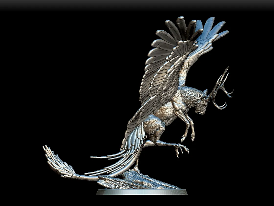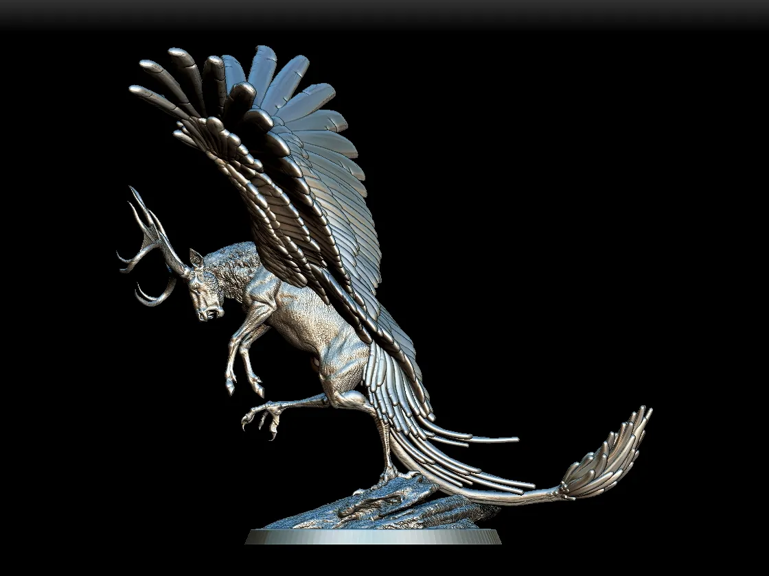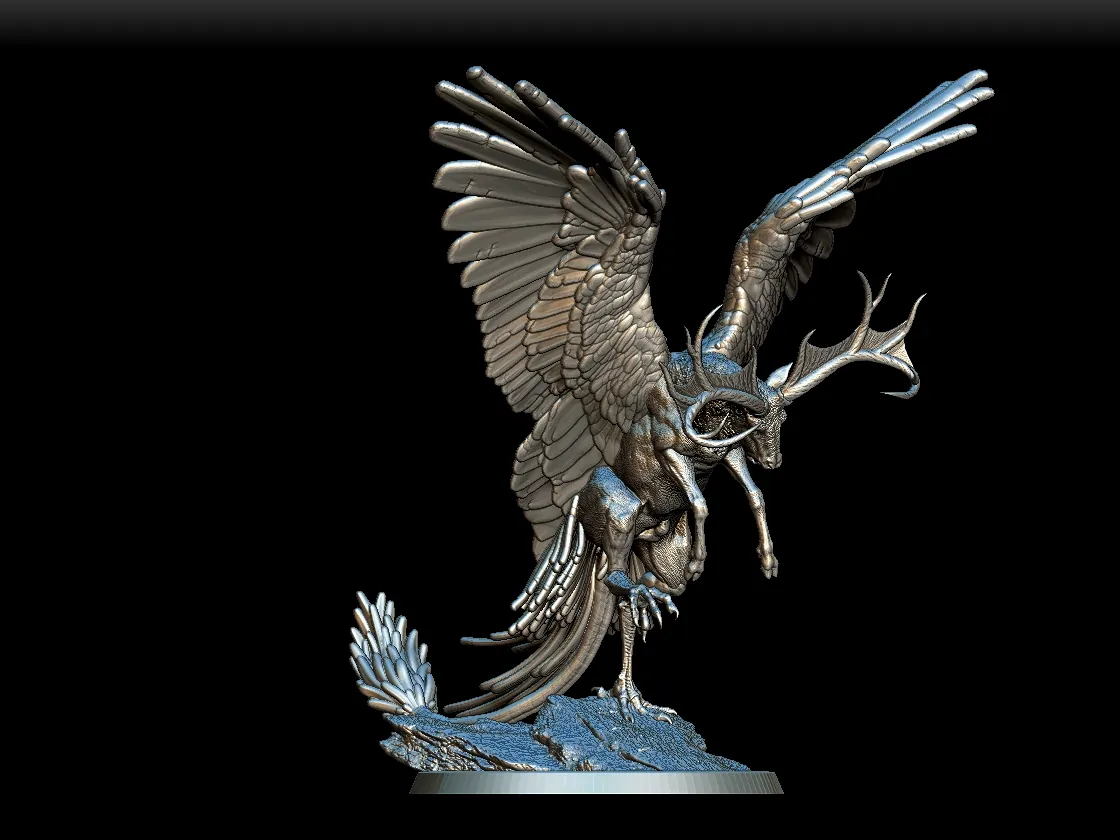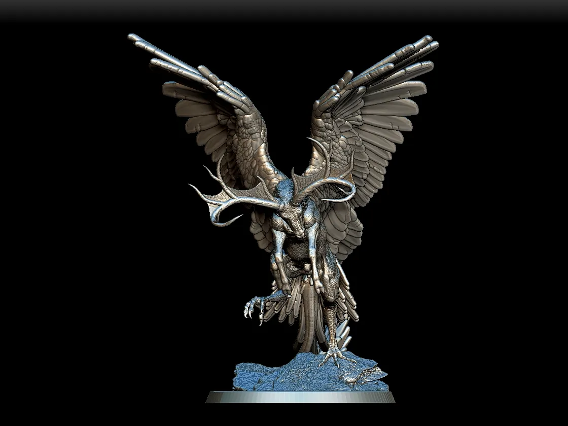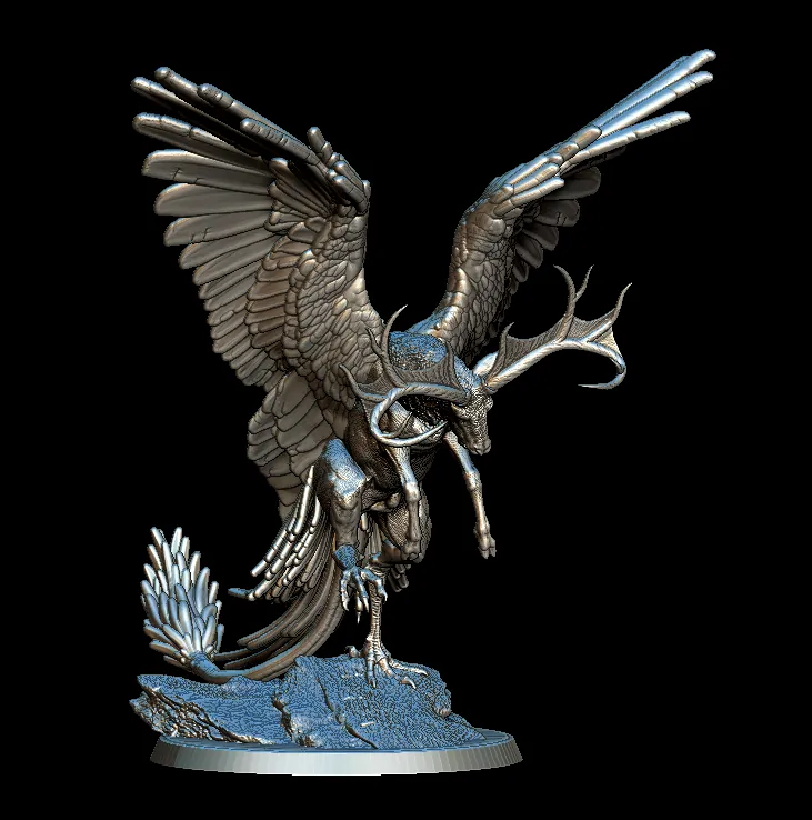 Because of the layered feathers, this model rewards careful dry brushing and subtle tonal gradients. Furthermore, the antlers allow contrasting color treatments to emphasize shape and character. In addition, the textured base supports natural stone effects and weathered finishes. Consequently, the Peryton becomes a striking display piece whether showcased in a cabinet or introduced into intense tabletop encounters.