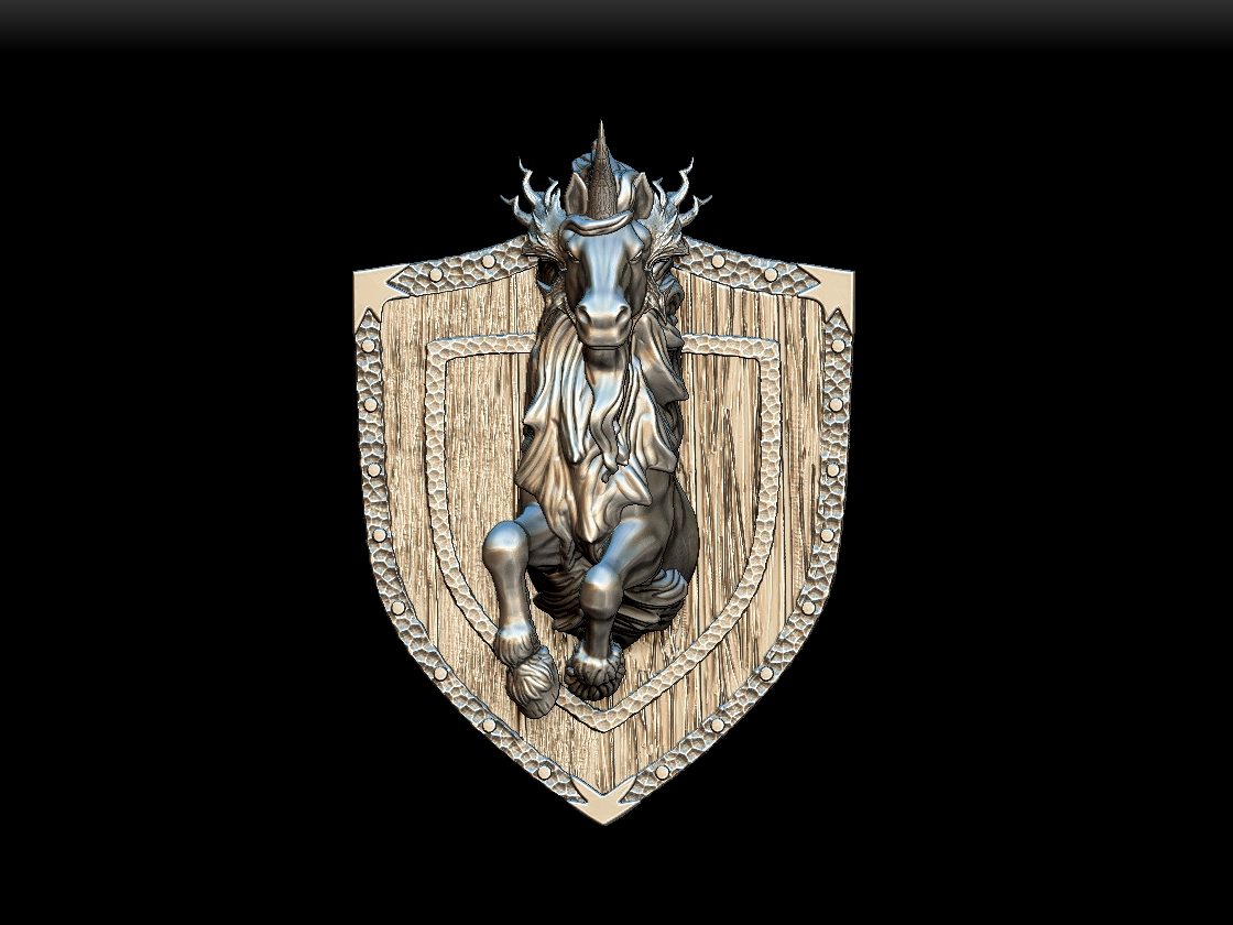 Mounted on a wood iron-banded shield trophy backplate. (dark unicorn bust)