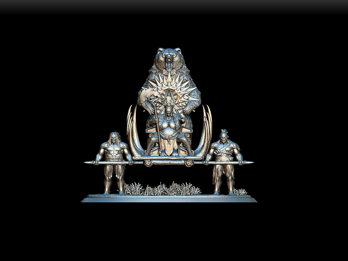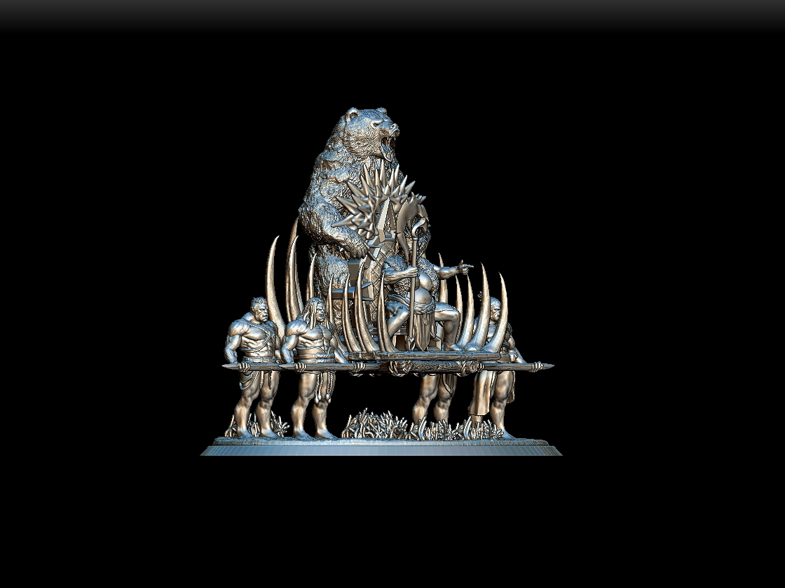 Full-body sculpt with tusks, scars, clawed hands, and hunched posture.
