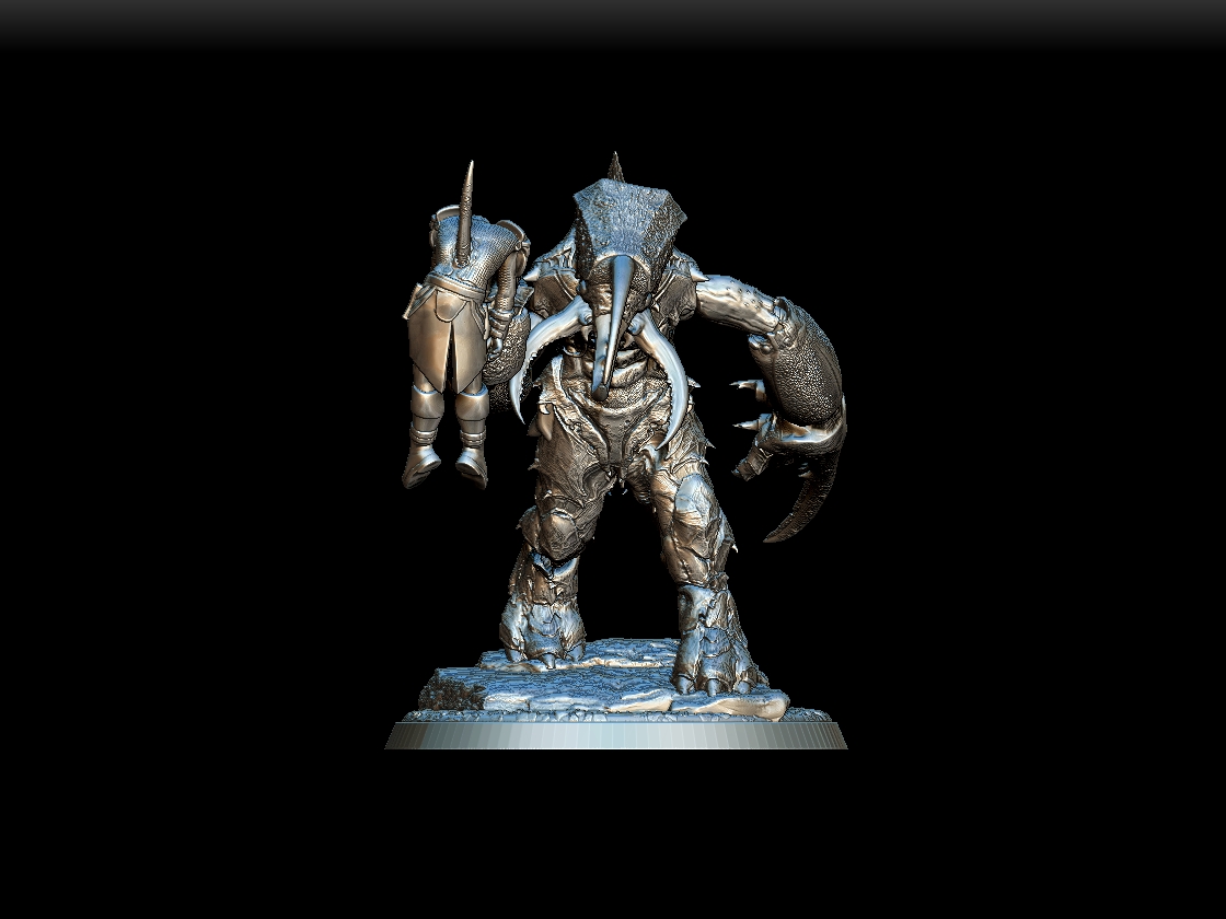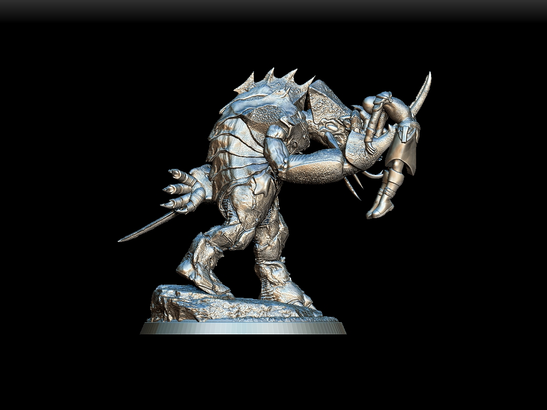 Full-body sculpt with armored plates, clawed hands, and mandibles.