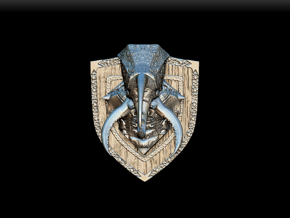 Mounted on a wood iron-banded shield trophy backplate. (insectoid bust)
