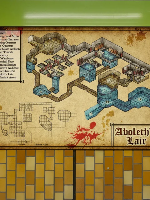 Additionally, the gridded floor pattern runs through the entire complex in browns and grays. A legend lists entrance, laboratory, sleeping quarters, and underdark access locations. The bottom left corner includes a traditional top-down grid version of the layout.
