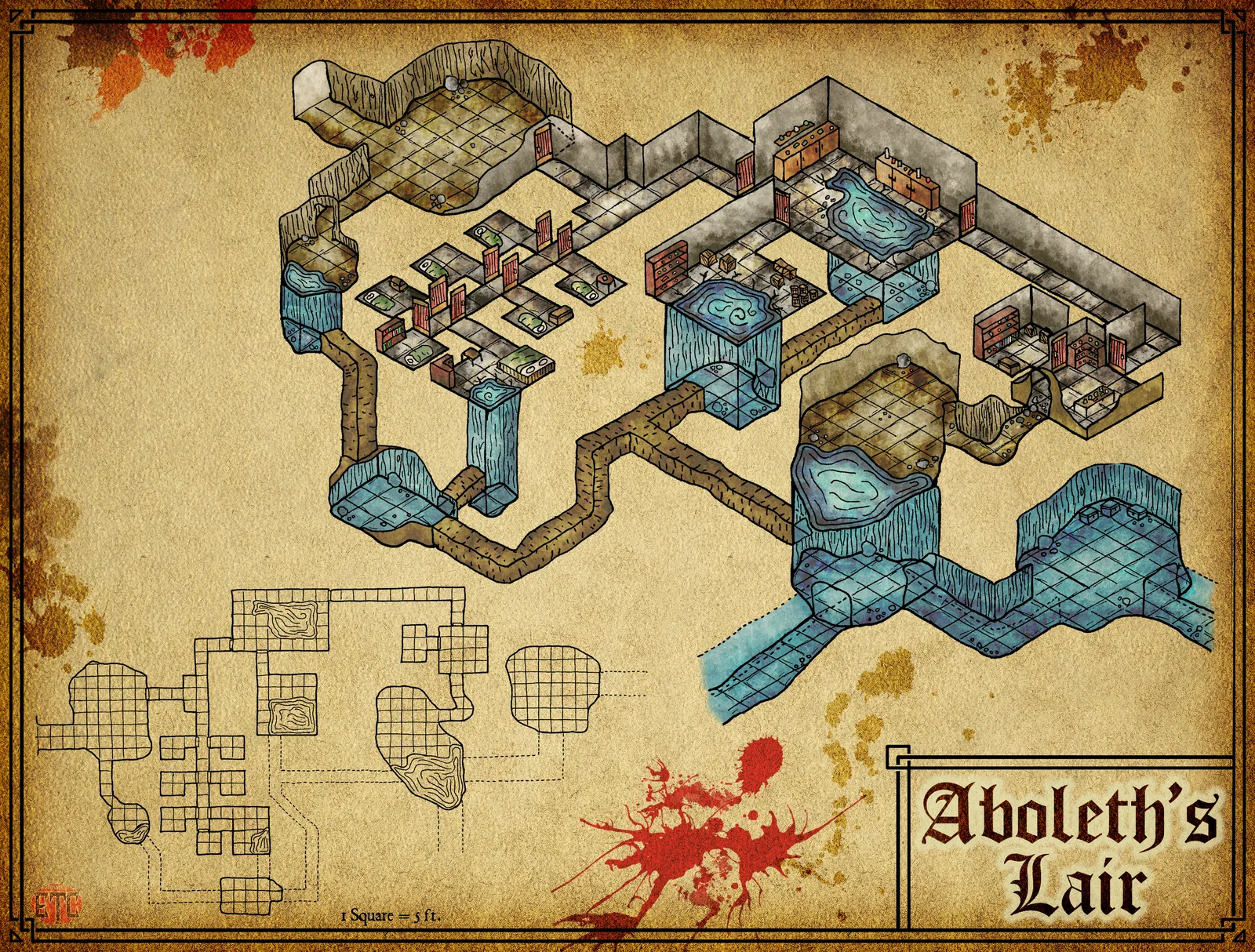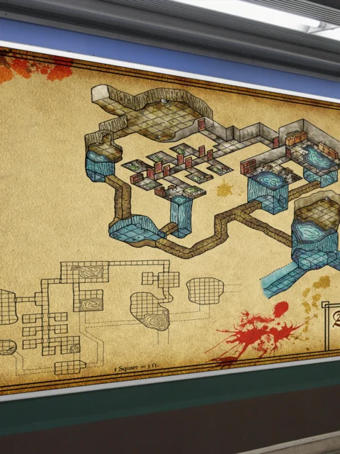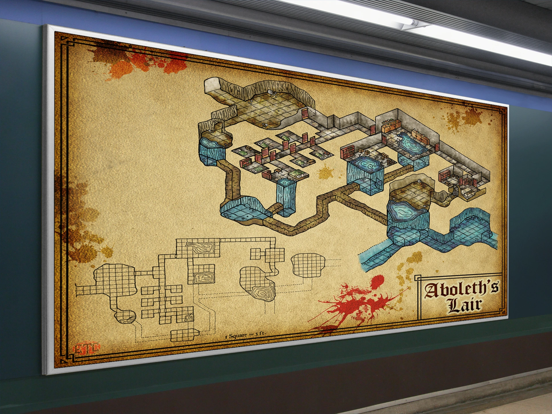 What is more, the top-down floor plan sits below the main view with precise grid overlay. Natural cave formations interrupt the stonework where the aboleth’s domain meets raw earth. Gothic lettering marks the bottom corner alongside a scale indicator for measuring encounter distances.
