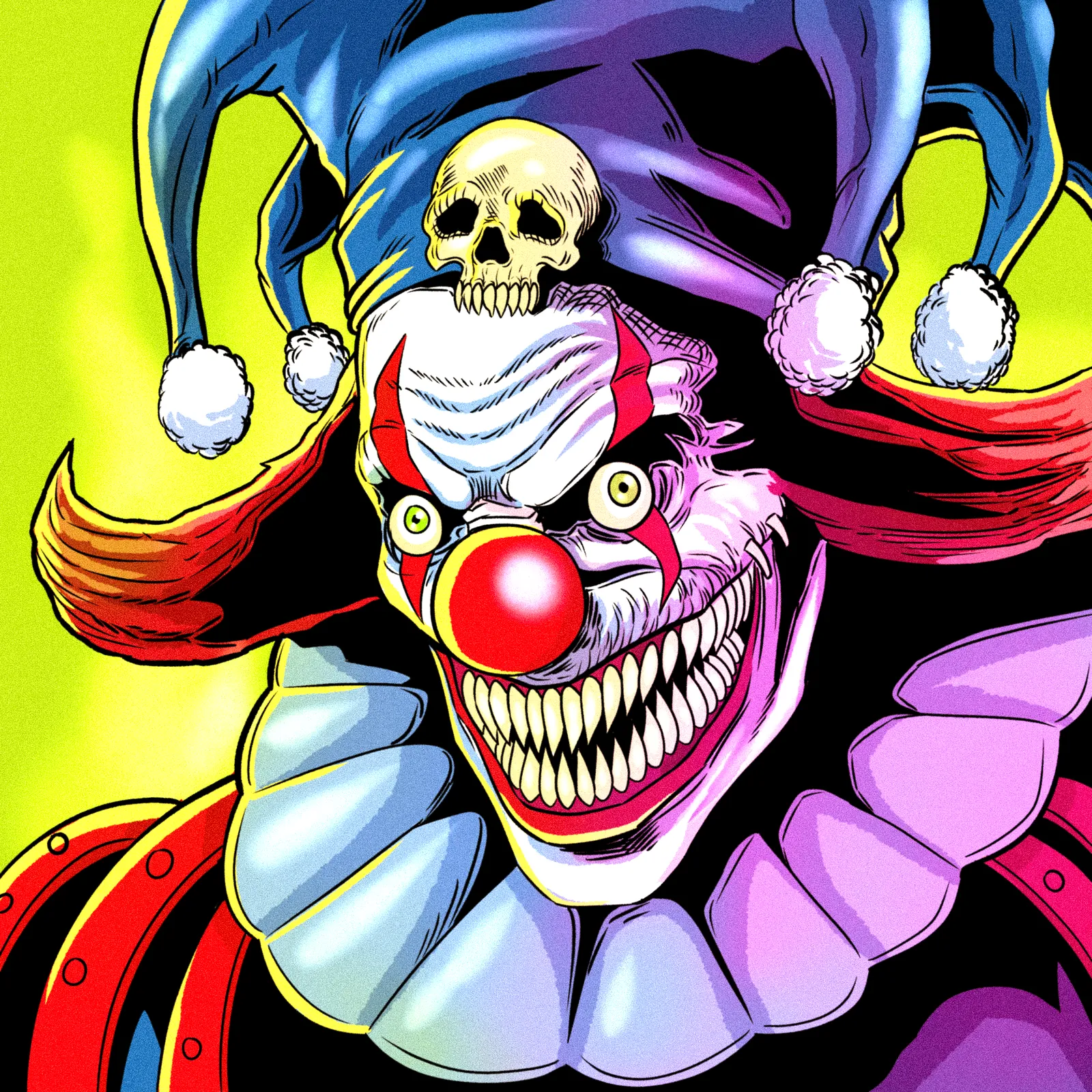 A skeletal jester grins with yellow-green eyes and a bulbous red nose. This absolute terror art trading card art canvas print captures Fabricio Vainer’s bold comic illustration style. Notably, a pale skull sits atop the figure’s head like a crown.