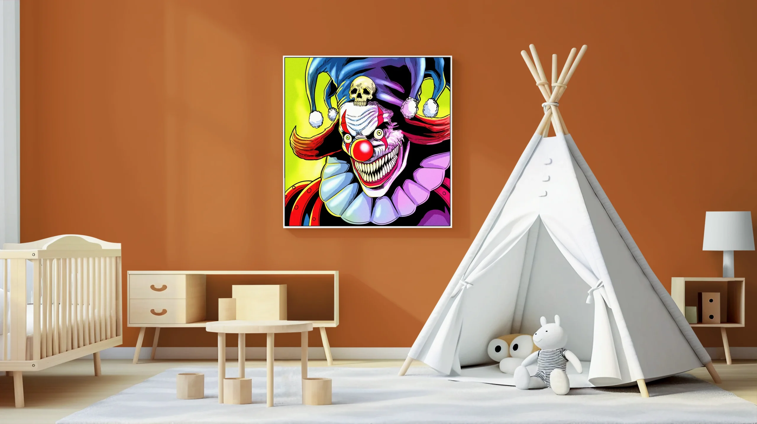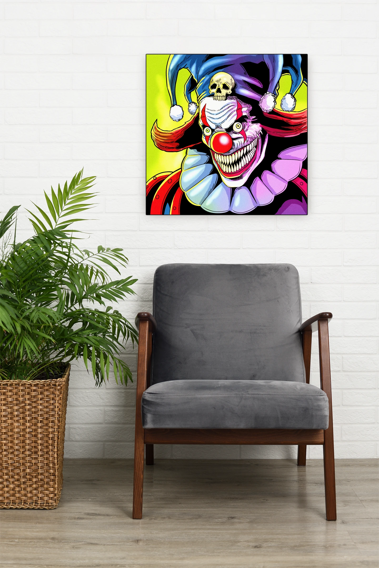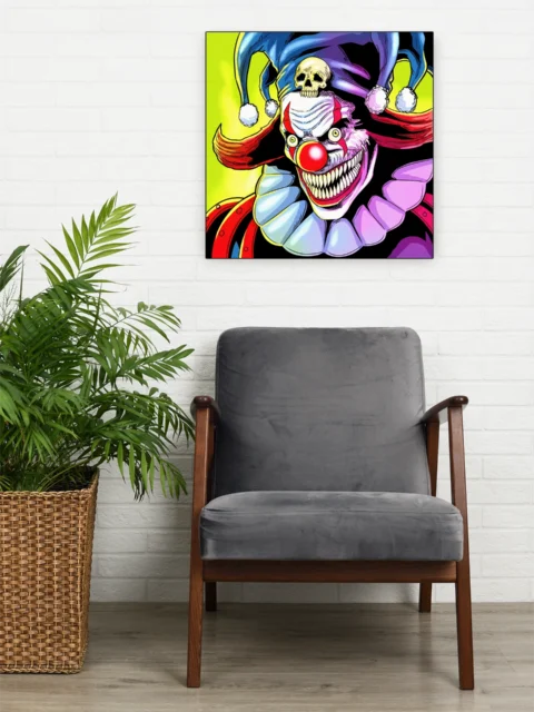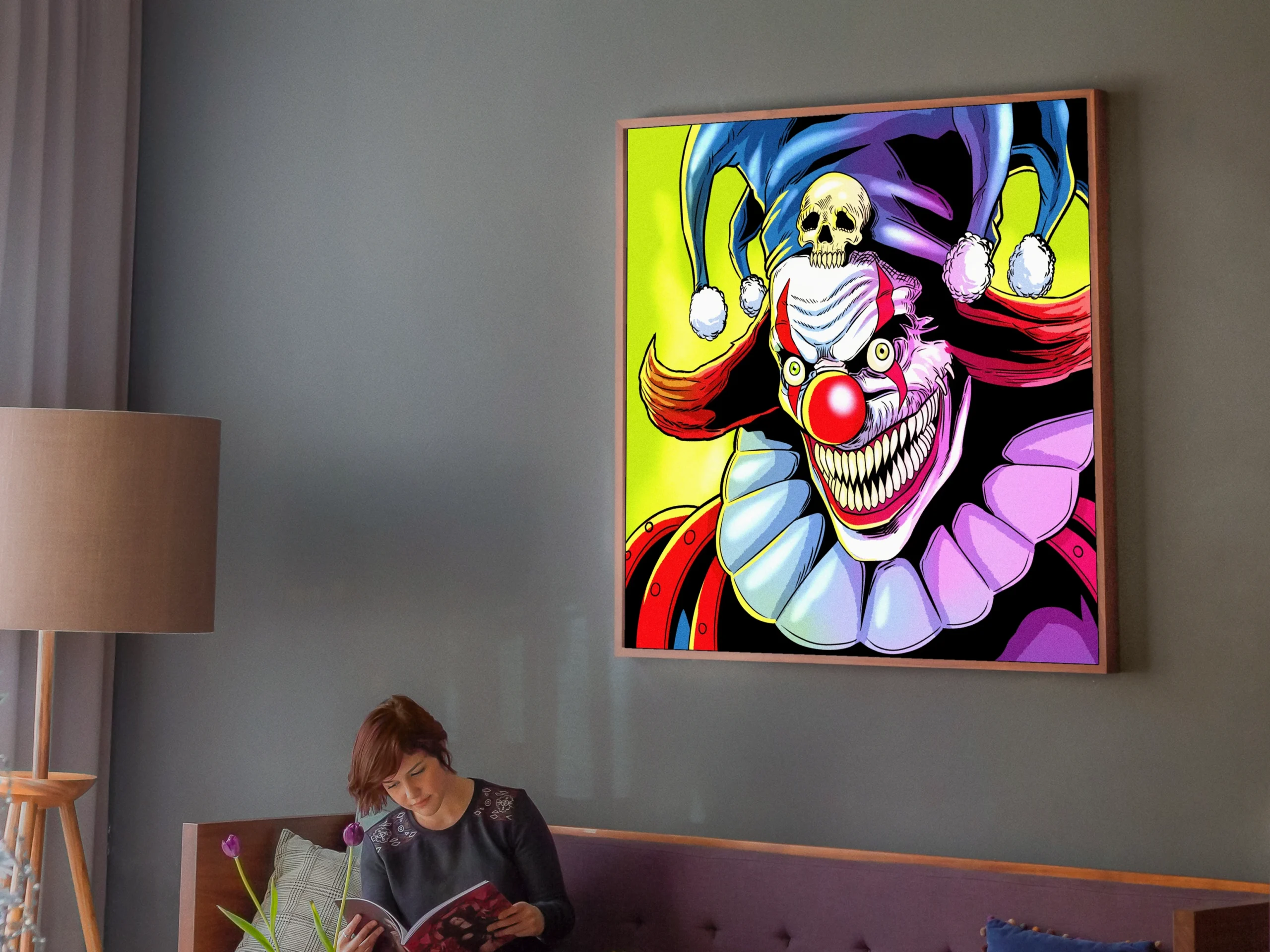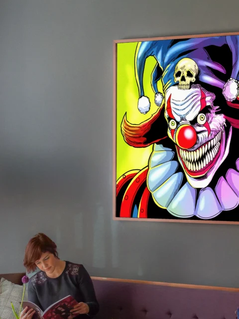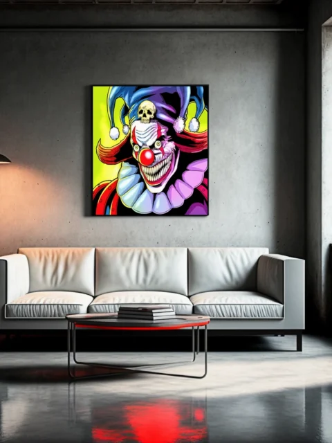 The sinister jester works in game rooms where bold horror art sets the tone. Additionally, it pairs well with other darkly playful character illustrations from the series.