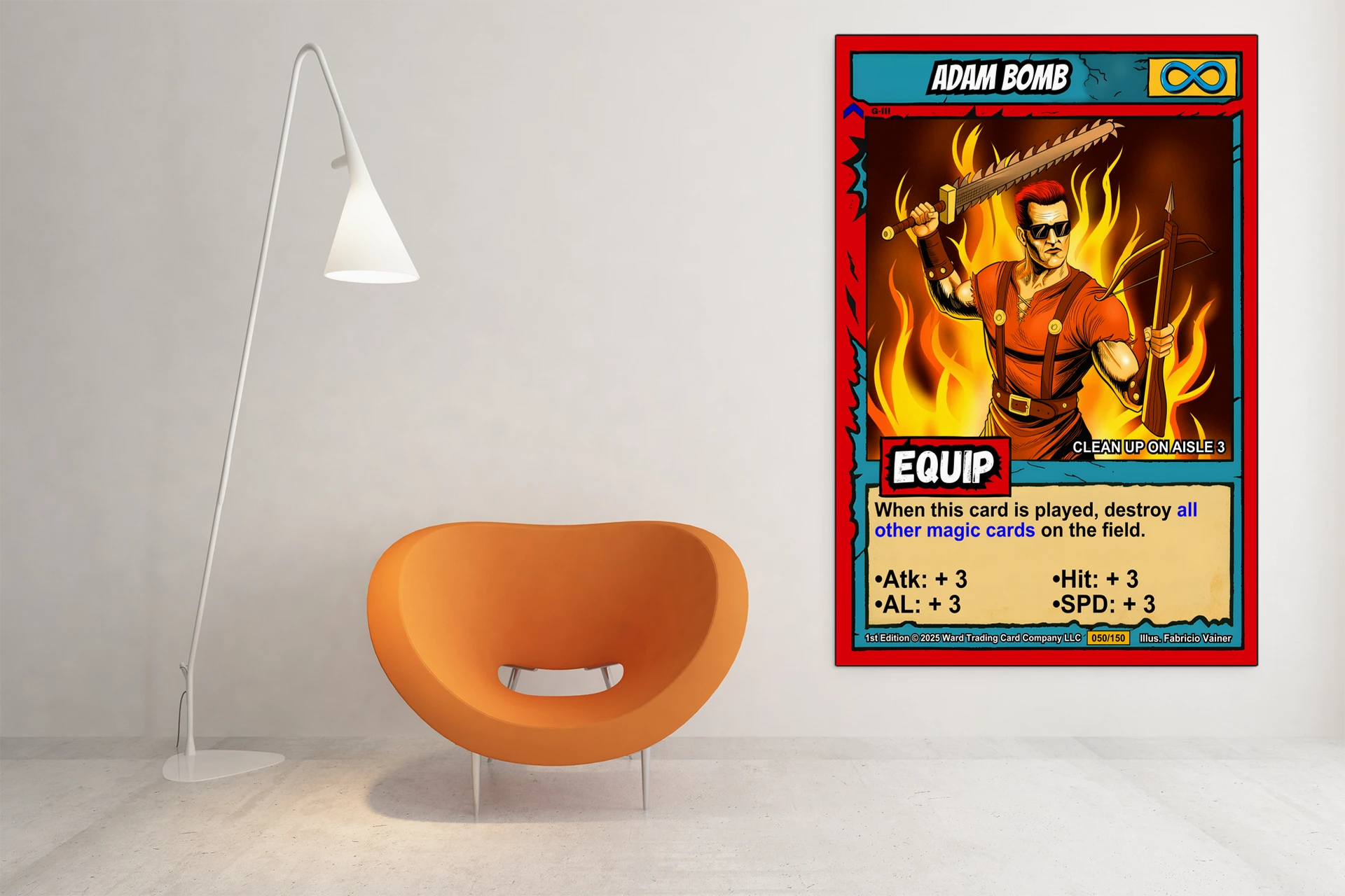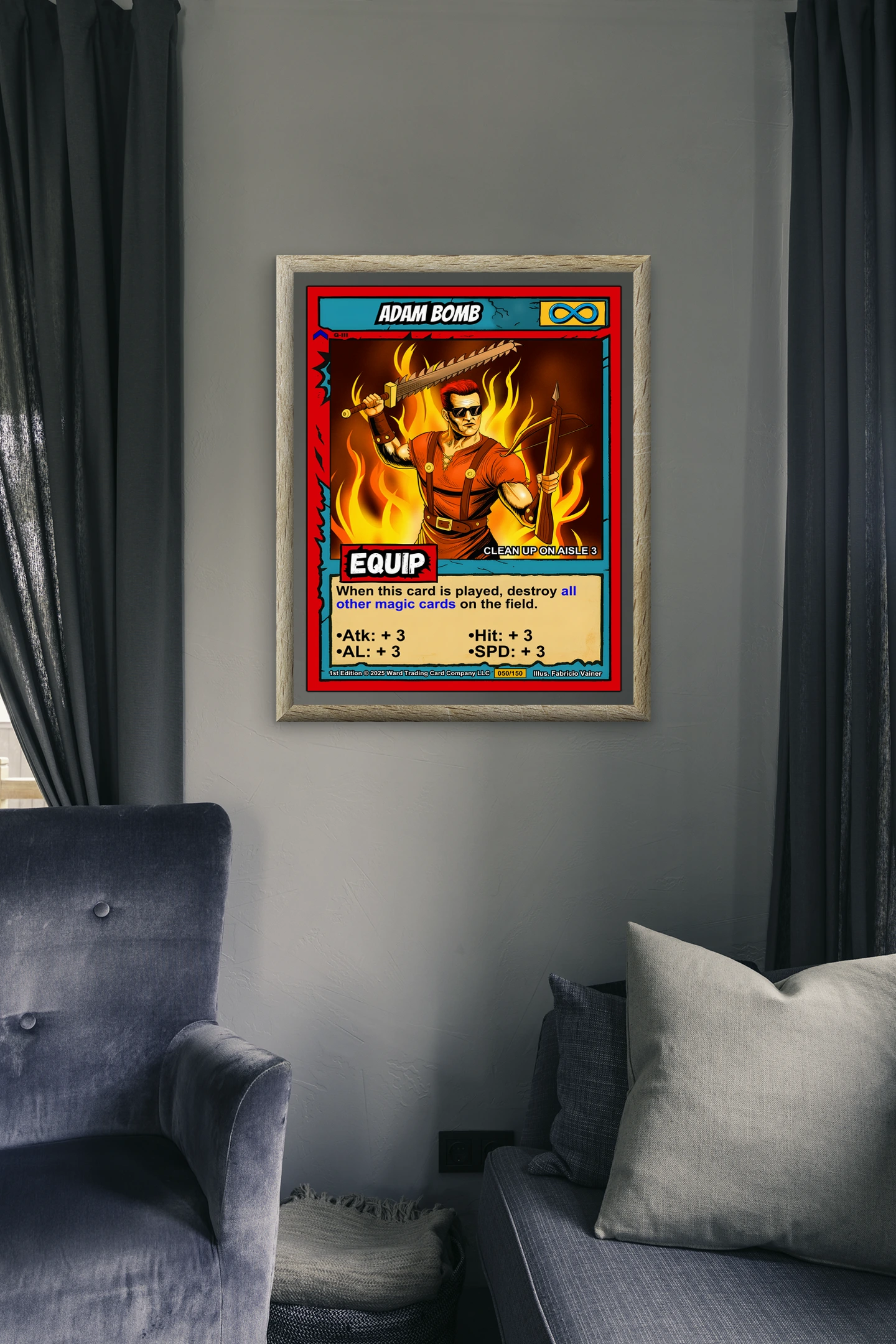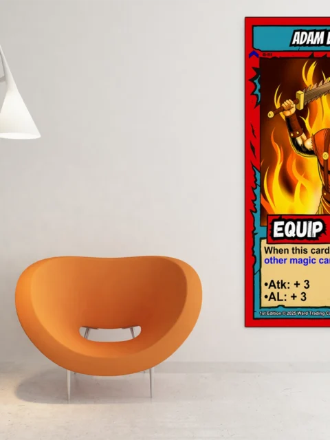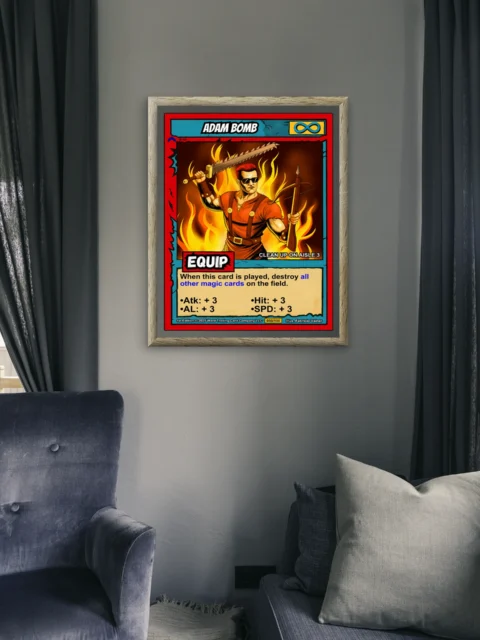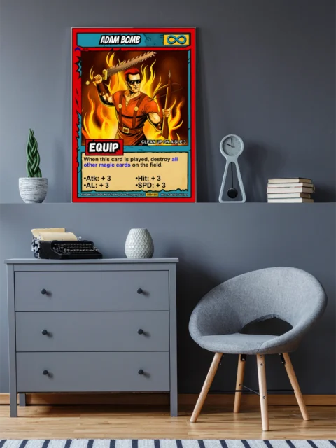 The comic book linework and cel-shaded flames read clearly from across the room. Collectors hunting Ward TCG card art appreciate the preserved layout and game text. This adam bomb trading card canvas print delivers the aggressive energy of the original illustration.