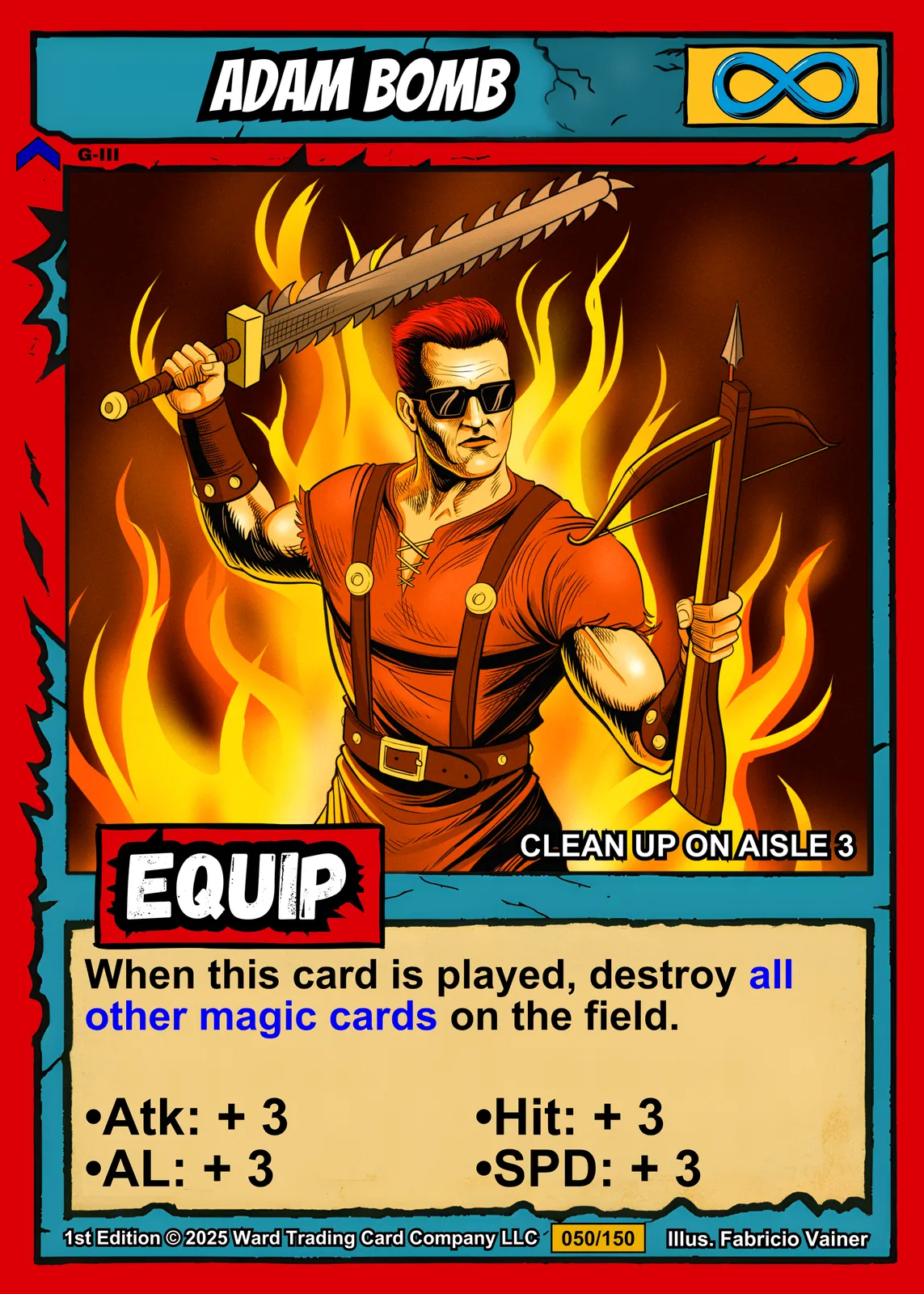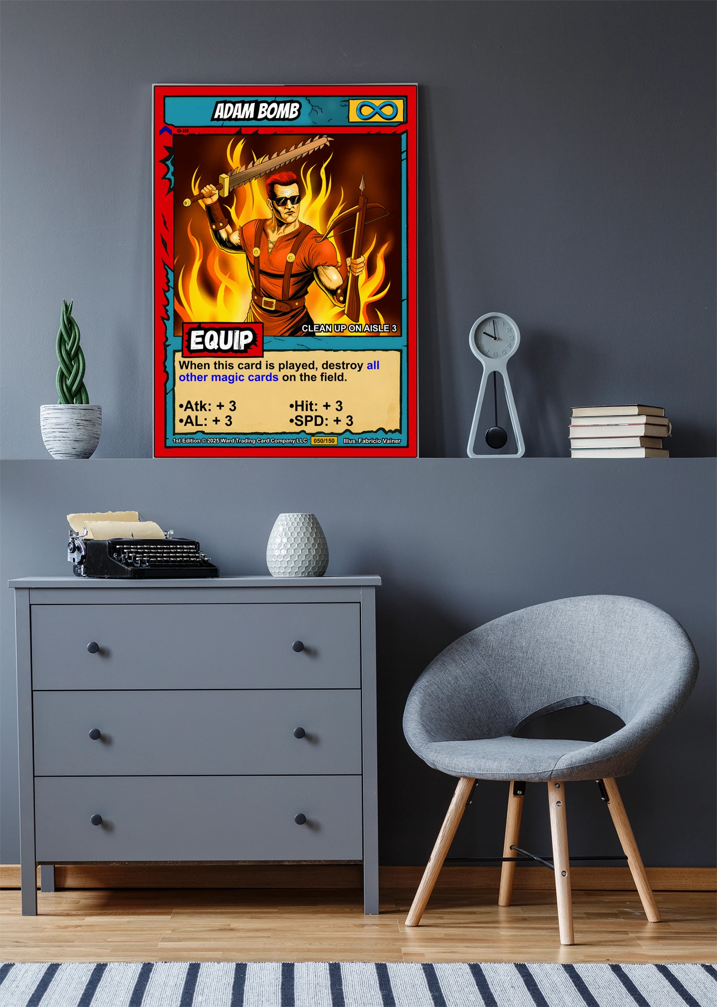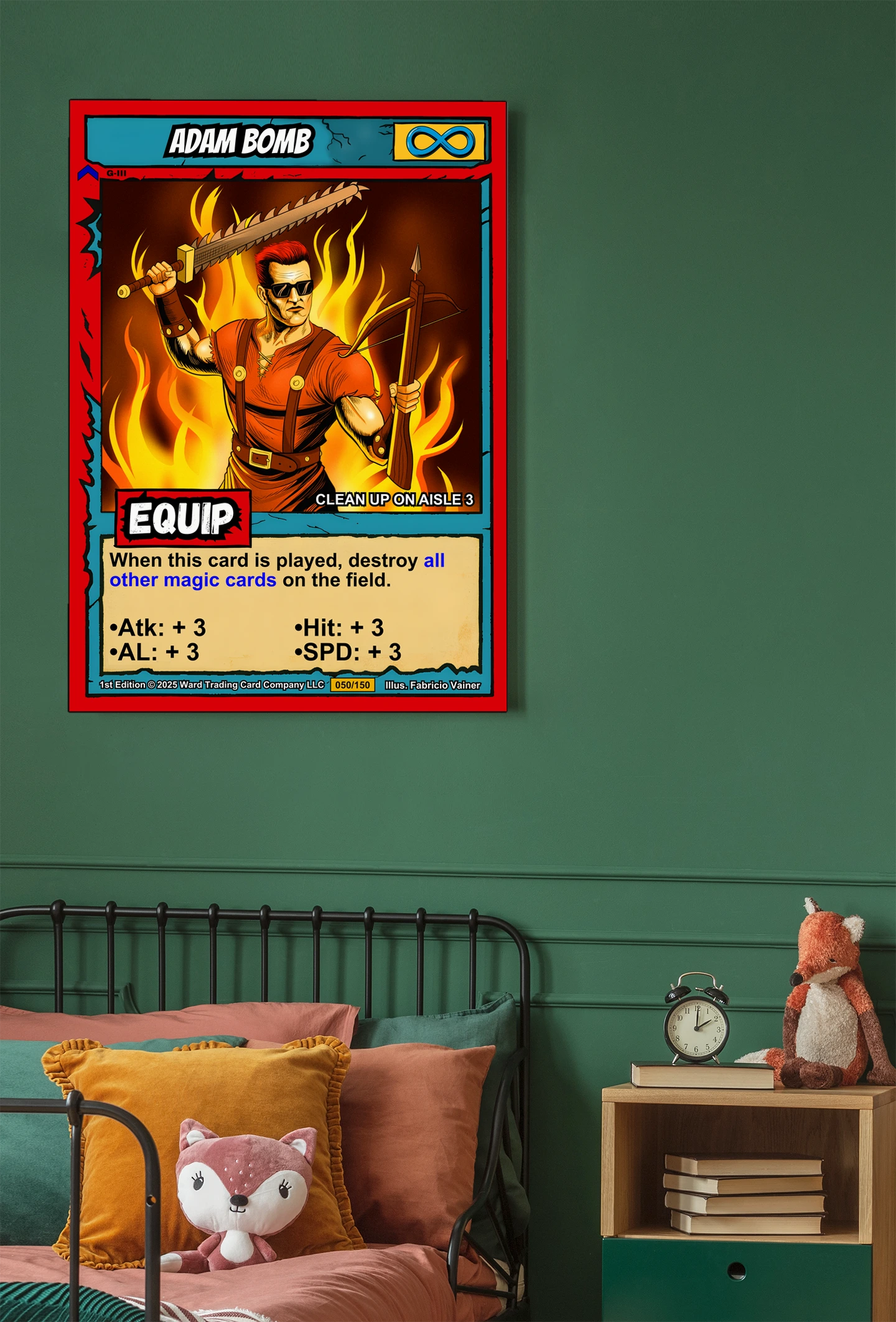 The comic book linework and cel-shaded flames read clearly from across the room. Collectors hunting Ward TCG card art appreciate the preserved layout and game text. This adam bomb trading card canvas print delivers the aggressive energy of the original illustration.