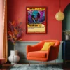 This piece anchors a trading card game collection wall or fills vertical space in a gaming room. Indeed, the fiery palette commands attention without overwhelming adjacent artwork.
