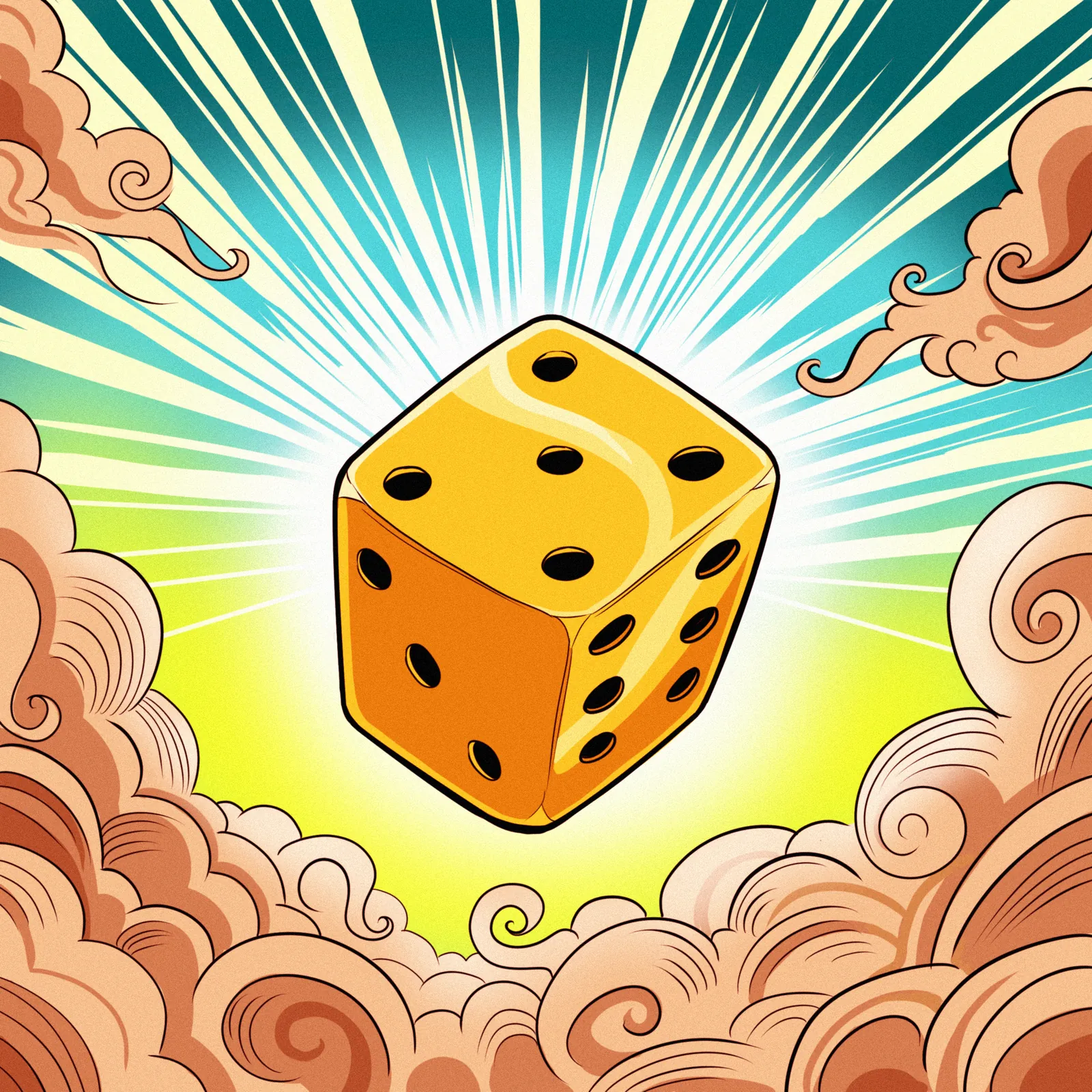 A golden-yellow die floats weightlessly against radiating speed lines and gradient sky. This advantage art trading card art canvas print captures Fabricio Vainer’s cel-shaded illustration at full scale. The die displays black pips notably rendered with glossy orange-gold gradient shading.