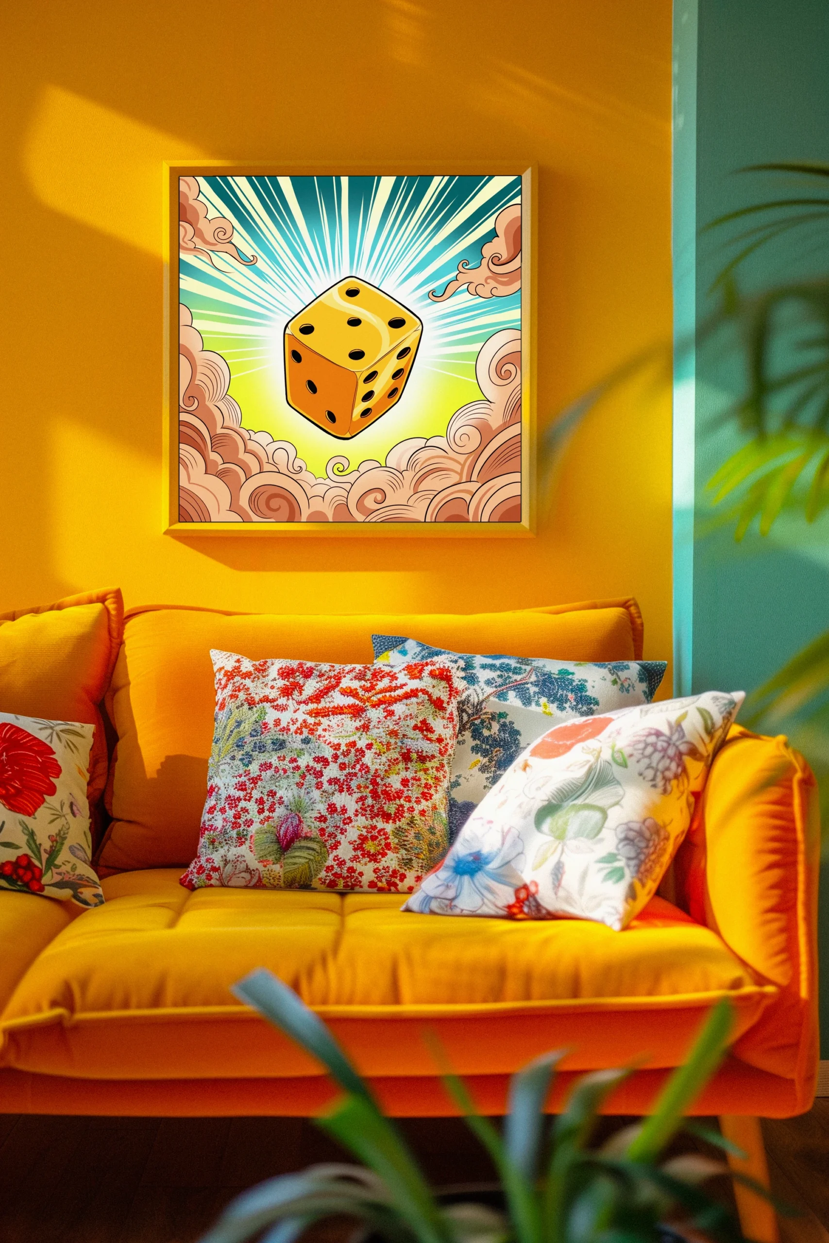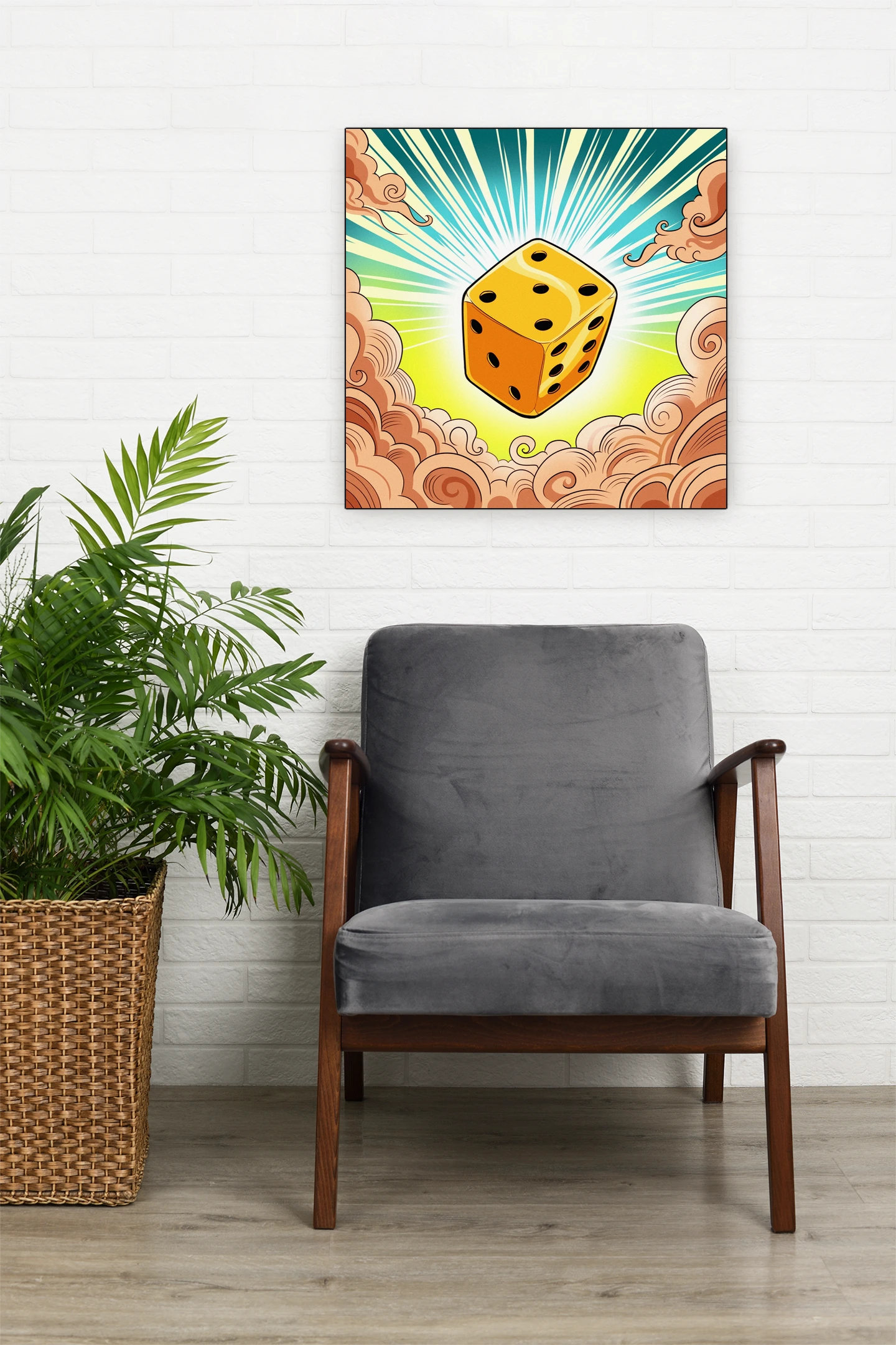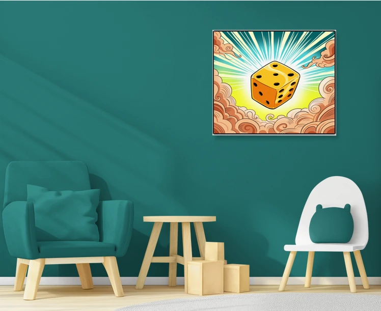 Game rooms and creative studios benefit from the triumphant energy and cel-shaded clarity of the central die. Additionally, the decorative cloud patterns provide visual weight that balances modern minimalist furniture arrangements.