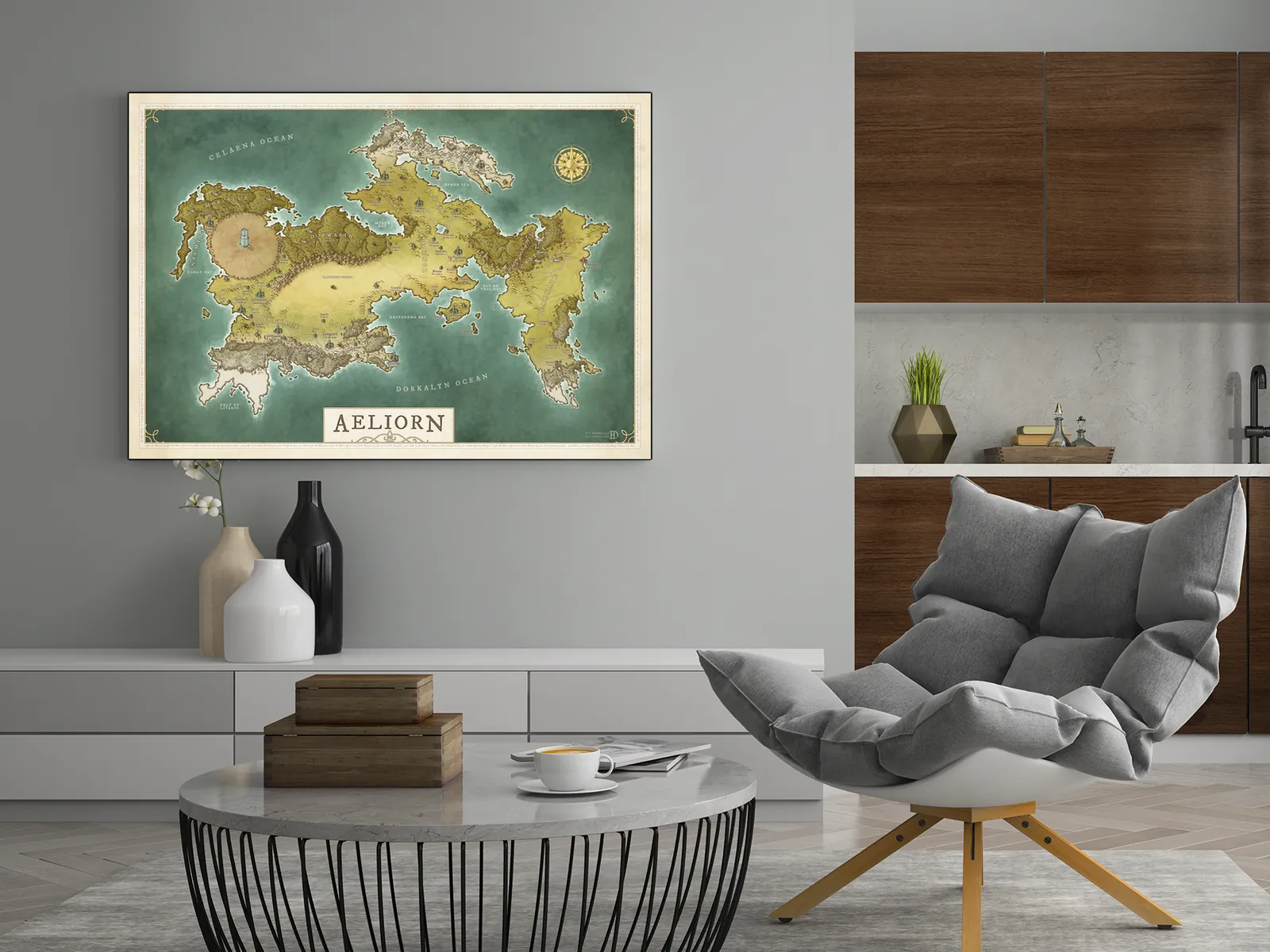 The Aeliorn Fantasy World Map presents a vast and interconnected realm shaped by oceans, continents, and distant frontiers. From sweeping coastlines to inland regions of plains and highlands, the geography establishes a strong sense of scale. As a result, the world feels cohesive and grounded, inviting exploration across lands bound together by trade, conflict, and discovery.