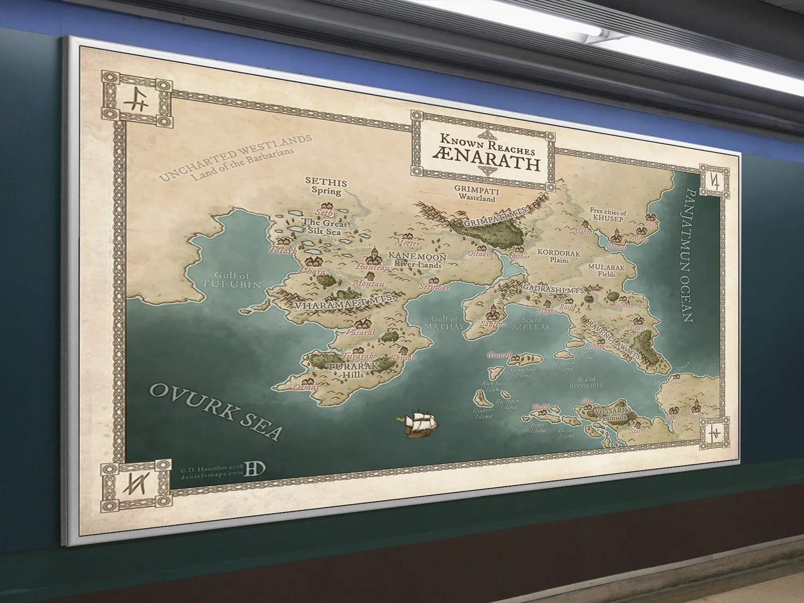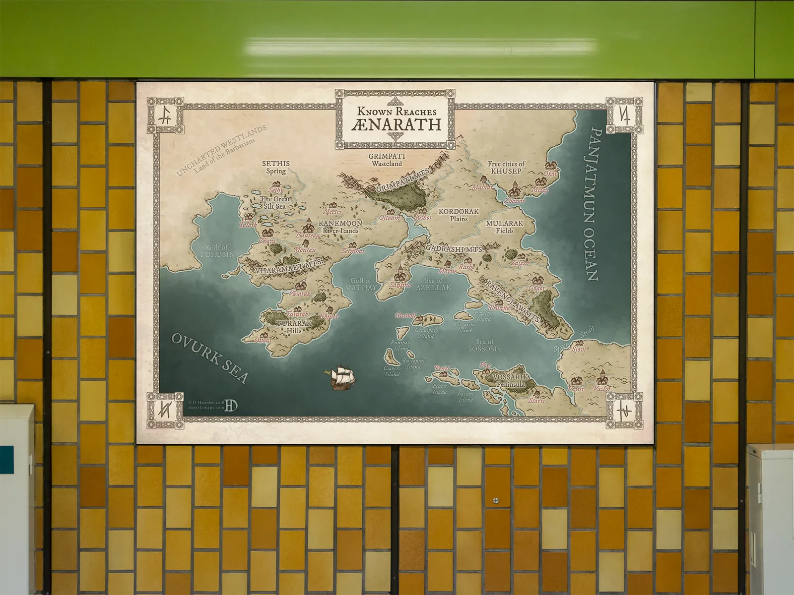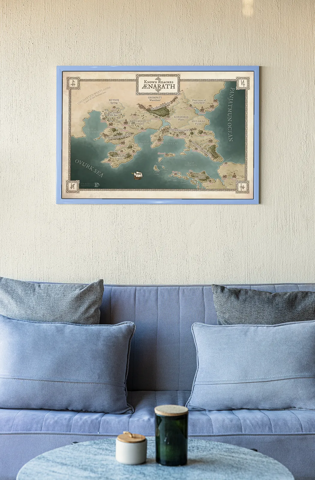 The Aenarath Known Reaches Fantasy Map presents a detailed view of a region shaped by coastlines, plains, mountains, and seas that connect distant cultures and powers. From fertile riverlands to harsh wastelands and island chains, the geography establishes clear boundaries and natural storylines. As a result, the region feels interconnected, purposeful, and alive with opportunity for travel and conflict.