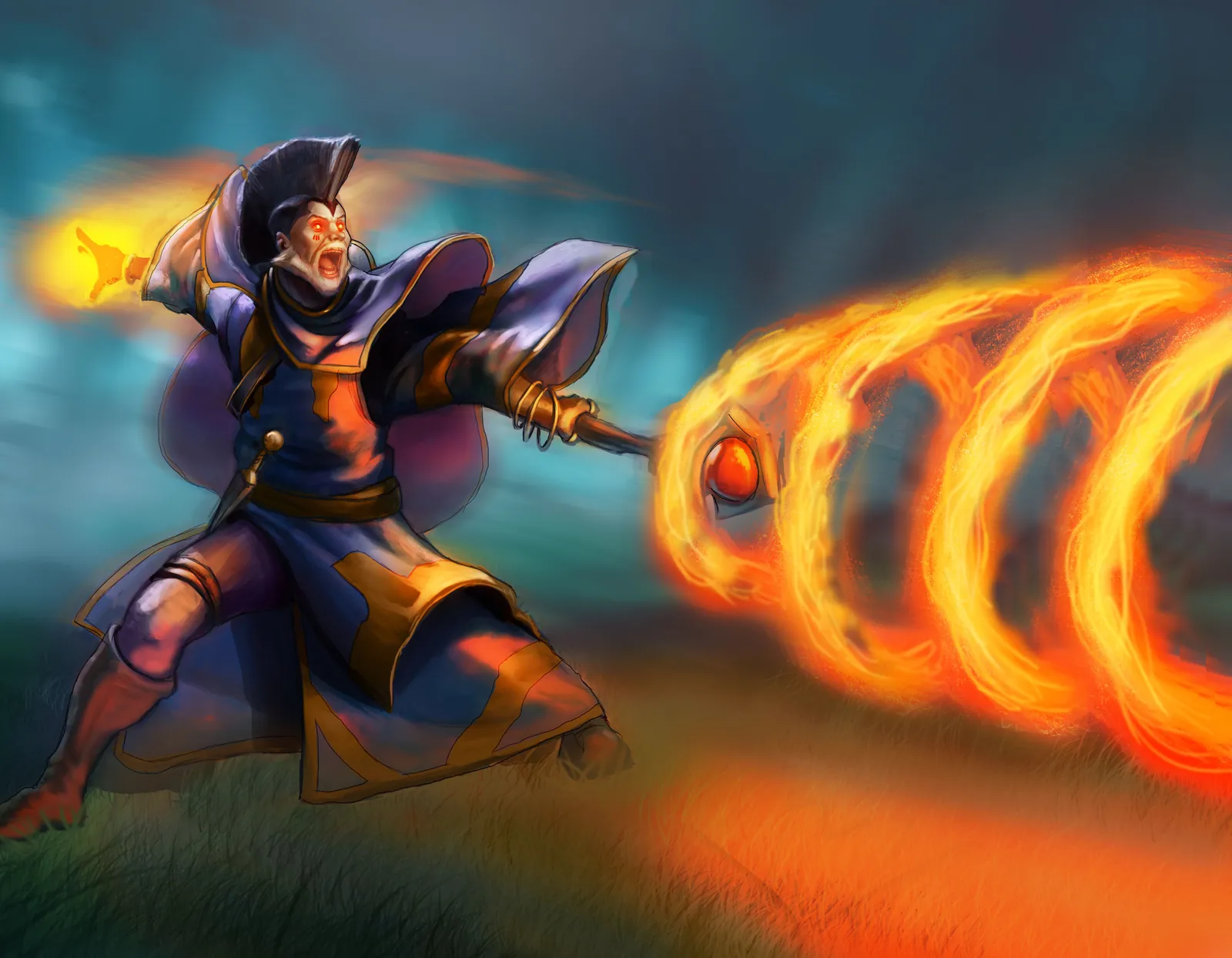 Moreover, the sweeping fire spiral reinforces speed and magical force. However, the strong silhouette keeps the character readable against the glowing backdrop. Consequently, the composition feels dynamic without becoming chaotic. Additionally, this piece reflects the tone of Smunchy Games settings through visual storytelling rather than written lore.