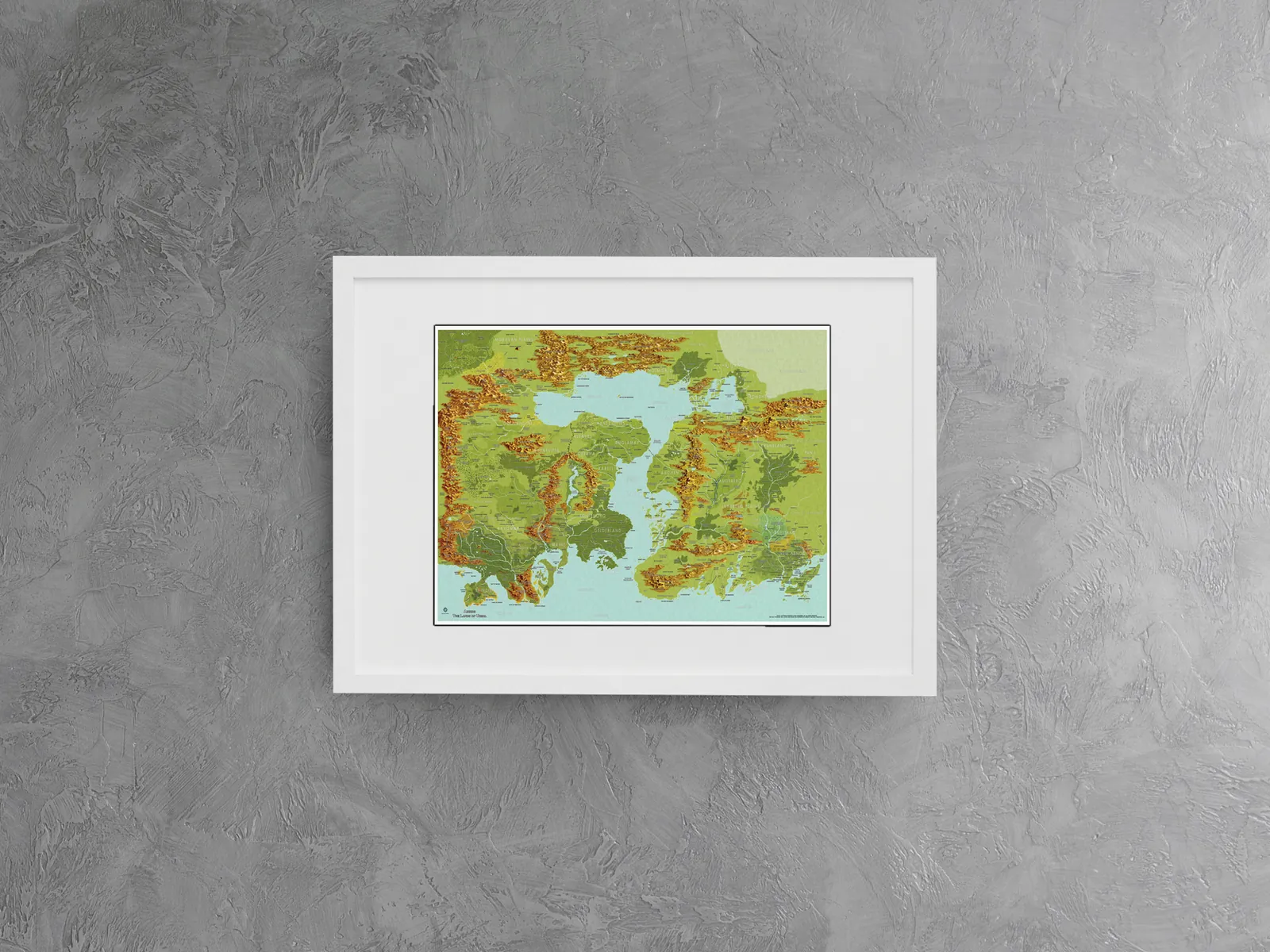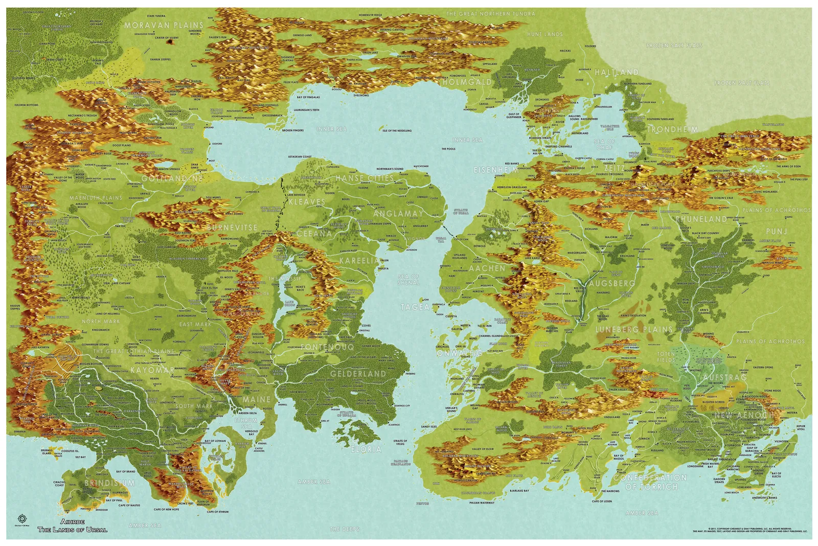 Airhde – Cradle of the World depicts a vast fantasy setting centered on an inland sea surrounded by diverse regions, kingdoms, and natural boundaries. The continental layout emphasizes scale and balance, creating a believable world framework that supports long-form campaigns and expansive storytelling. As a result, the map establishes a clear sense of geography while leaving room for discovery.