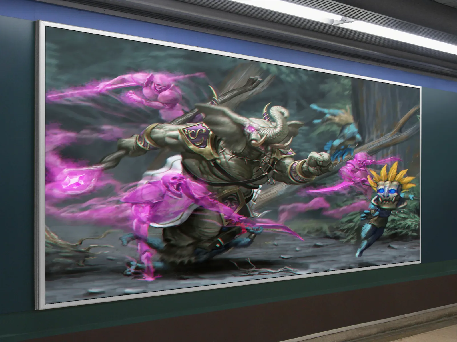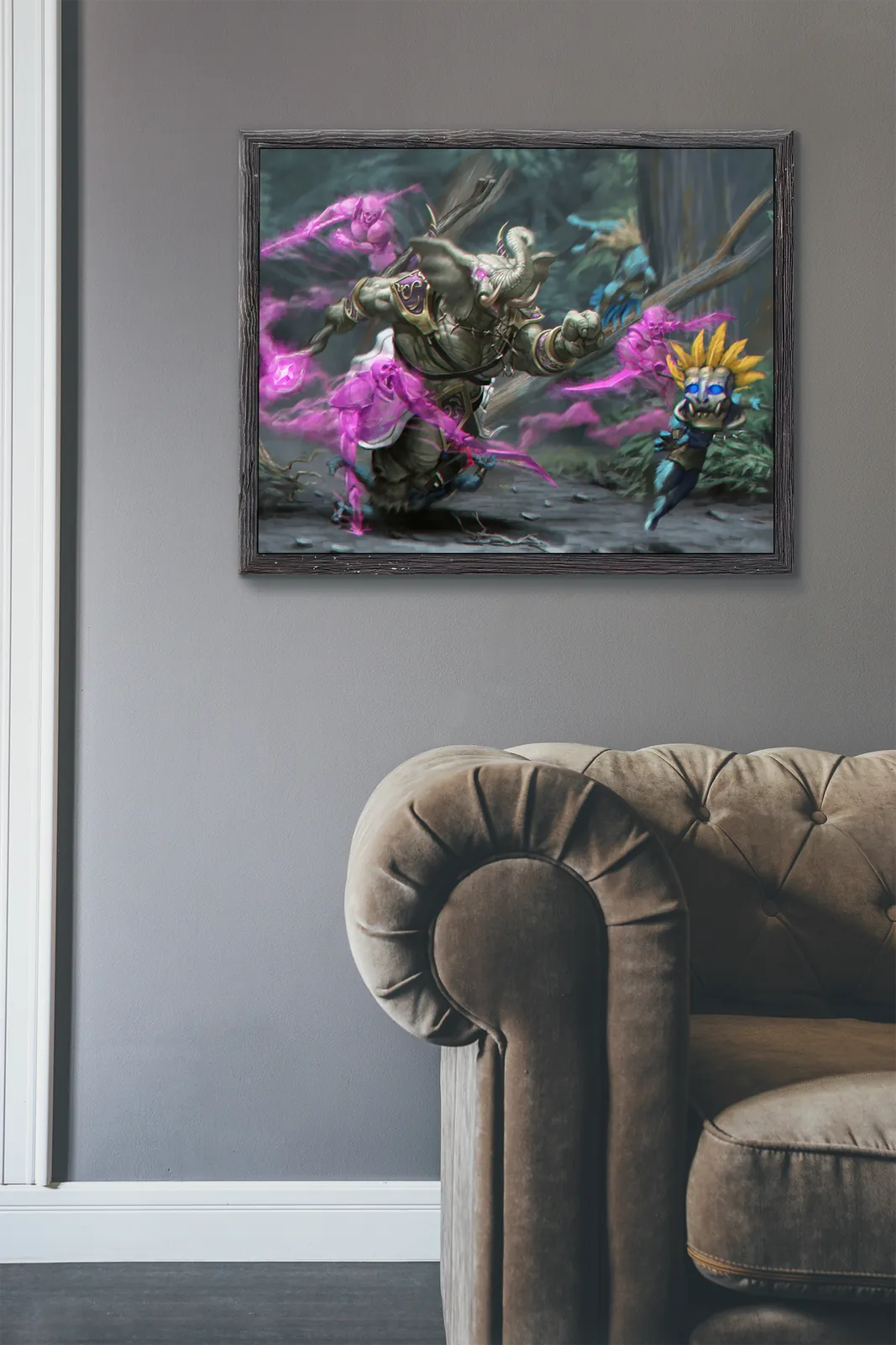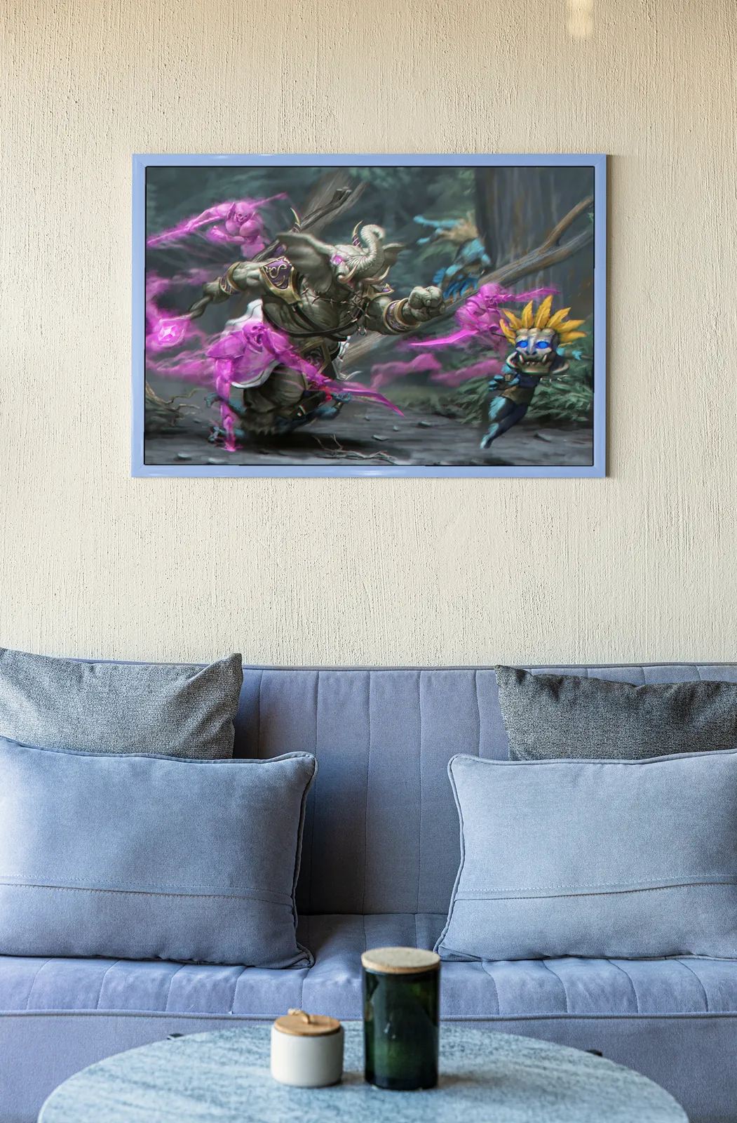Finally, this art on canvas is produced for dramatic wall presence and durability. Therefore, ethereal color effects, muscular detail, and kinetic motion remain vivid at display sizes. Above all, Akkenta canvas art functions as collectible wall art and a striking centerpiece for fans of aggressive, character-driven fantasy combat.