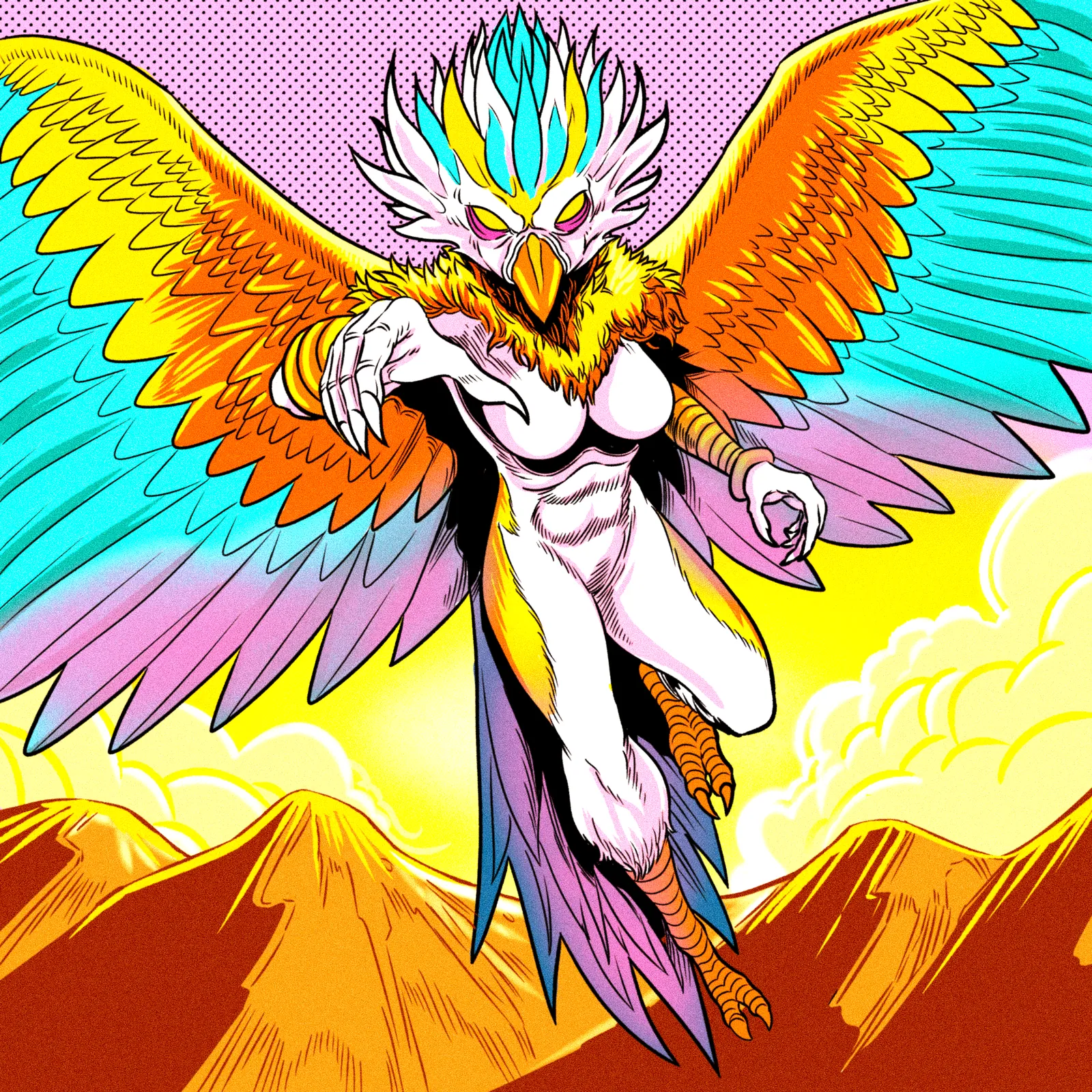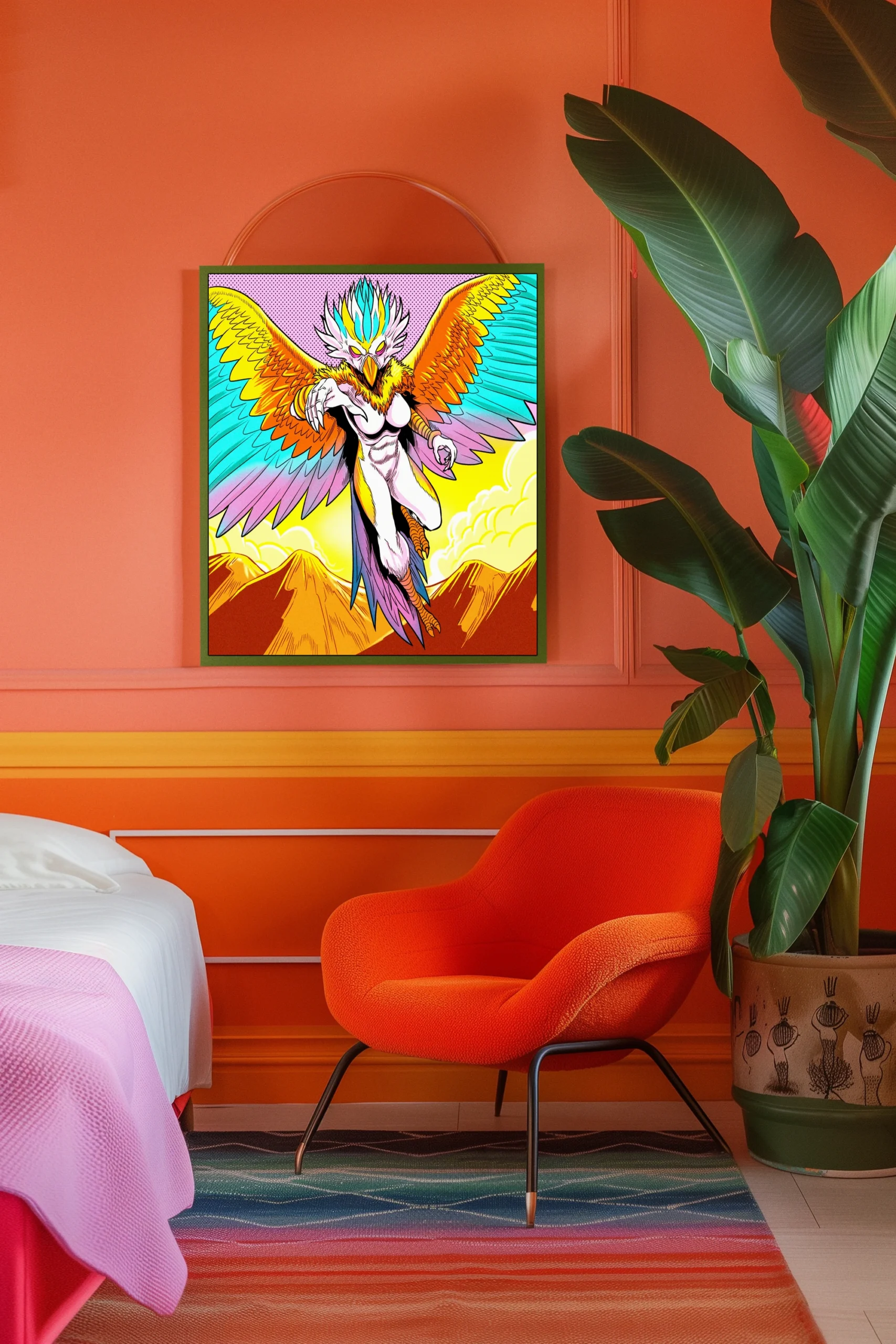 Additionally, bold black outlines define every feather and muscle against bright yellow sky. Halftone magenta dots pattern the background in retro pop art fashion. Moreover, the pale torso contrasts sharply with orange talons and flame-shaped head plumage.