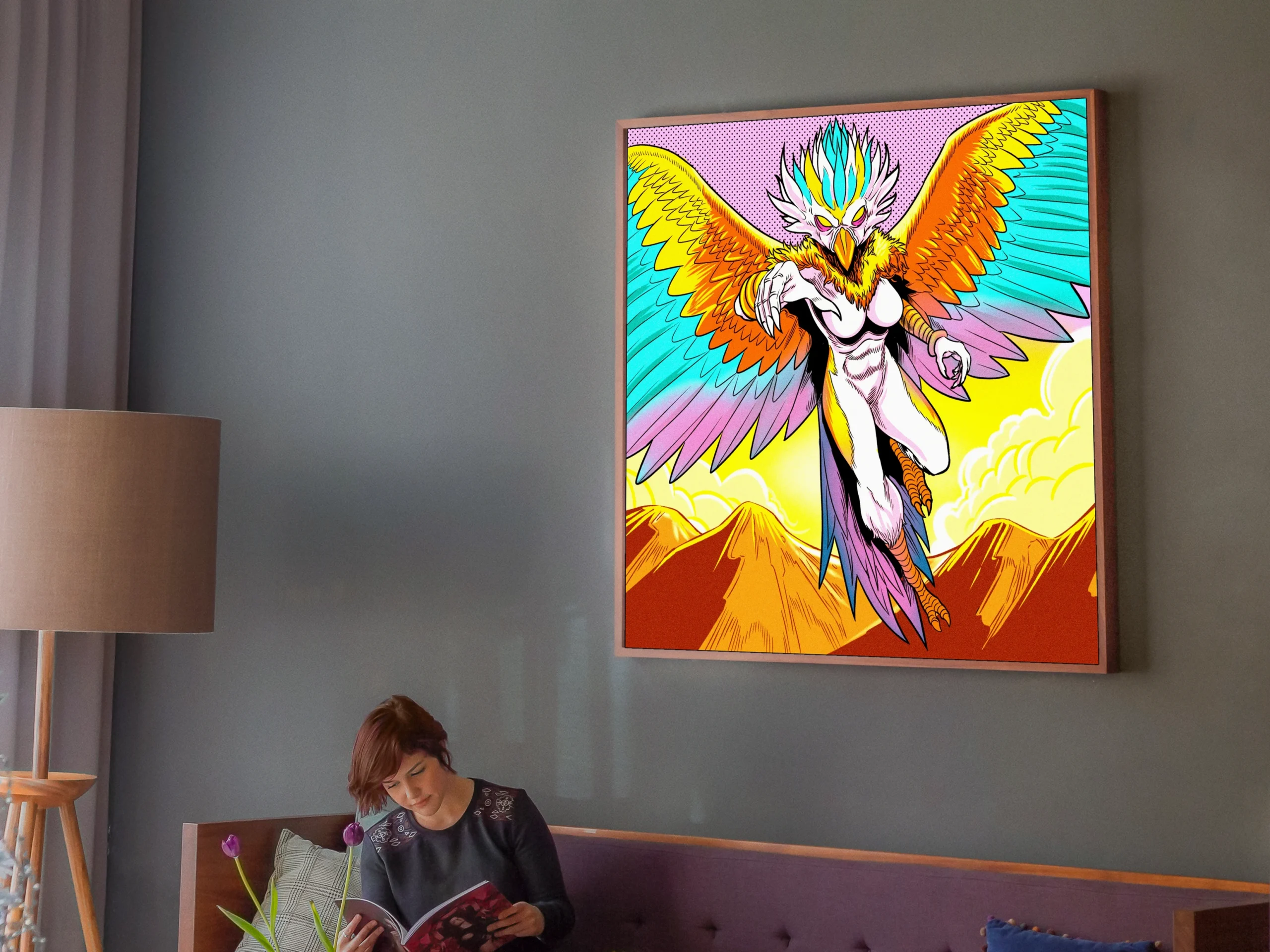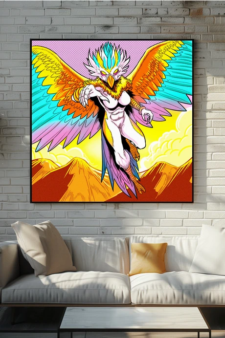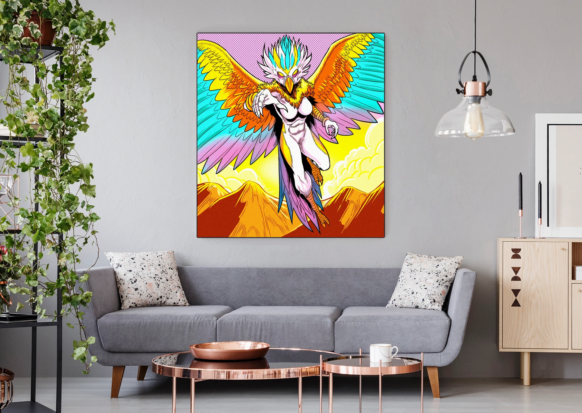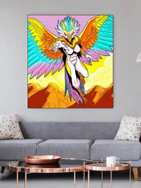 A humanoid bird creature spreads massive wings in full display posture. This alkonost art trading card art canvas print captures Fabricio Vainer’s comic book illustration style. Notably, the cyan-to-purple wing gradient spans the entire composition width.