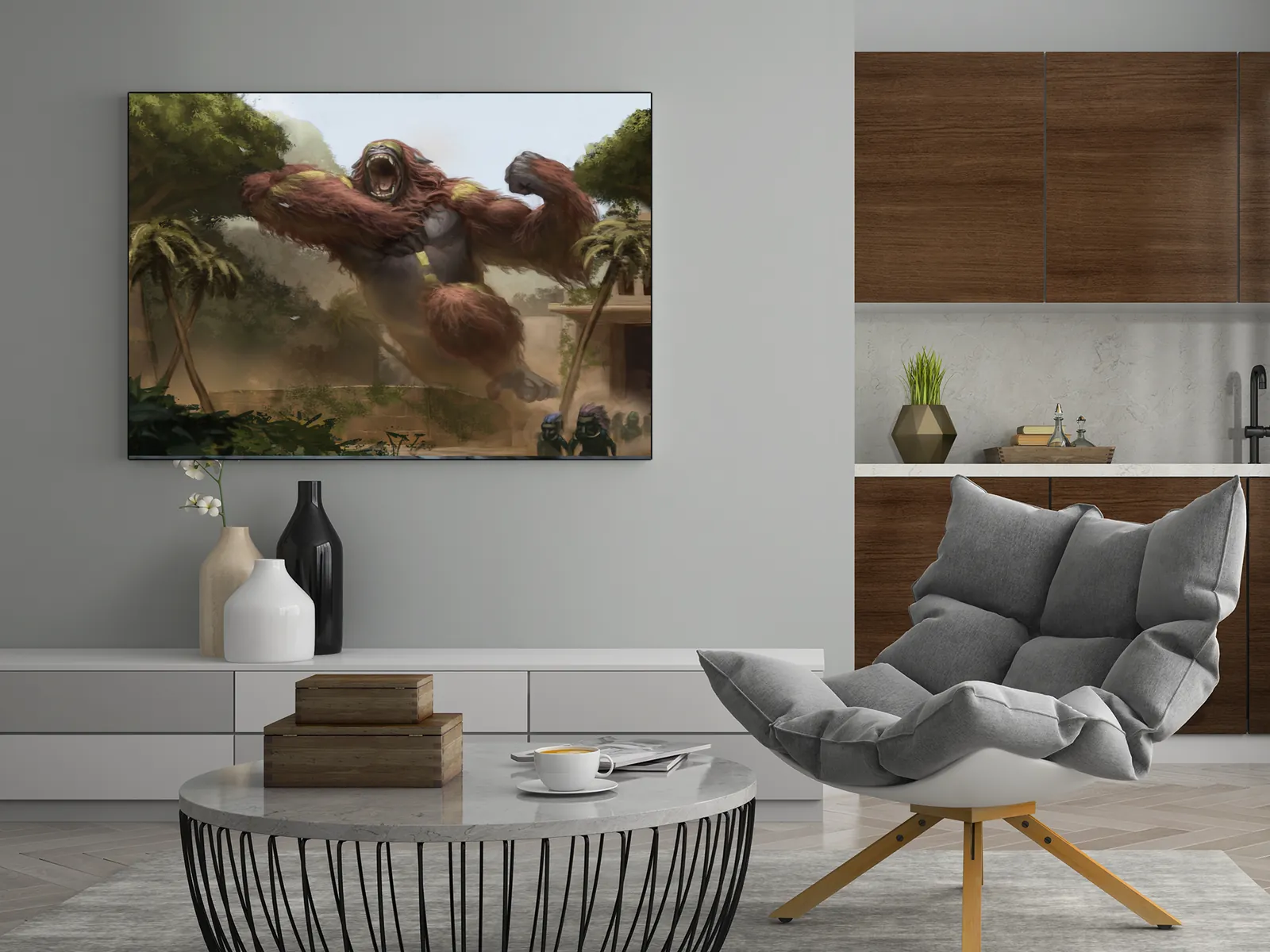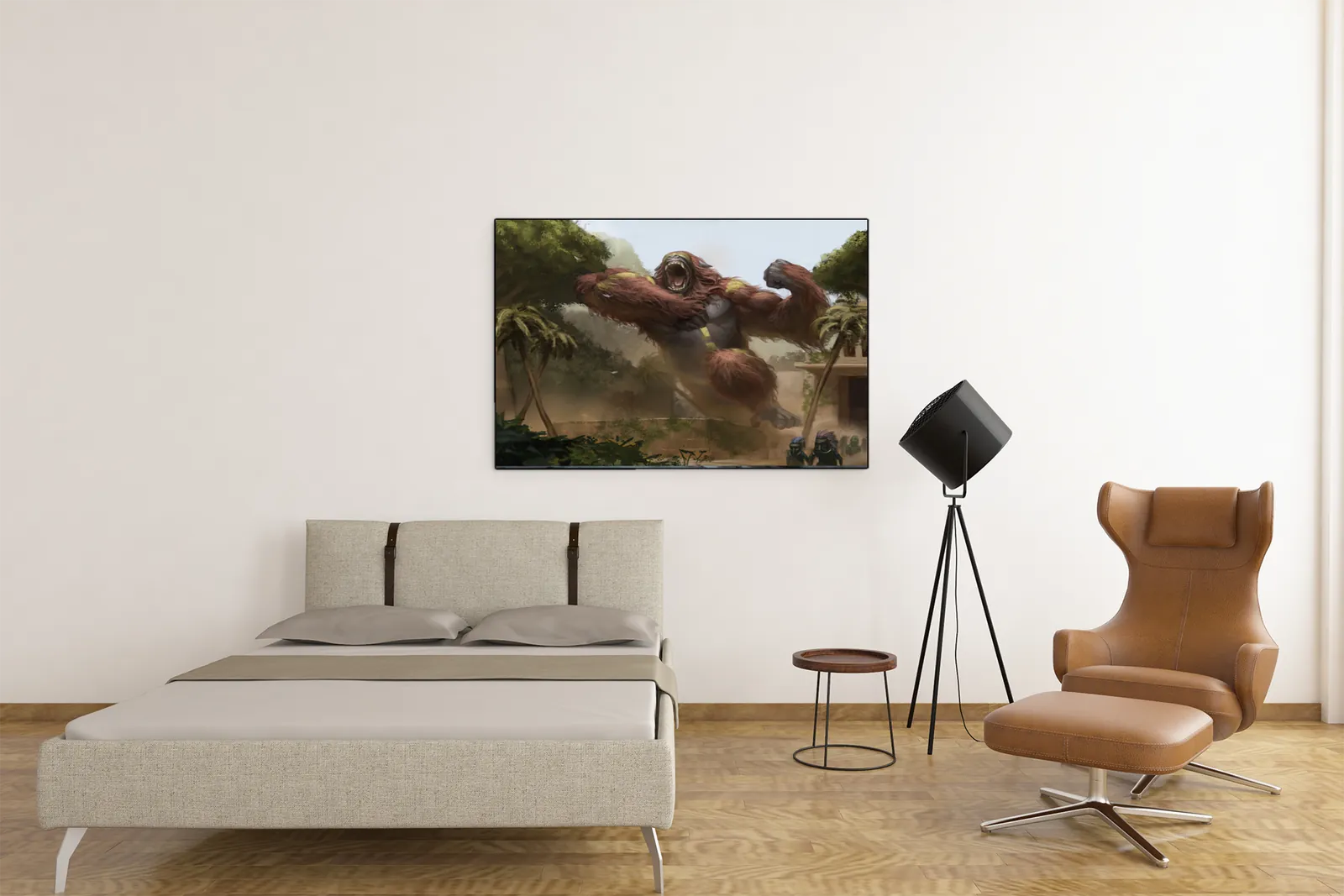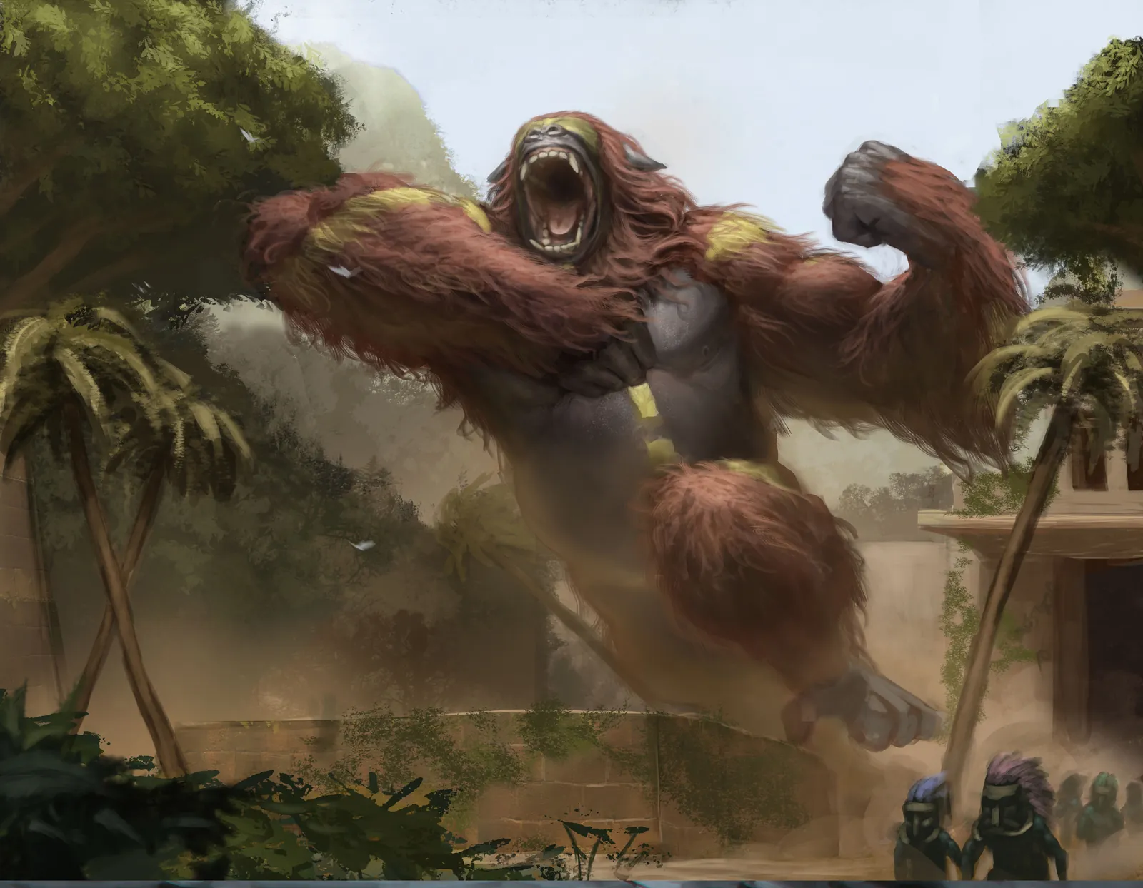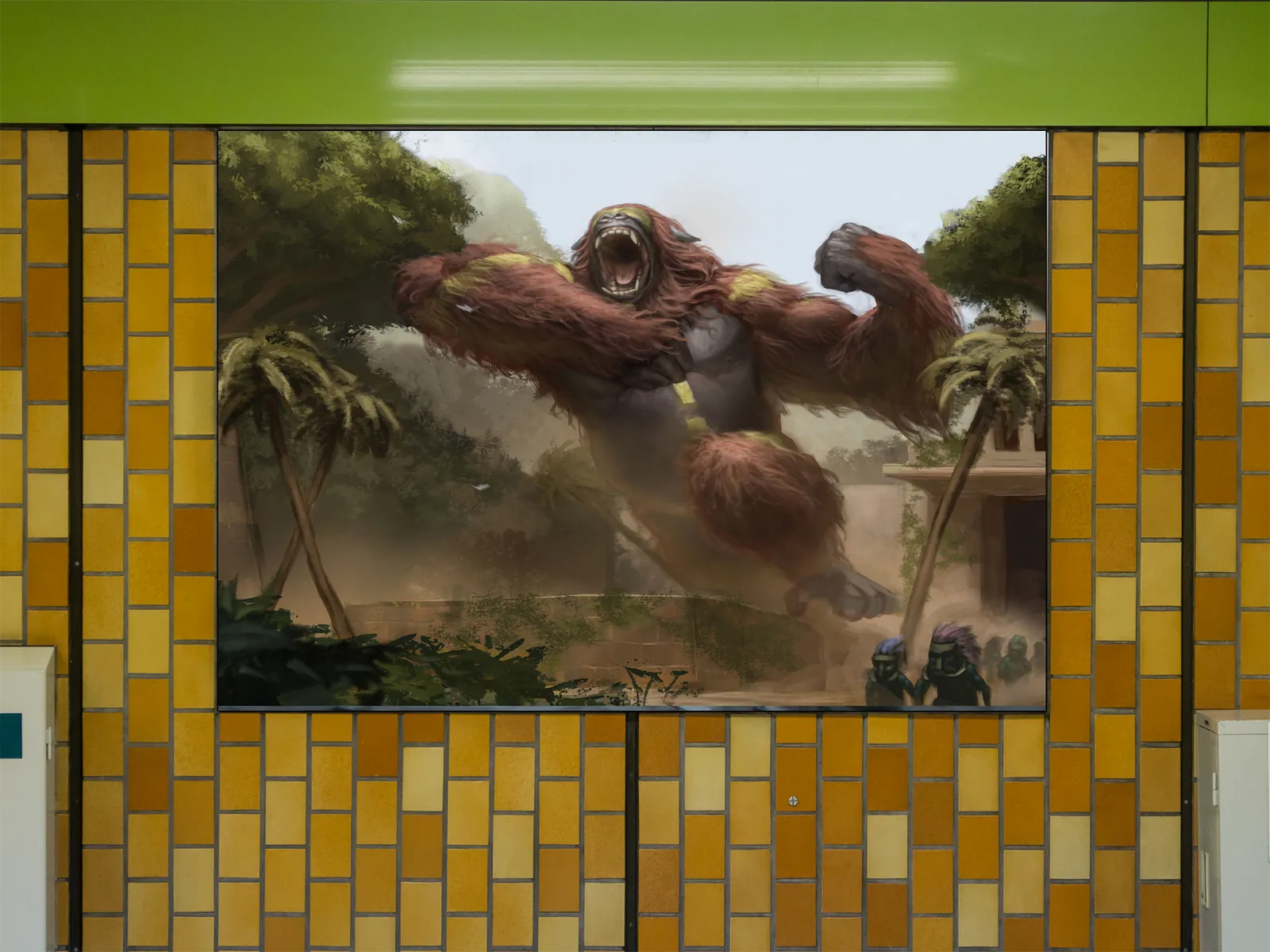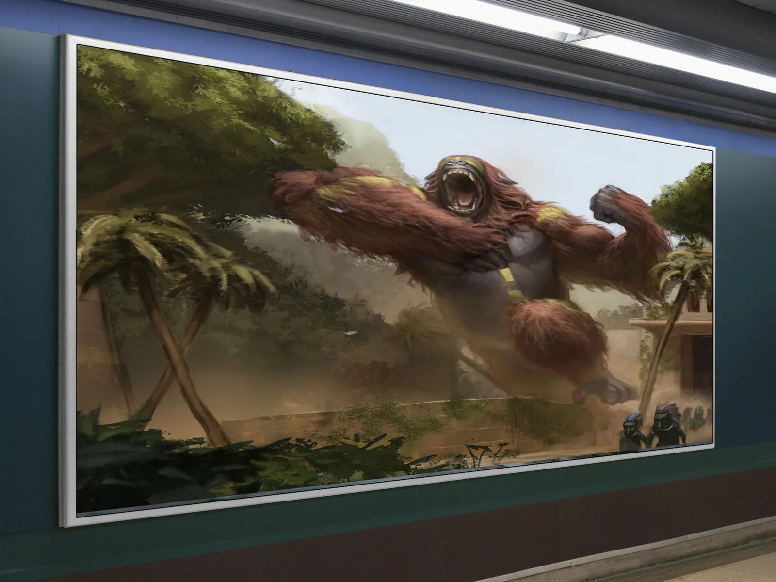 Alpha Blind Screamer wall art captures a colossal creature mid-leap as raw muscle and rage explode across a ruined jungle settlement. From the first glance, the scale feels overwhelming. As a result, panic, power, and motion dominate the scene.