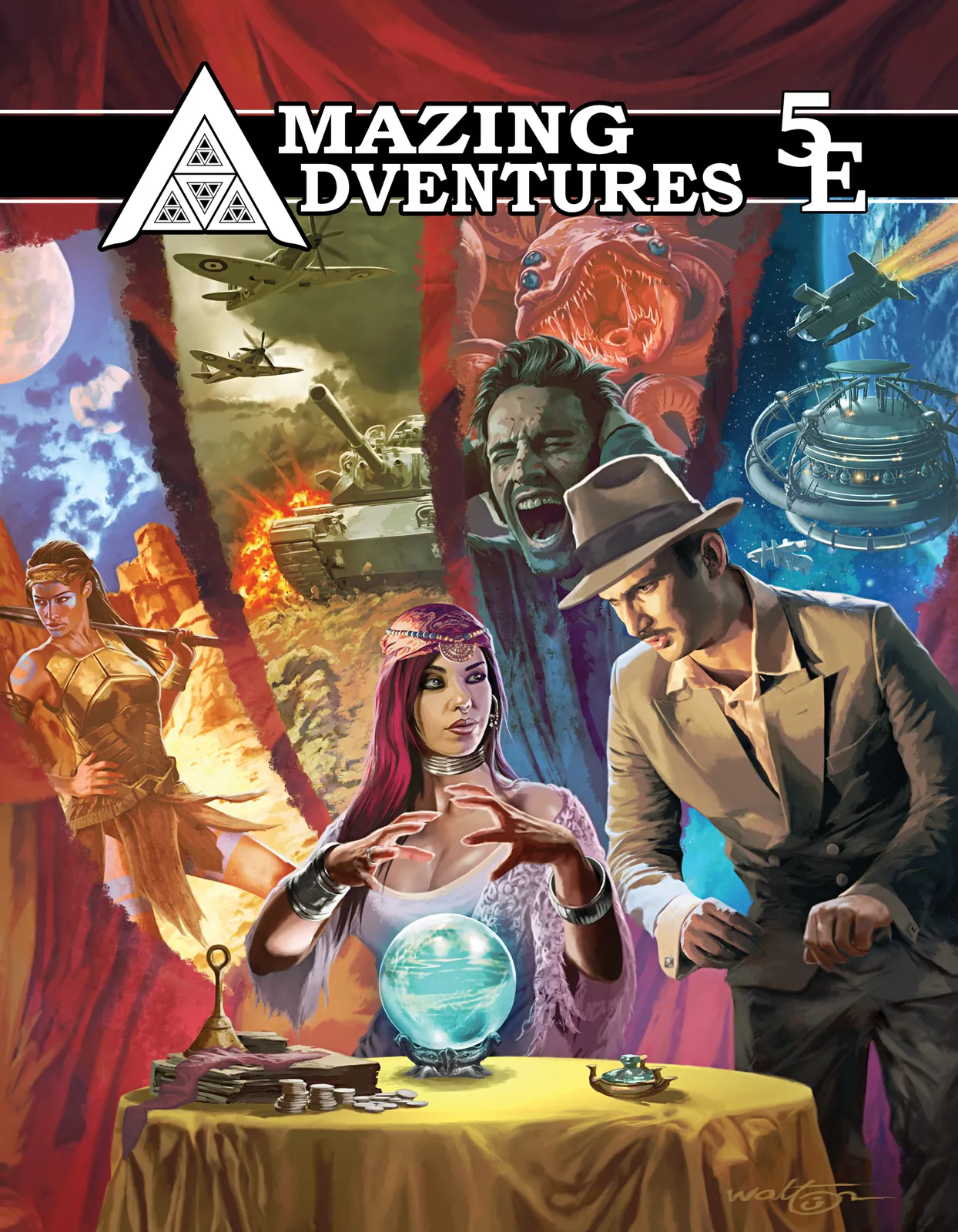 Amazing Adventures Cover Art captures the pulp-inspired energy of classic adventure storytelling, blending occult mystery, daring heroes, and cinematic action into a single dramatic scene. At the center, a fortune teller peers into the unknown while investigators and explorers confront dangers that span war, science fiction, and the supernatural. As a result, the artwork evokes suspense, curiosity, and high-stakes adventure.
