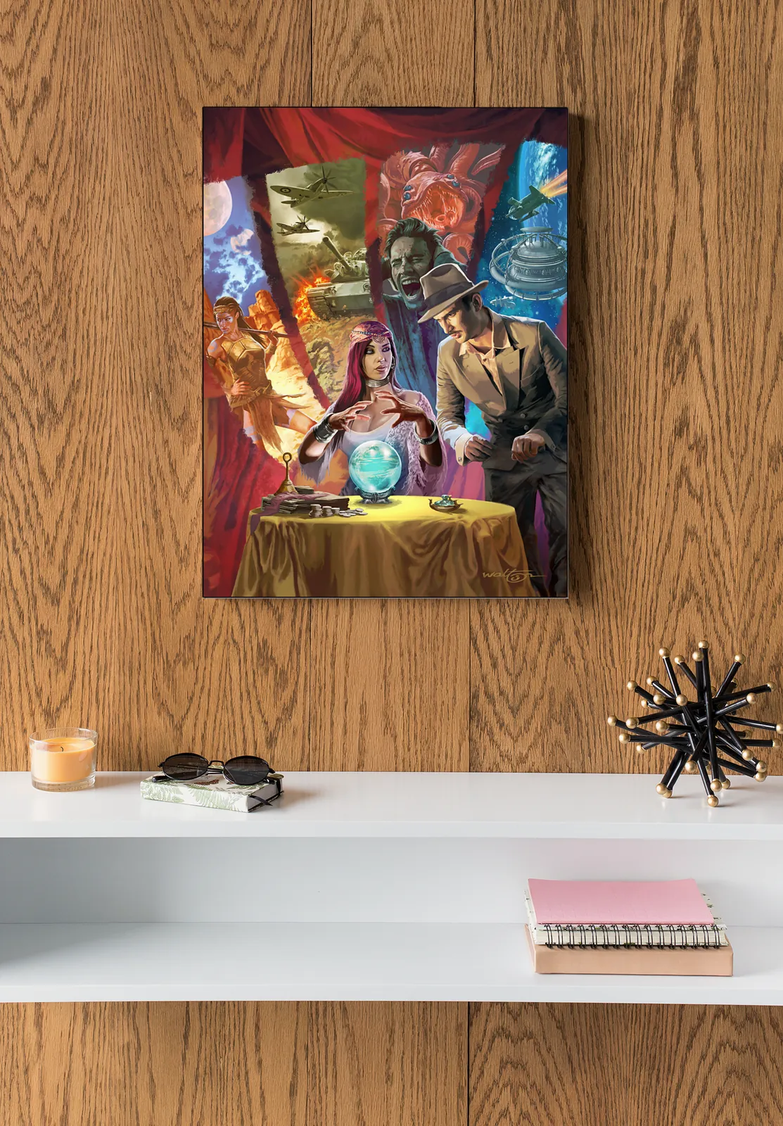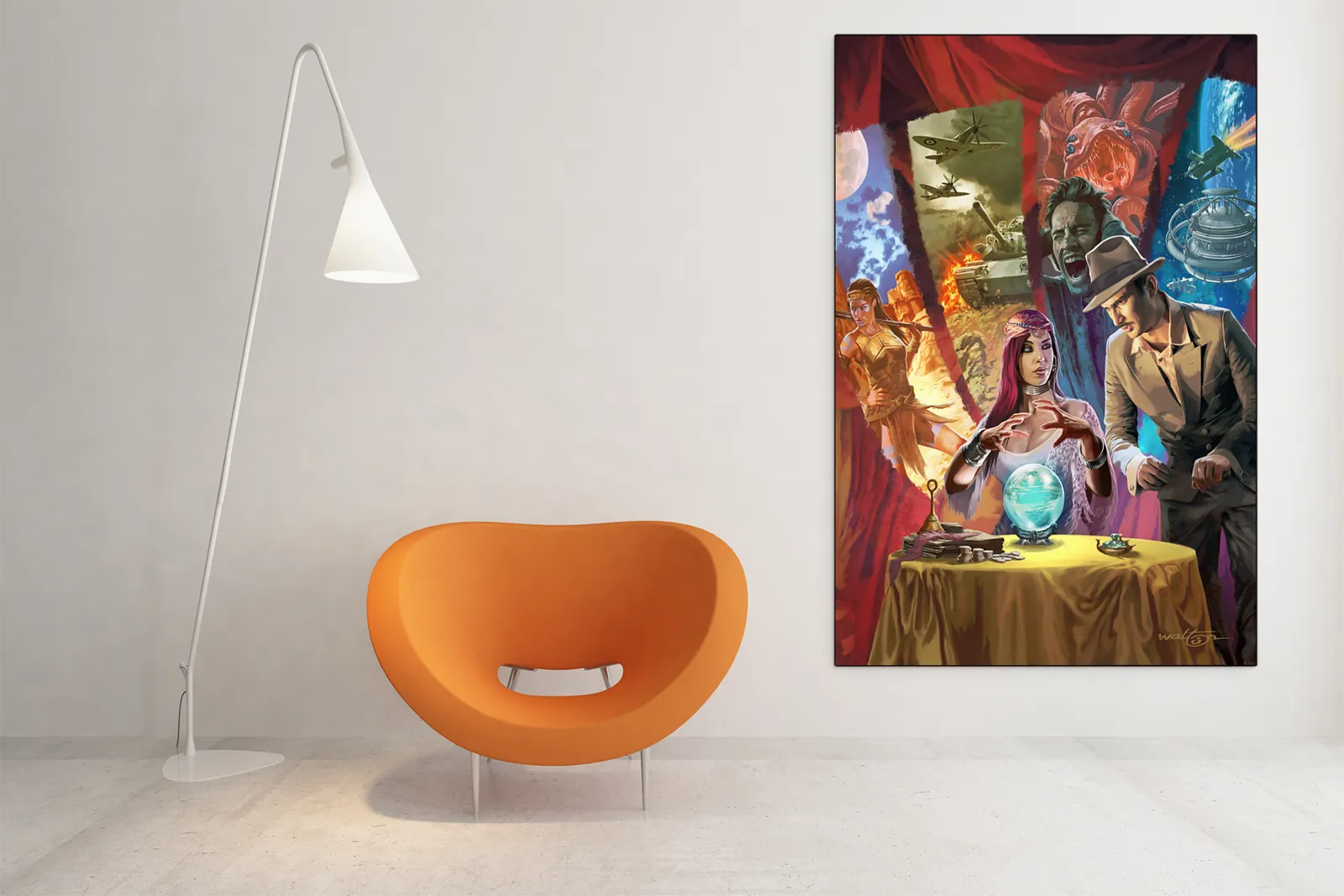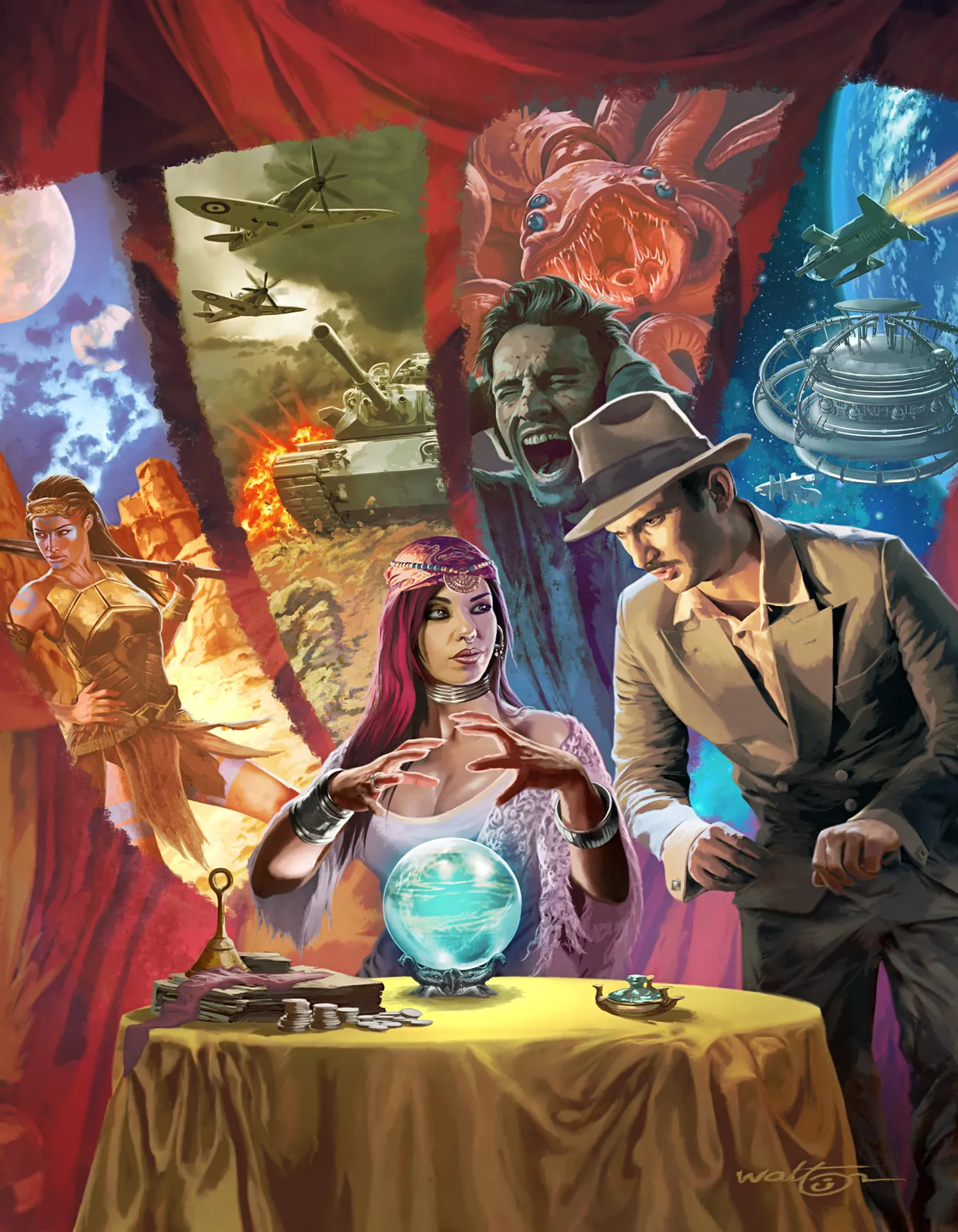Amazing Adventures Illustration captures the high-energy spirit of pulp fantasy and genre-spanning adventure, blending occult mystery, wartime action, and science-fiction spectacle into a single dramatic composition. At the center, a fortune teller peers into the unknown while investigators, warriors, and monsters collide across fractured realities. As a result, the artwork immediately conveys danger, curiosity, and bold imagination.
