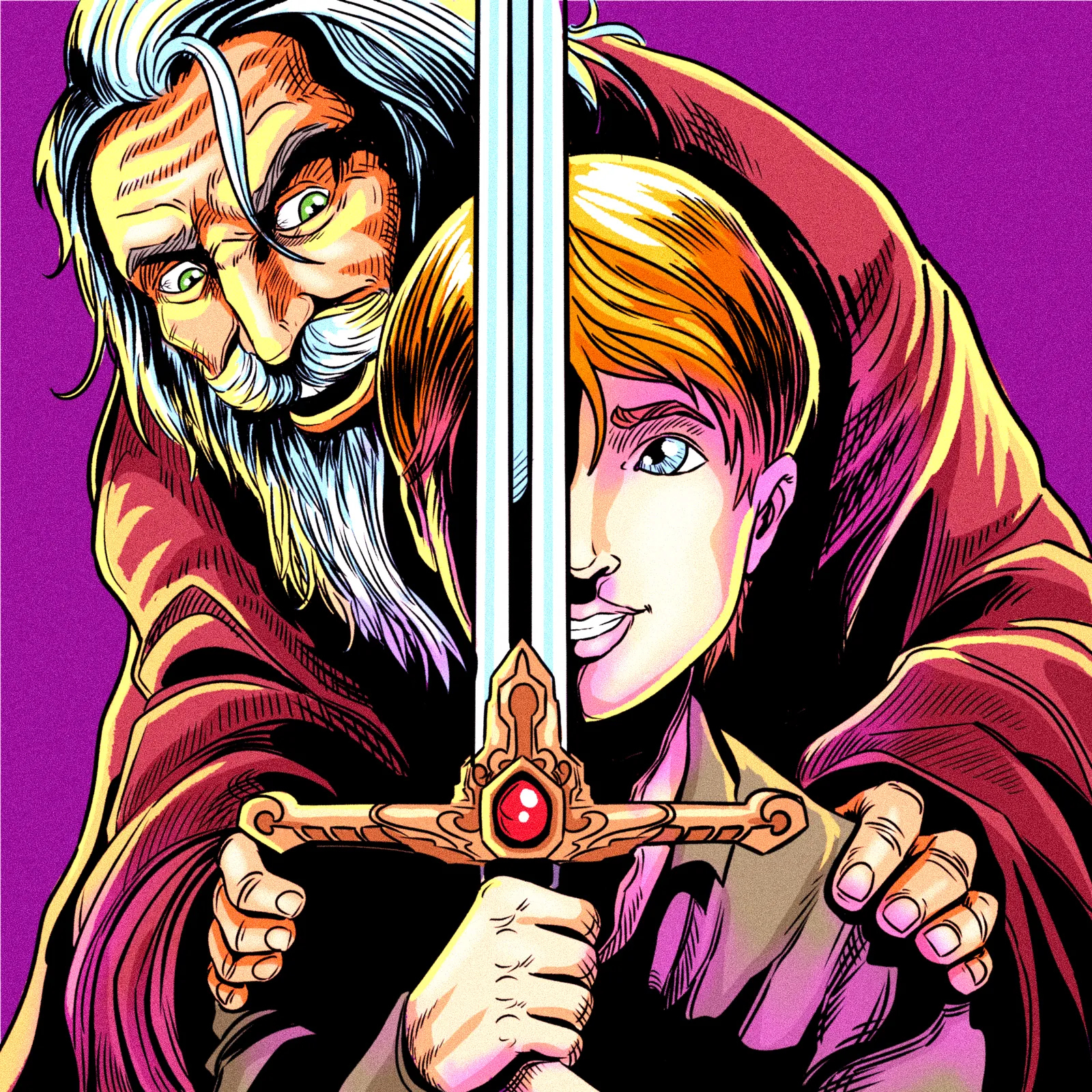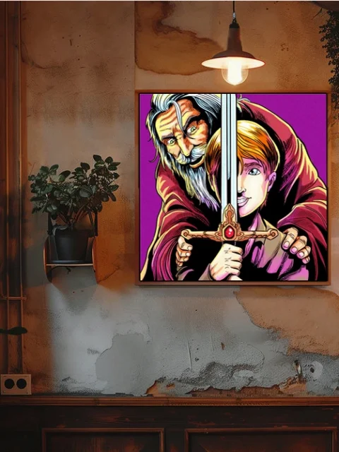 Additionally, the magenta-purple background creates dramatic contrast against burgundy and maroon robes. The sword’s metallic surface reflects cool light between the warm earth tones of the figures. Moreover, detailed facial rendering shows the elder’s green eyes and the youth’s blue gaze.