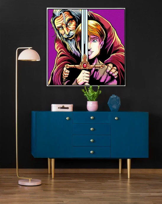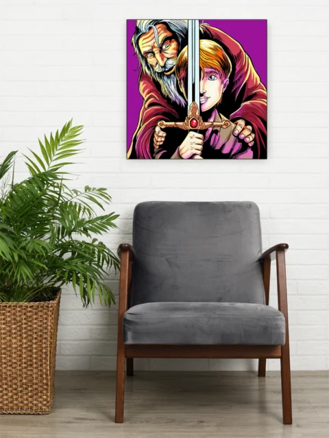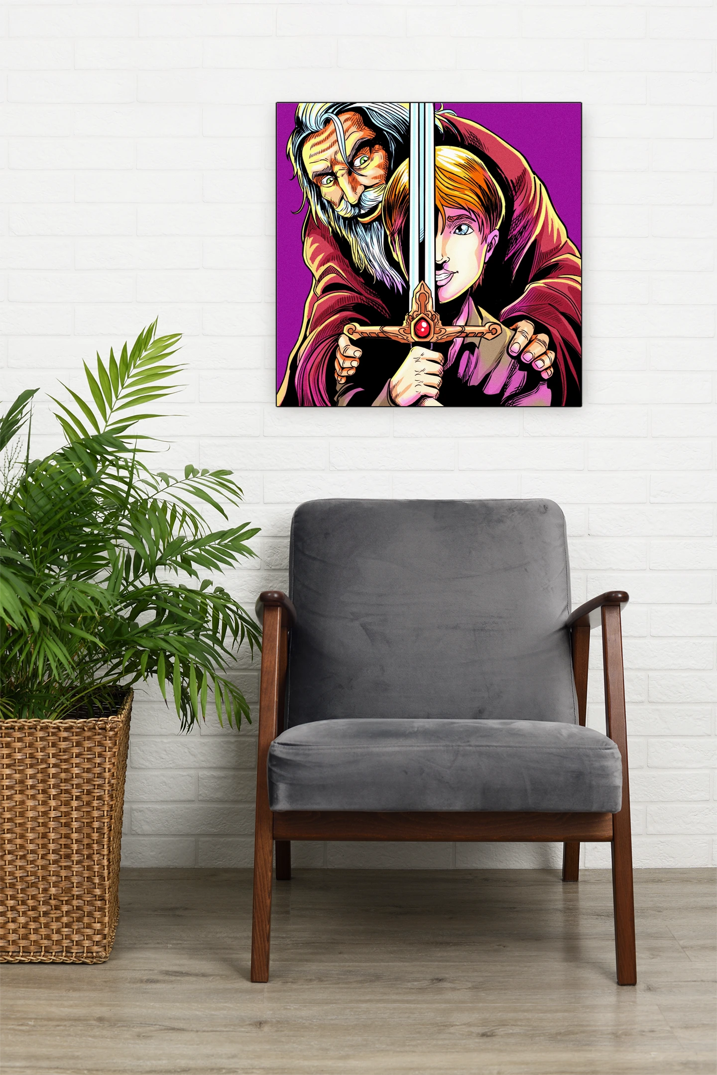 An elderly wizard and copper-haired youth flank a gleaming silver blade. This ancestral sword art trading card art canvas print captures Fabricio Vainer’s bold linework and cross-hatching technique. The red gemstone in the bronze crossguard notably anchors the vertical composition.