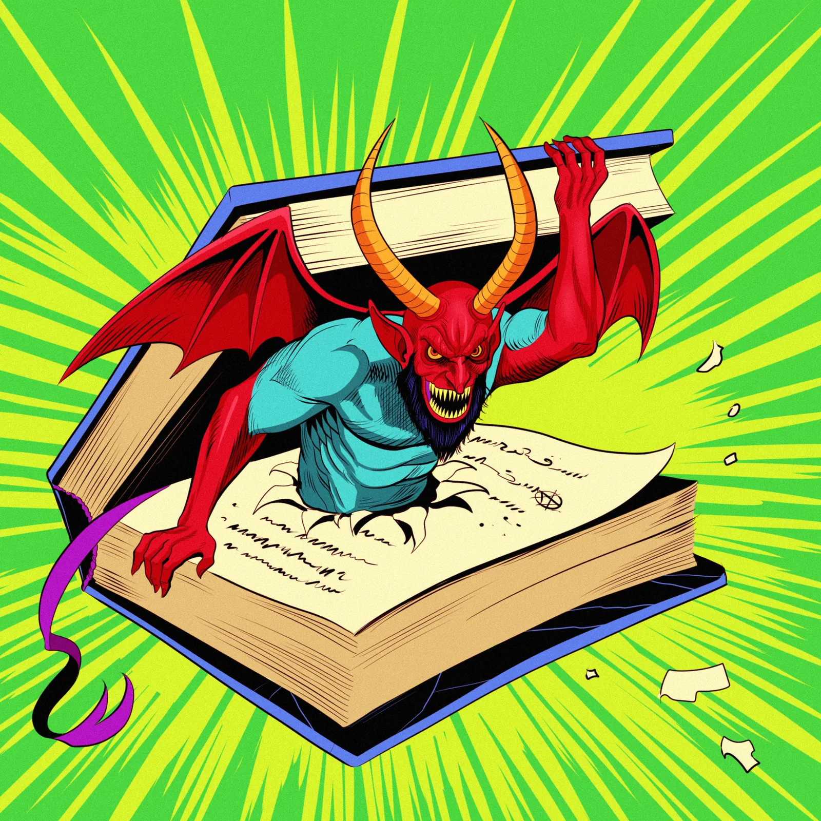 Additionally, the color palette shifts from saturated green edges to bright yellow-green bursts behind the demon’s bat-like wings. The teal torso contrasts sharply with crimson skin and the cream-colored book pages below. Moreover, thick black outlines and halftone shading create vintage comic book texture throughout.
