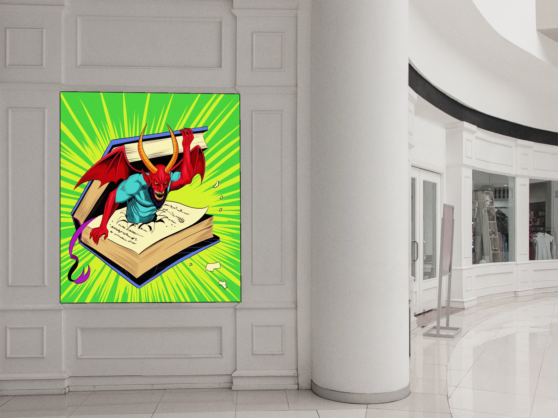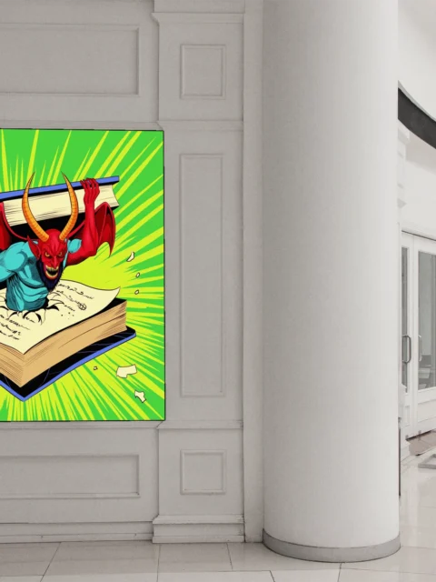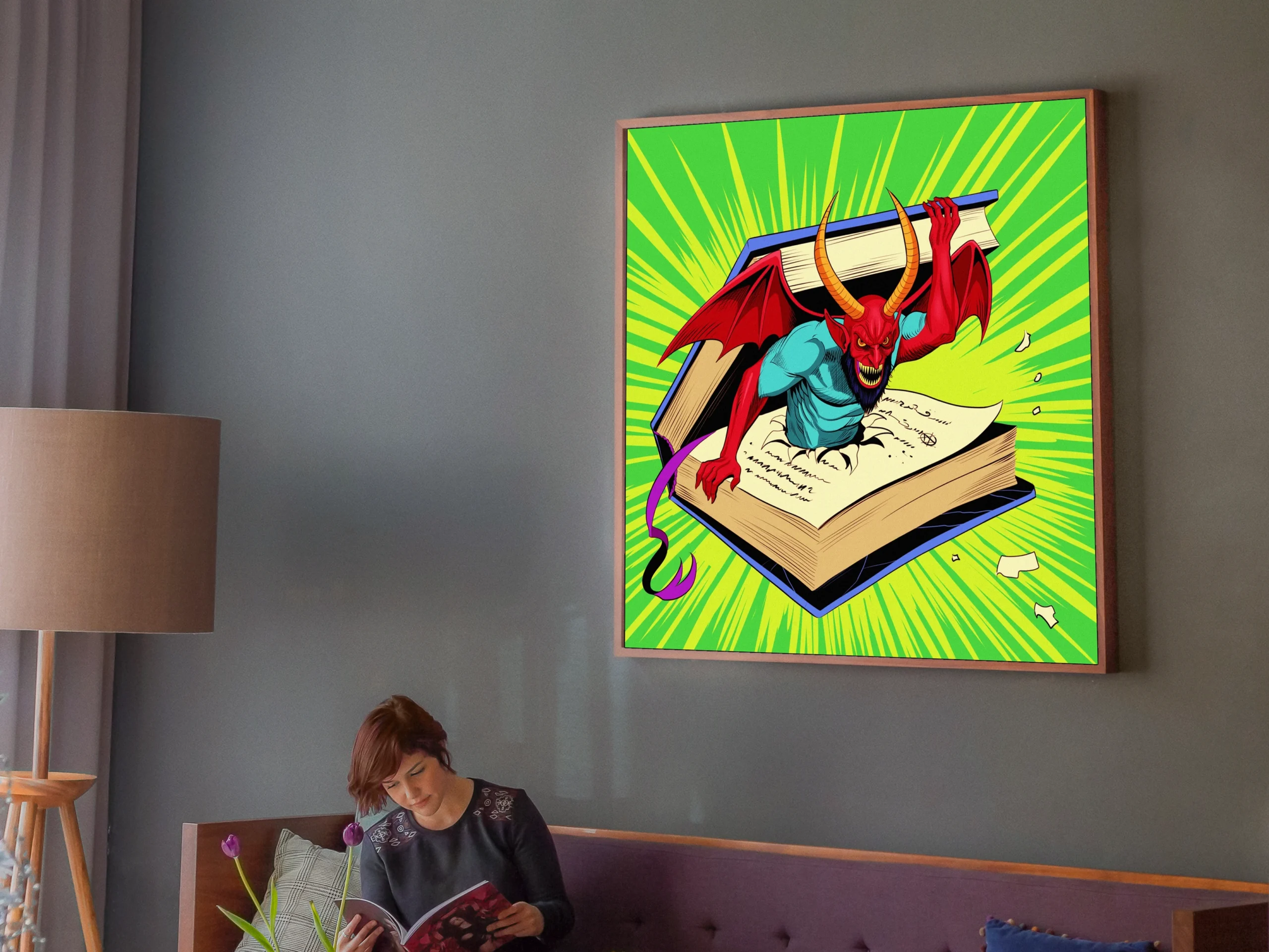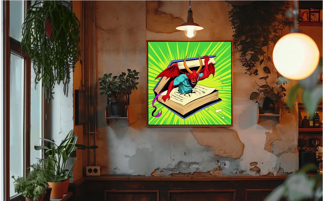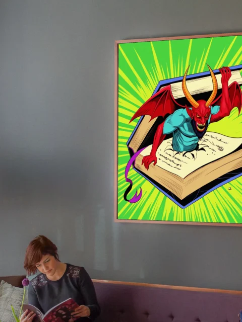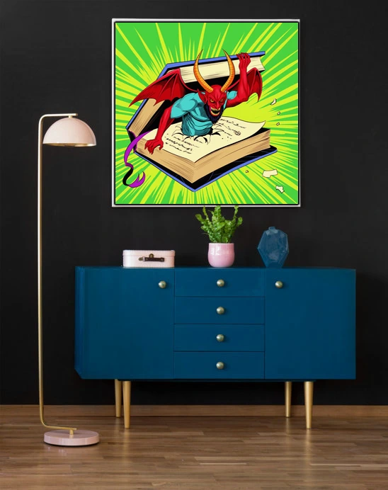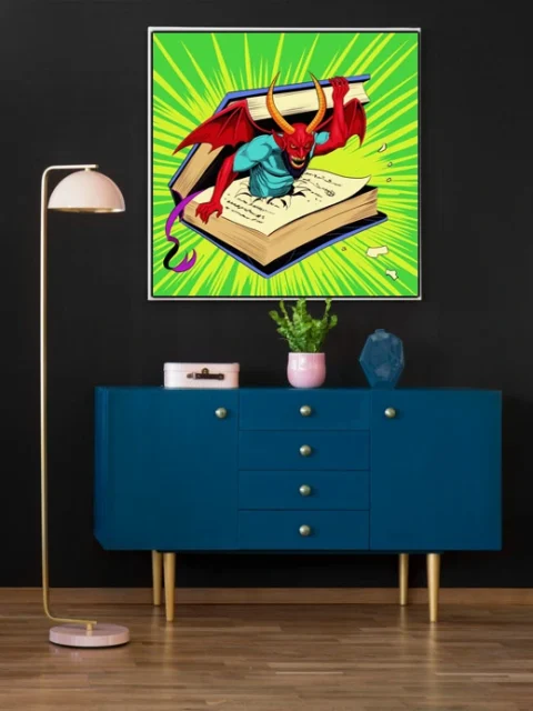 Display in game rooms where the campy menace and retro comic aesthetic complement fantasy collections. Additionally, the piece works particularly well alongside other demon or occult-themed artwork.