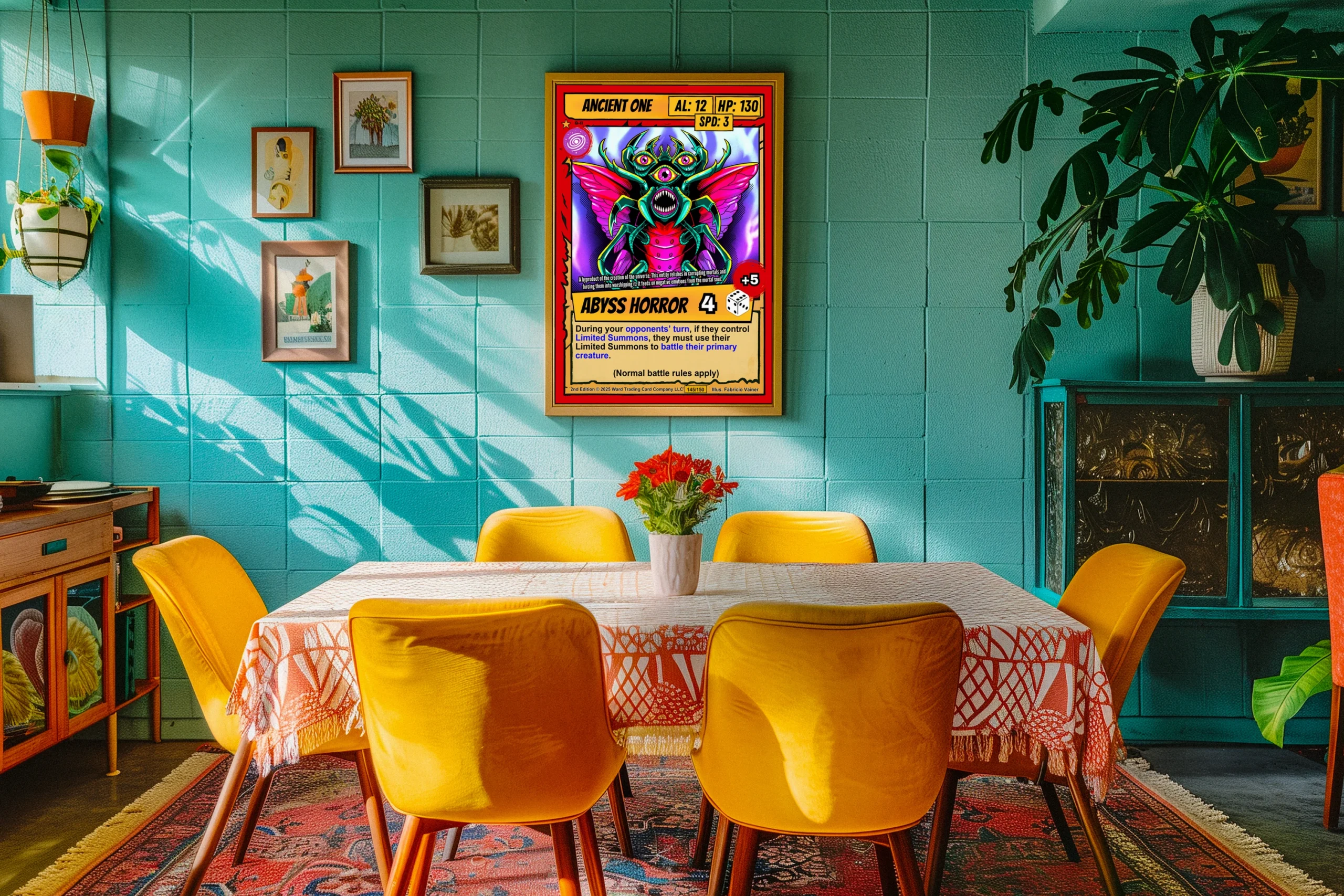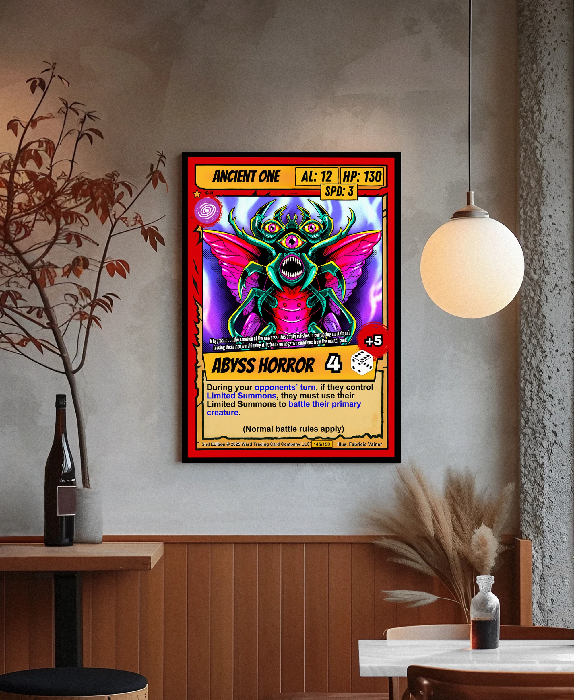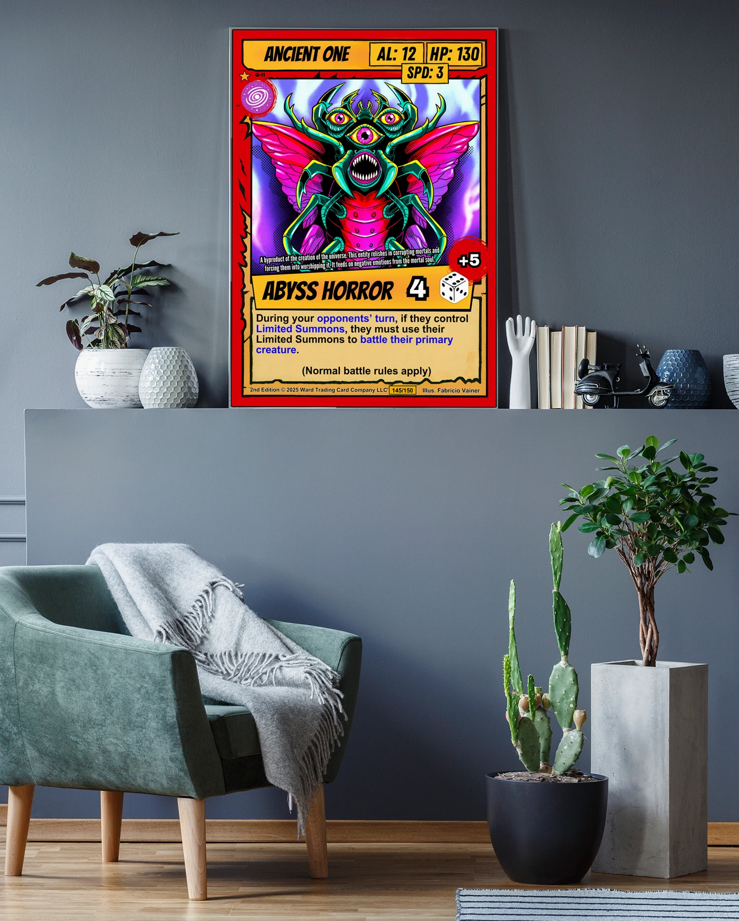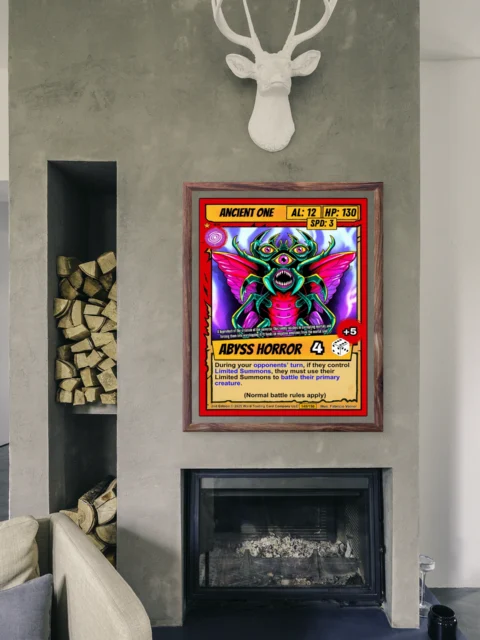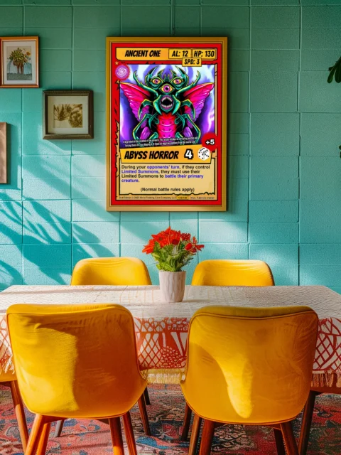At room scale, the Abyss Horror title banner and attack modifiers remain clearly legible. This ancient one trading card canvas print appeals to Ward collectors who want their rarest pulls displayed permanently. The cel-shaded illustration style echoes 1990s comic book aesthetics and classic TCG artwork.