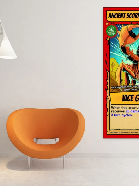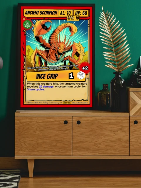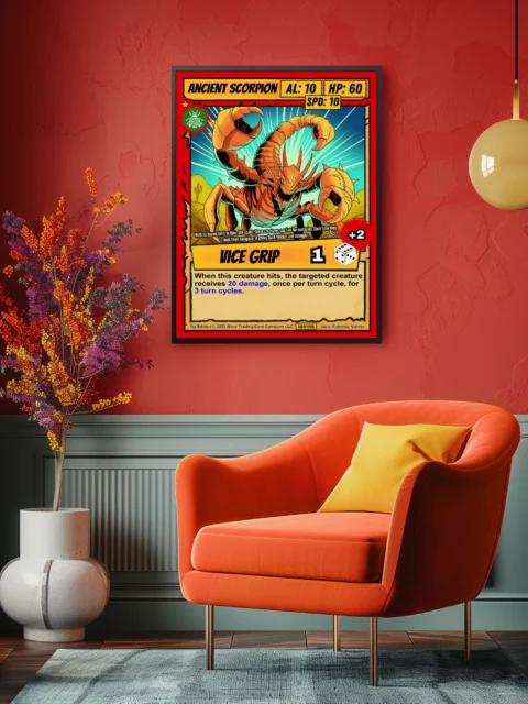 At display scale, the ancient scorpion trading card canvas print becomes an impressive focal point. The bright red border and desert silhouettes create bold visual contrast. Museum-quality canvas preserves every detail from green emblem to parchment texture.