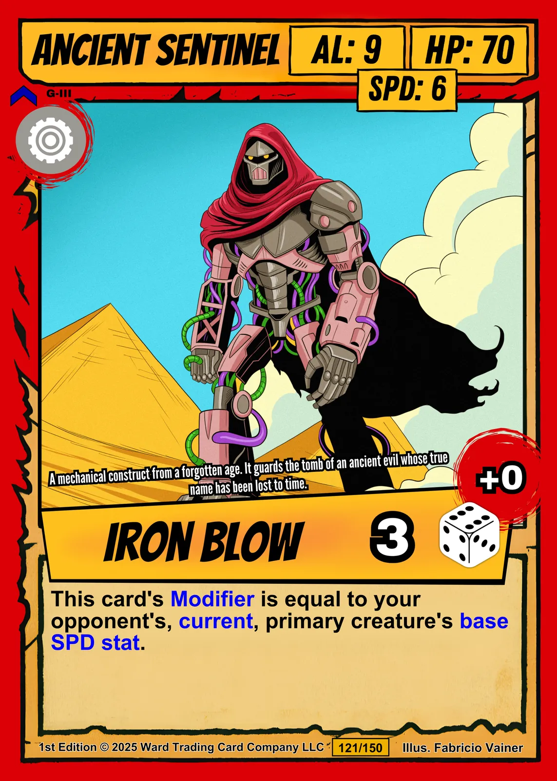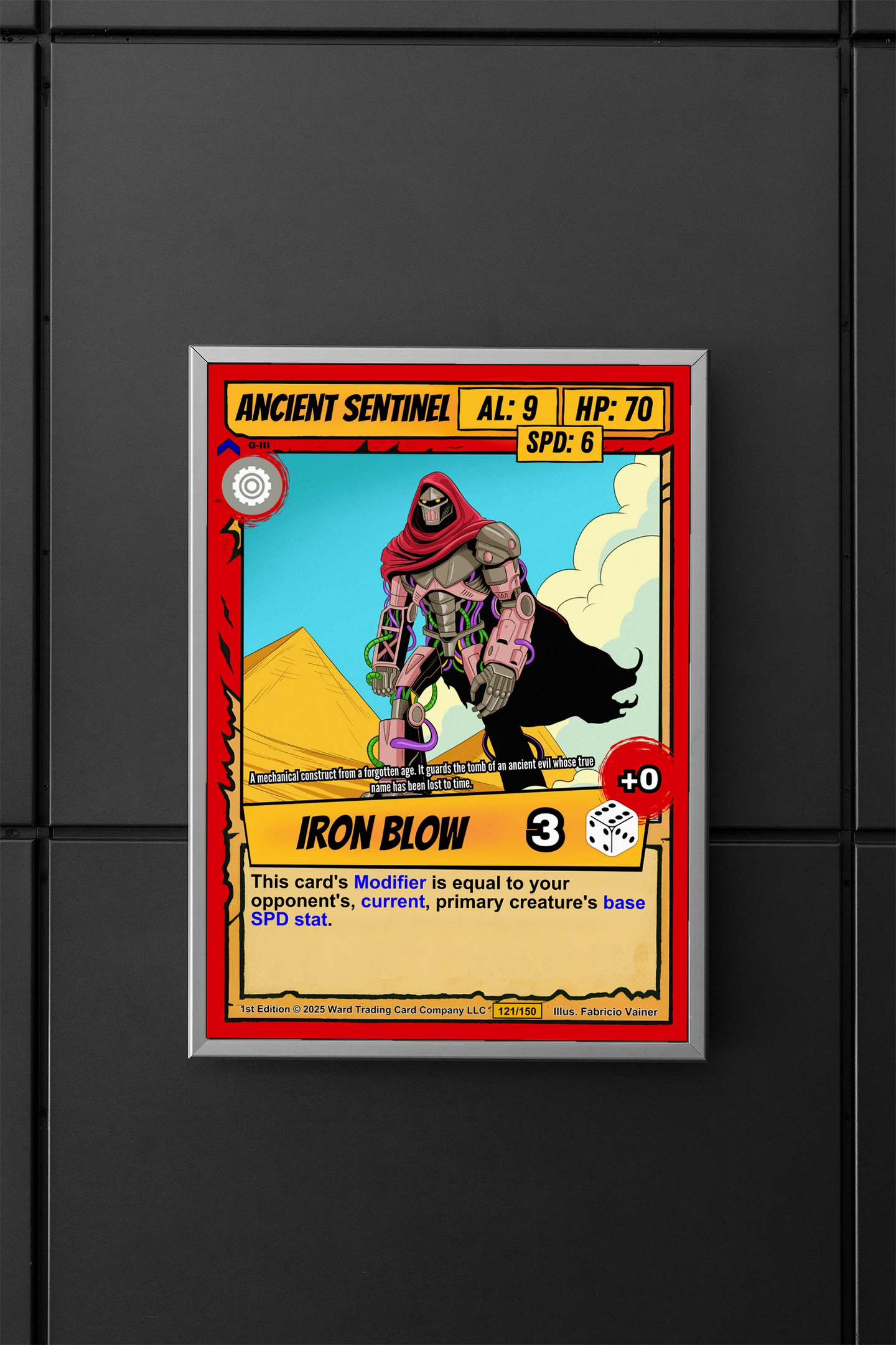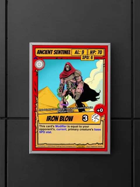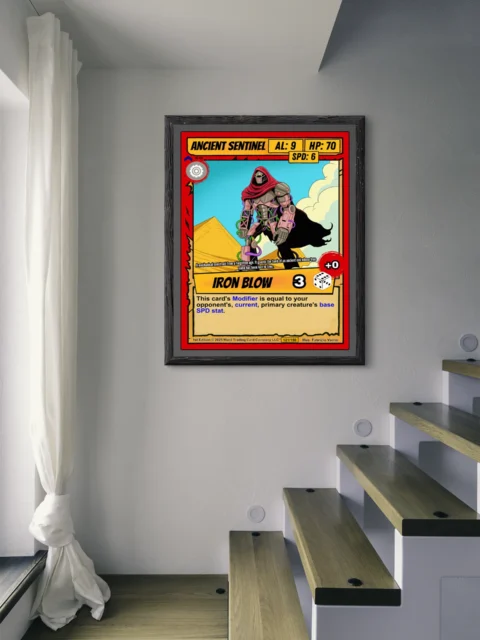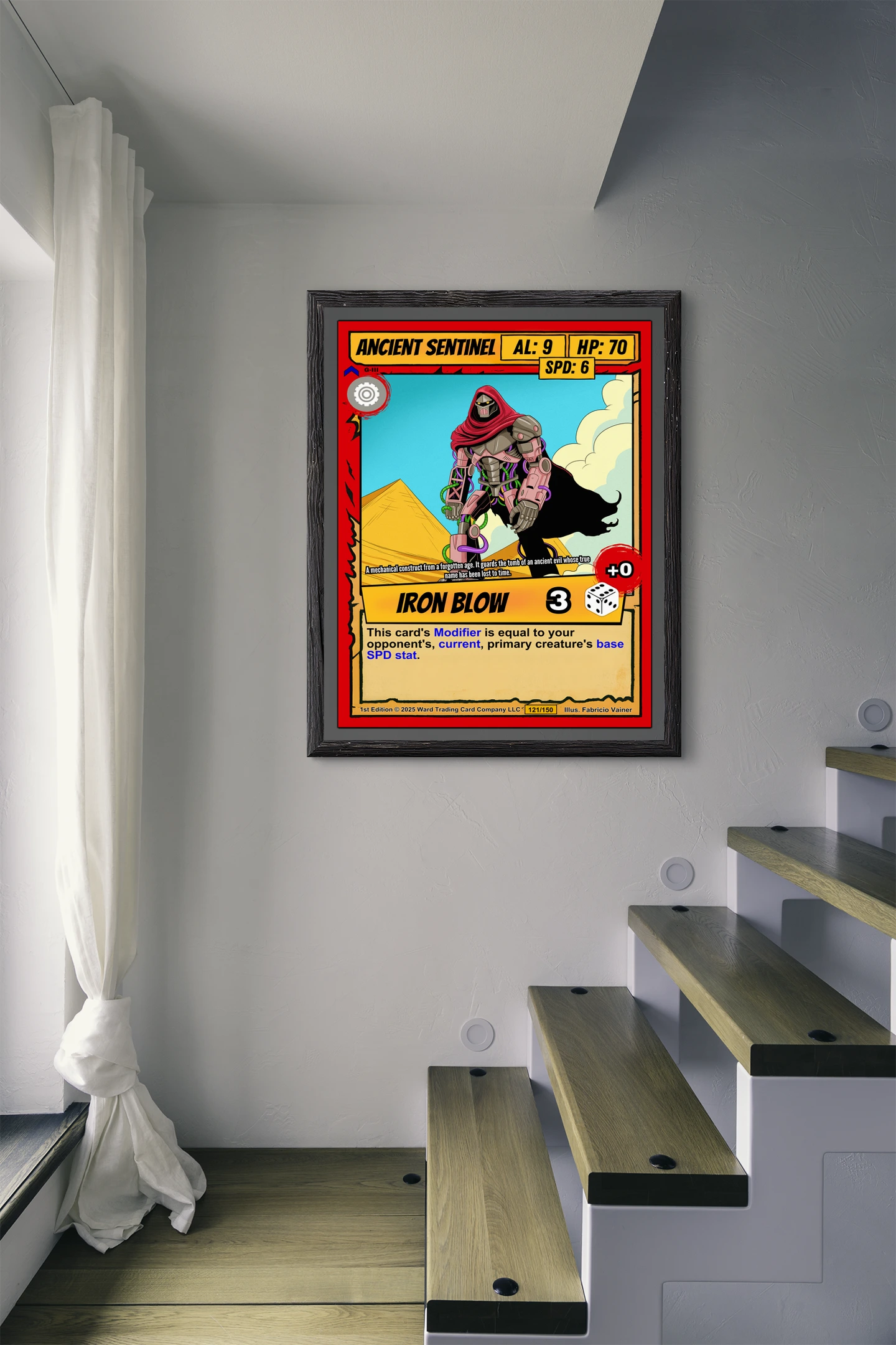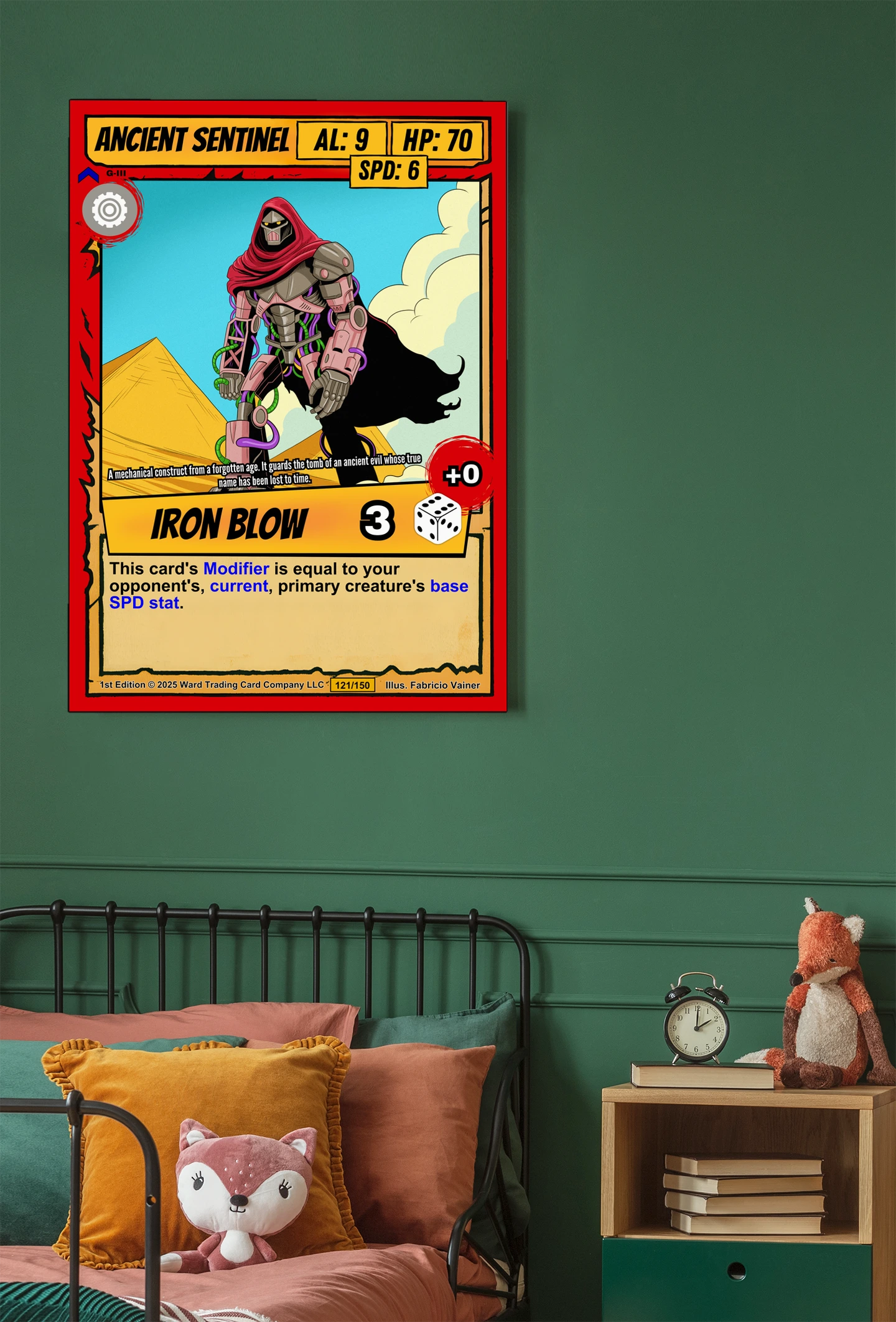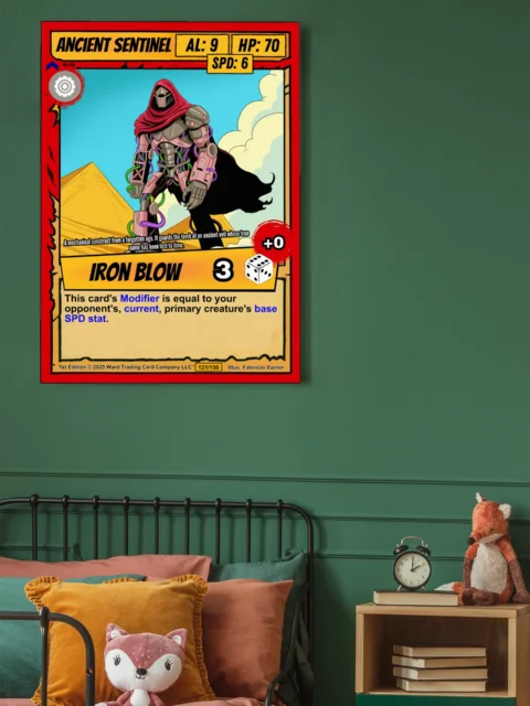 At room scale, the bold comic book linework and flat color palette read clearly across the space. Ward TCG collectors recognize this ancient sentinel trading card canvas print as a Gen 3 standout. Indeed, the mechanical-meets-mystical theme appeals to players who favor artifact-heavy deck strategies.