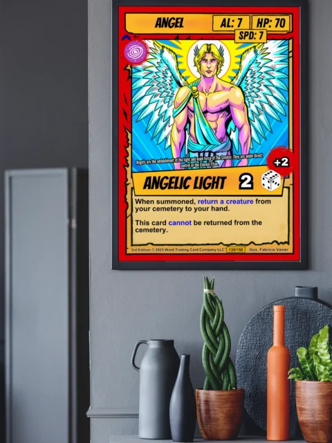 The heroic figure holding a golden staff reads clearly from across a room. Collectors of Ward TCG artwork and fantasy card game enthusiasts are the core buyers. This angel trading card canvas print delivers the complete card layout at wall scale.