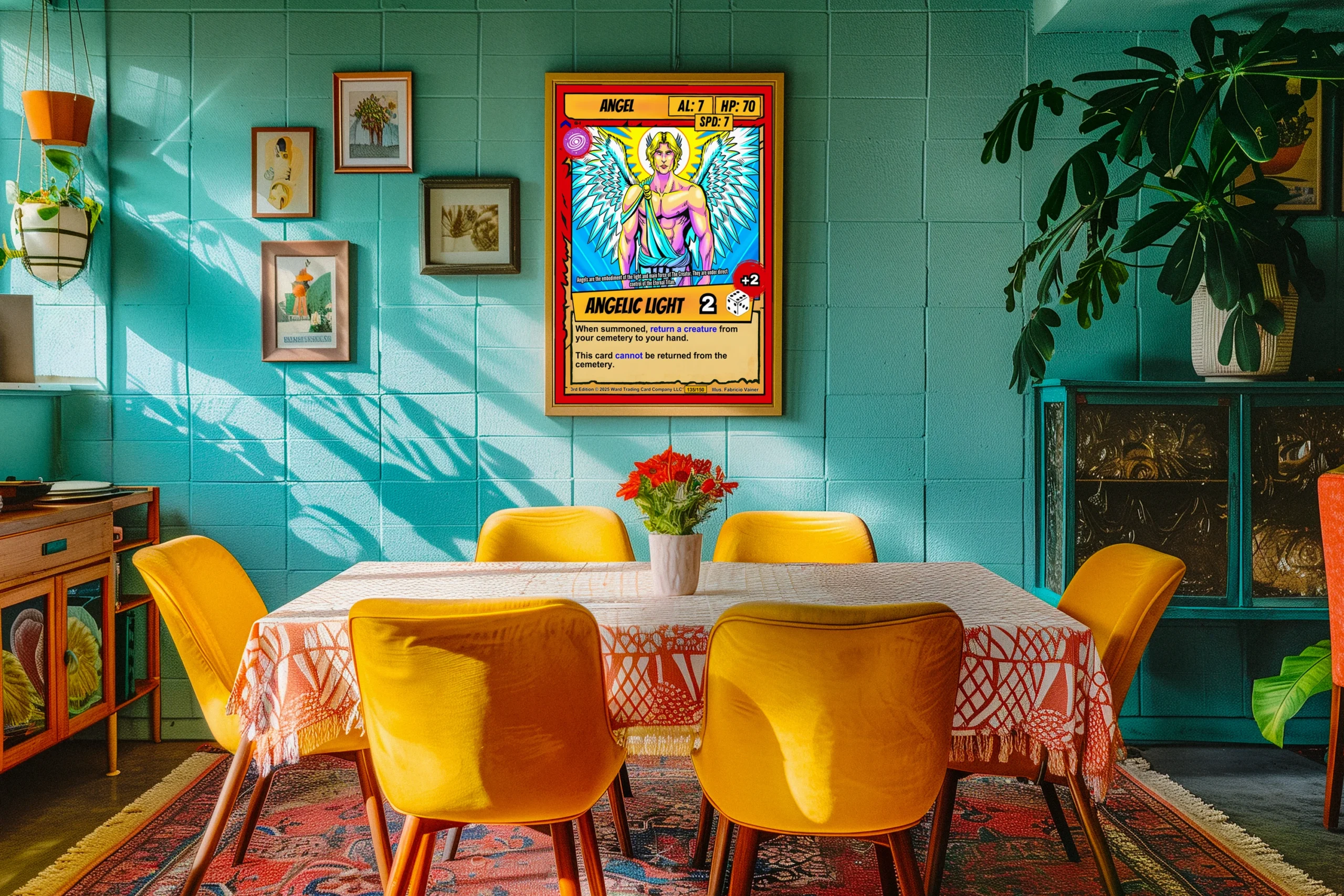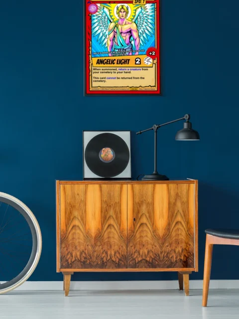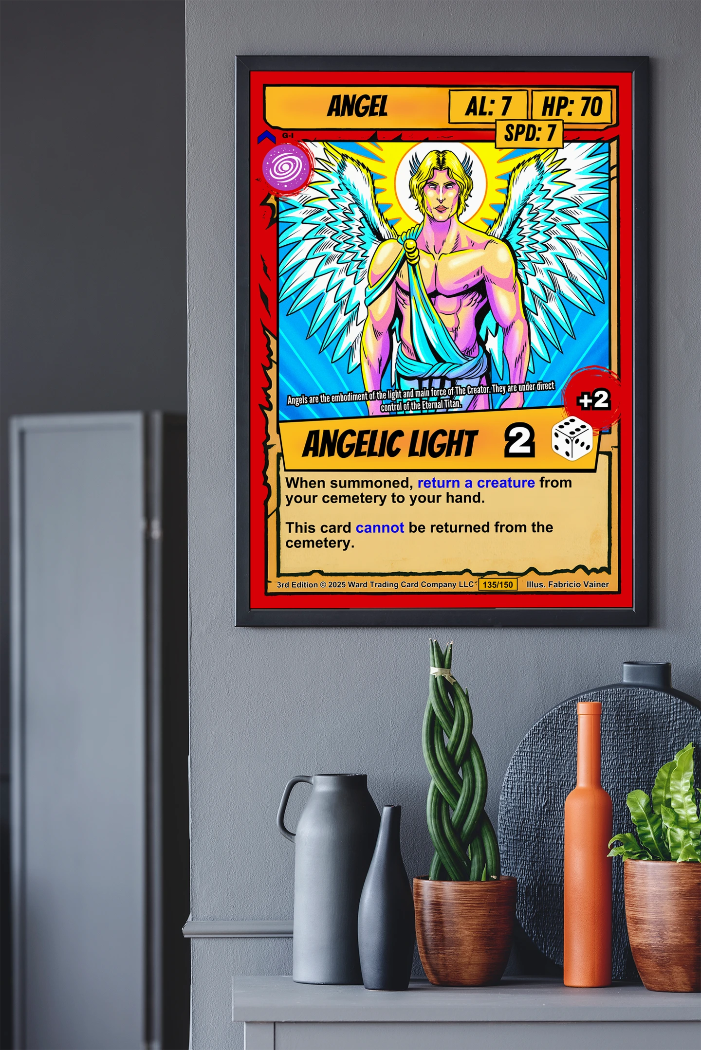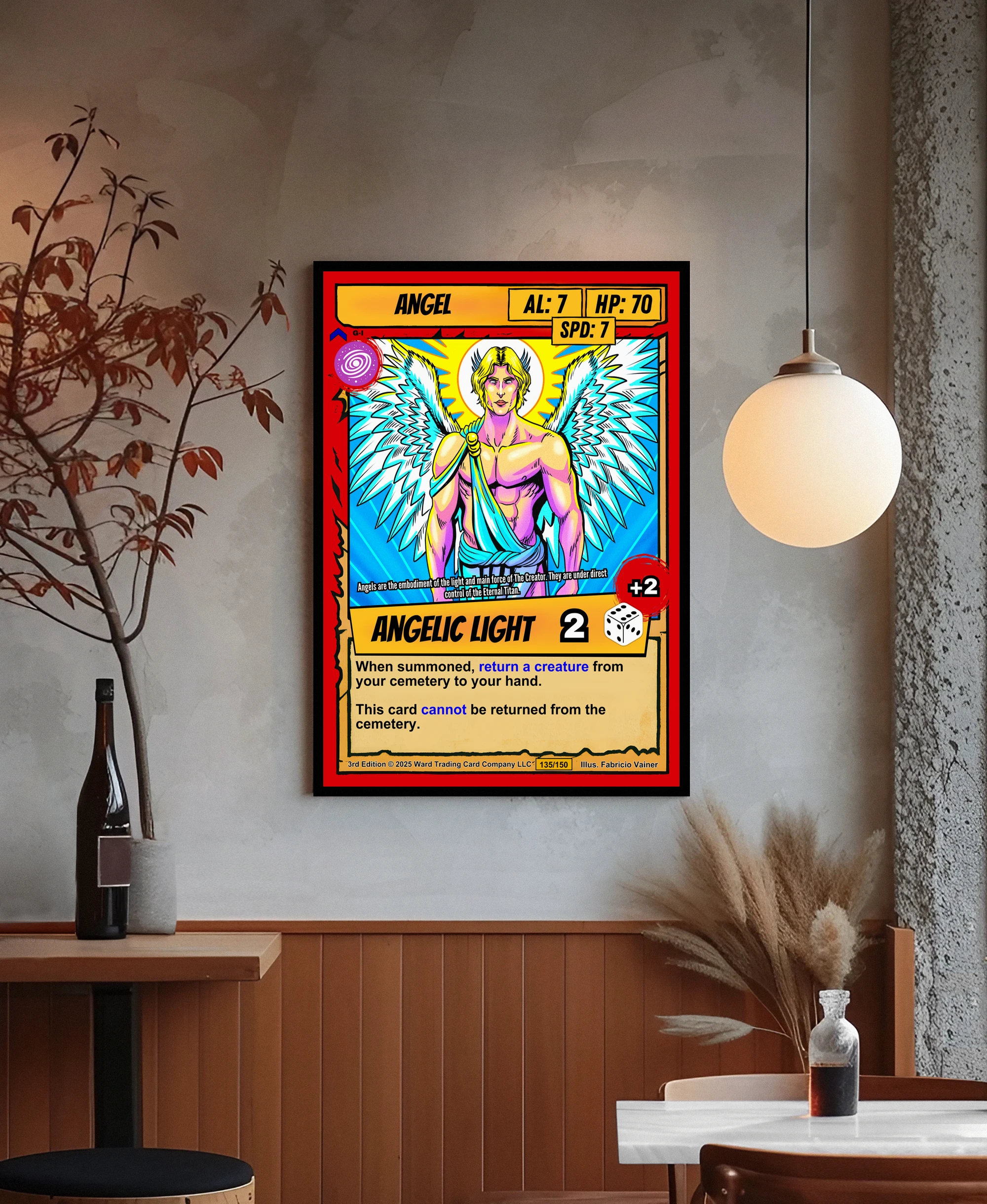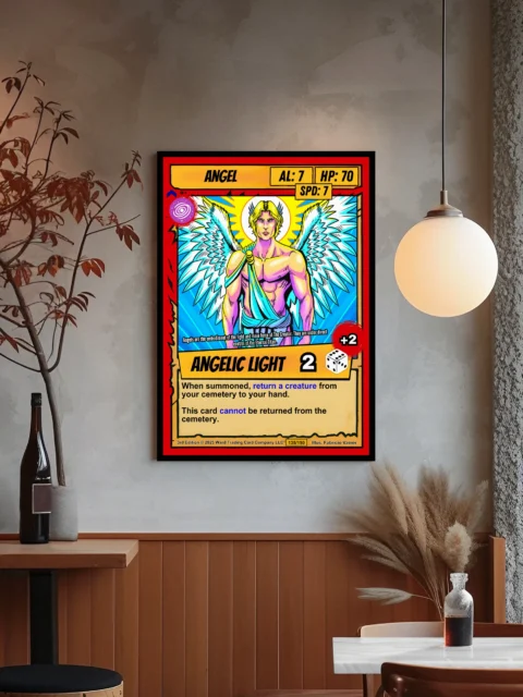 This piece anchors a trading card game collection wall or fantasy art gallery. Moreover, the radiant color palette complements bright, well-lit spaces.
