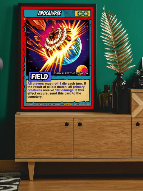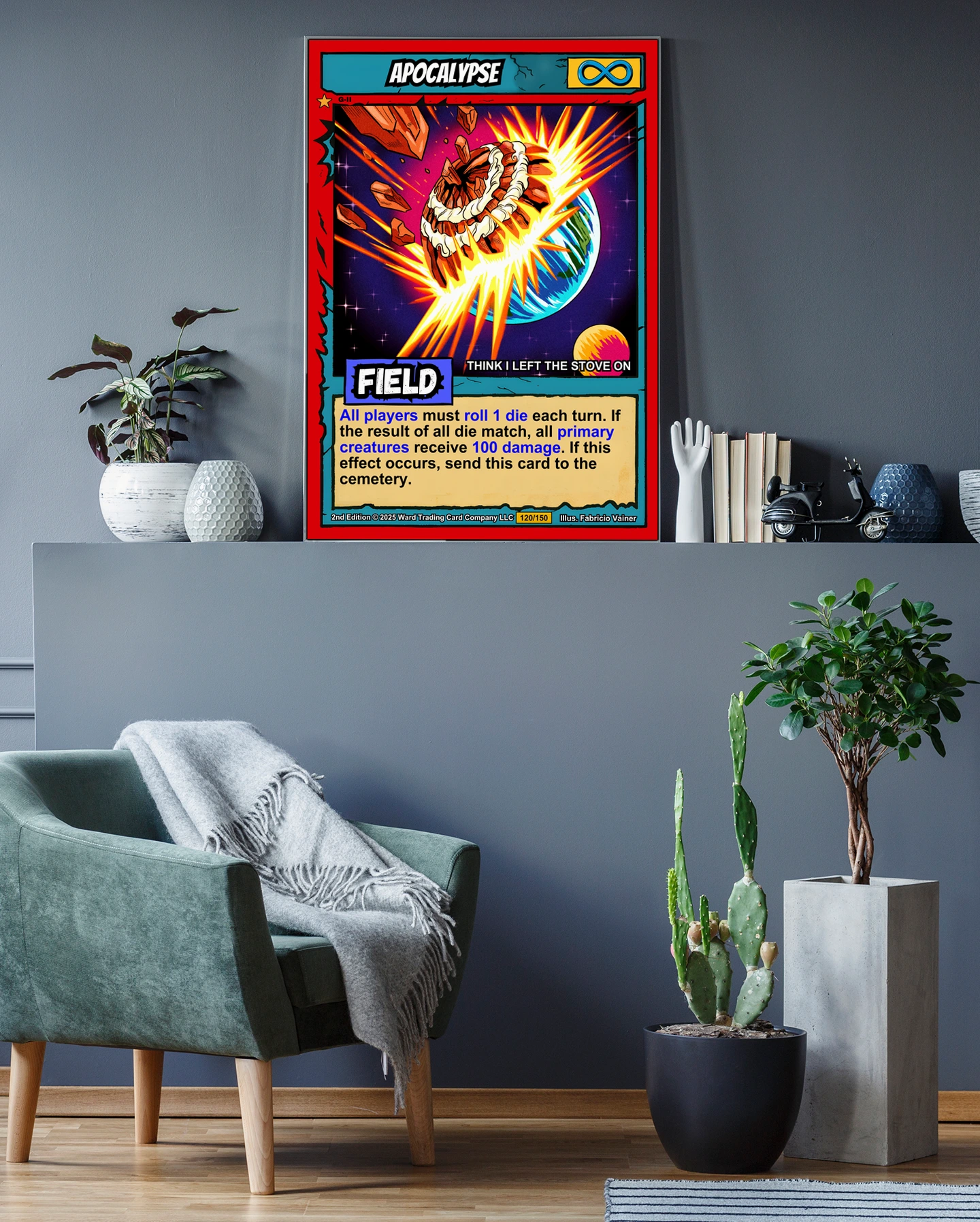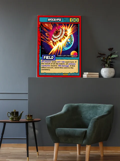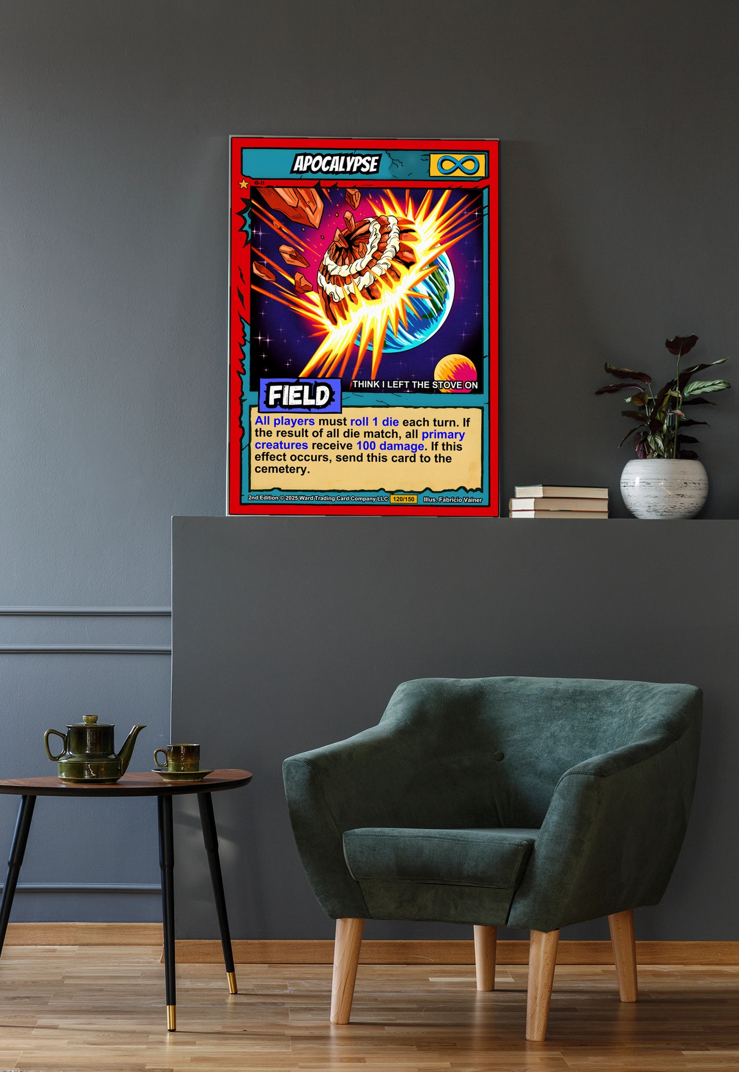 At room scale, the bold linework and high-contrast color scheme read clearly from across the space. Collectors who appreciate cel-shaded comic art and retro trading card design will recognize the aesthetic immediately. This apocalypse trading card canvas print brings Ward TCG’s catastrophic field card artwork to wall scale.