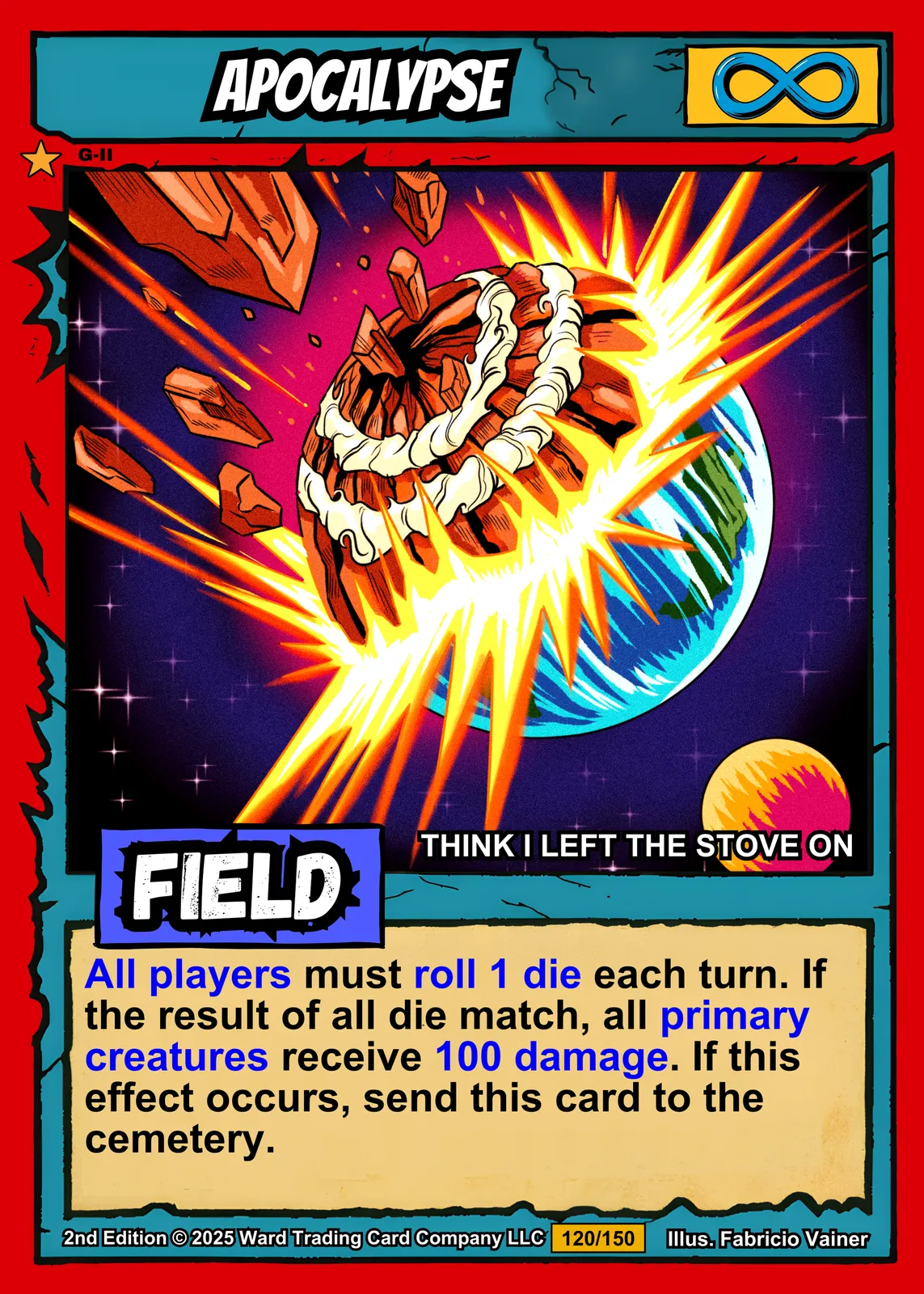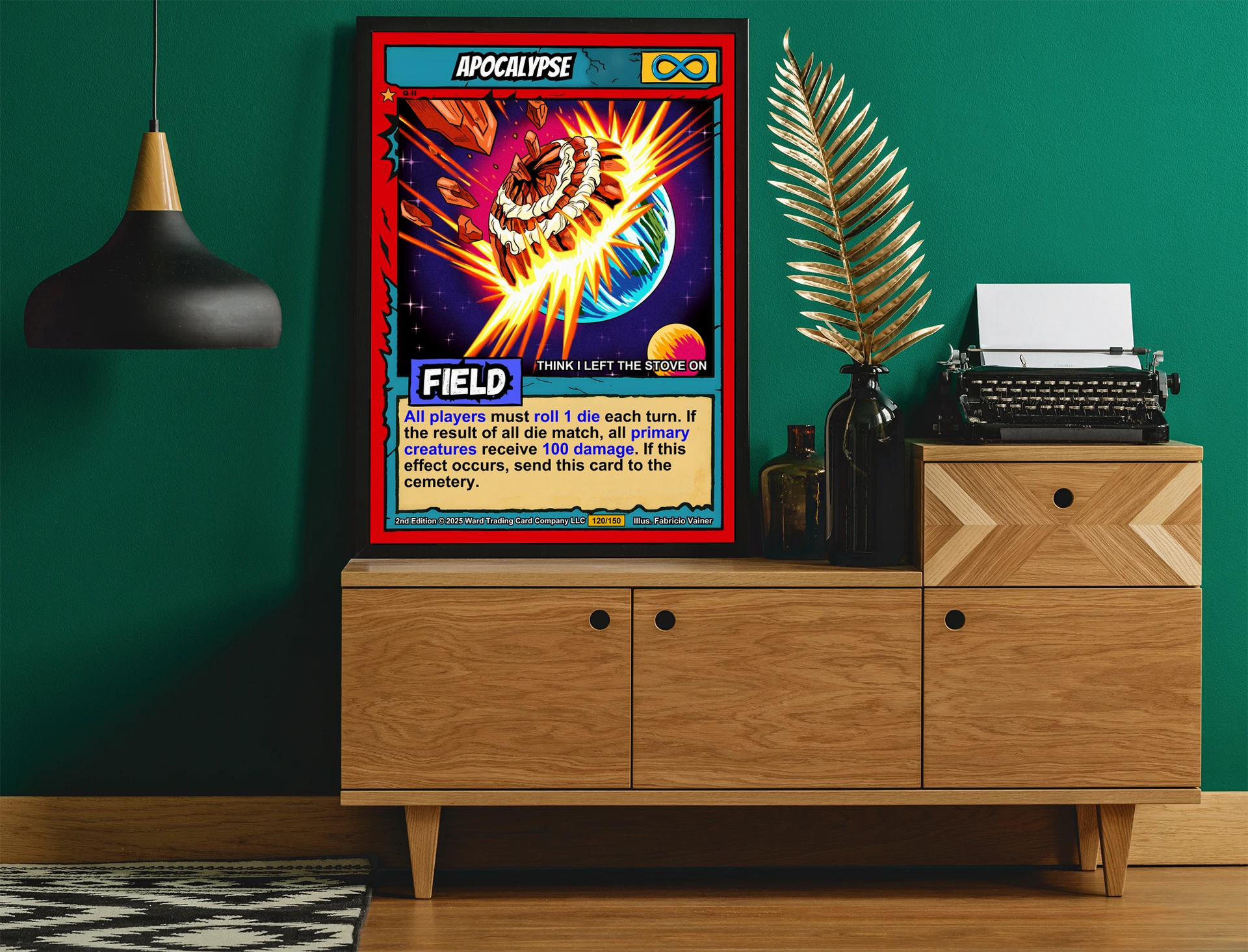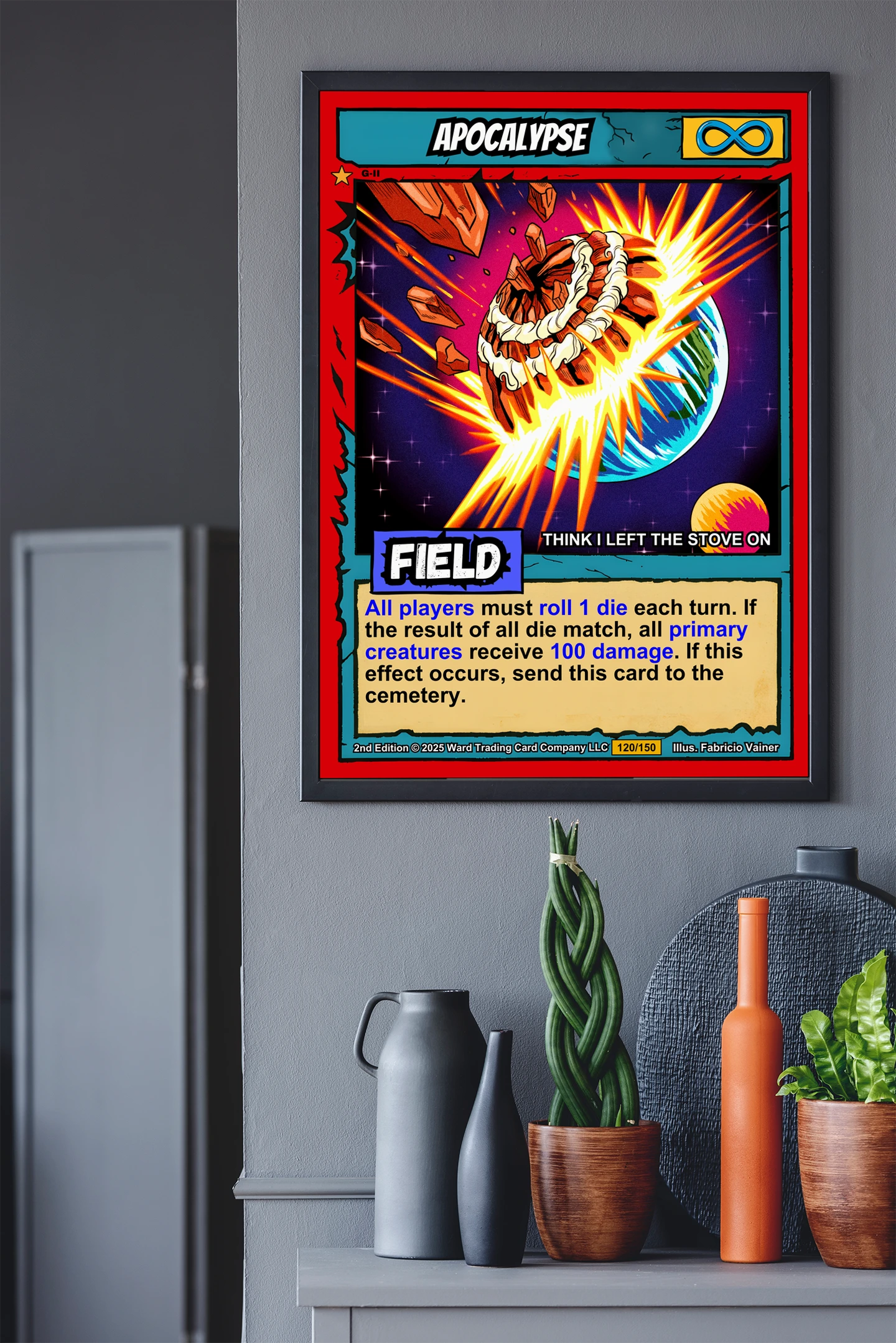 At room scale, the bold linework and high-contrast color scheme read clearly from across the space. Collectors who appreciate cel-shaded comic art and retro trading card design will recognize the aesthetic immediately. This apocalypse trading card canvas print brings Ward TCG’s catastrophic field card artwork to wall scale.