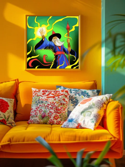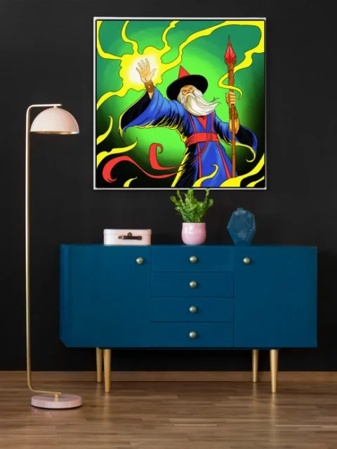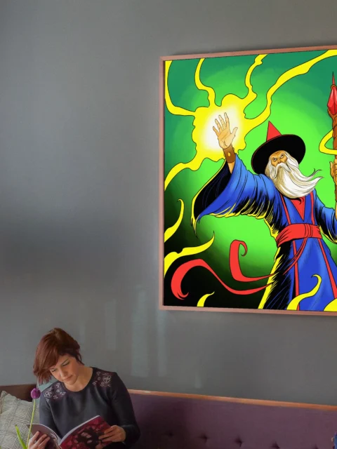 Game rooms benefit from the dramatic magical theme and high-contrast color scheme that complements tabletop setups. Additionally, the comic book rendering style pairs well with other bold fantasy illustrations in collector displays.