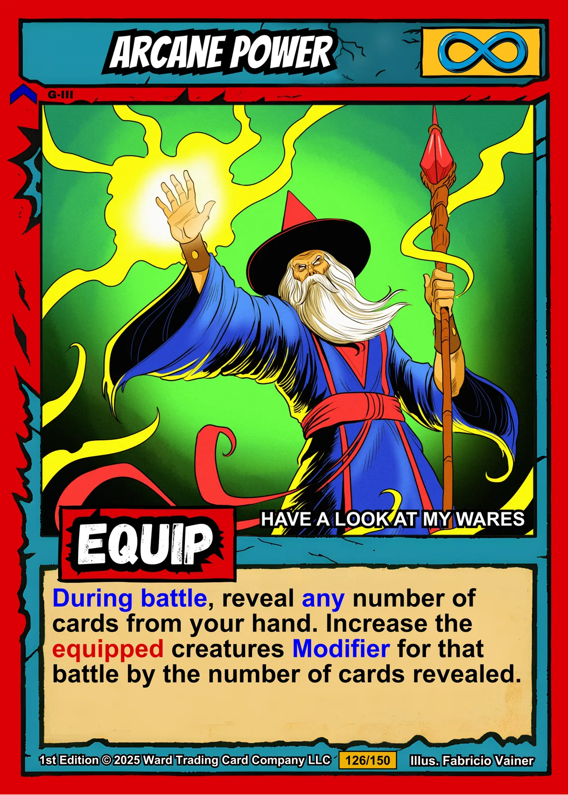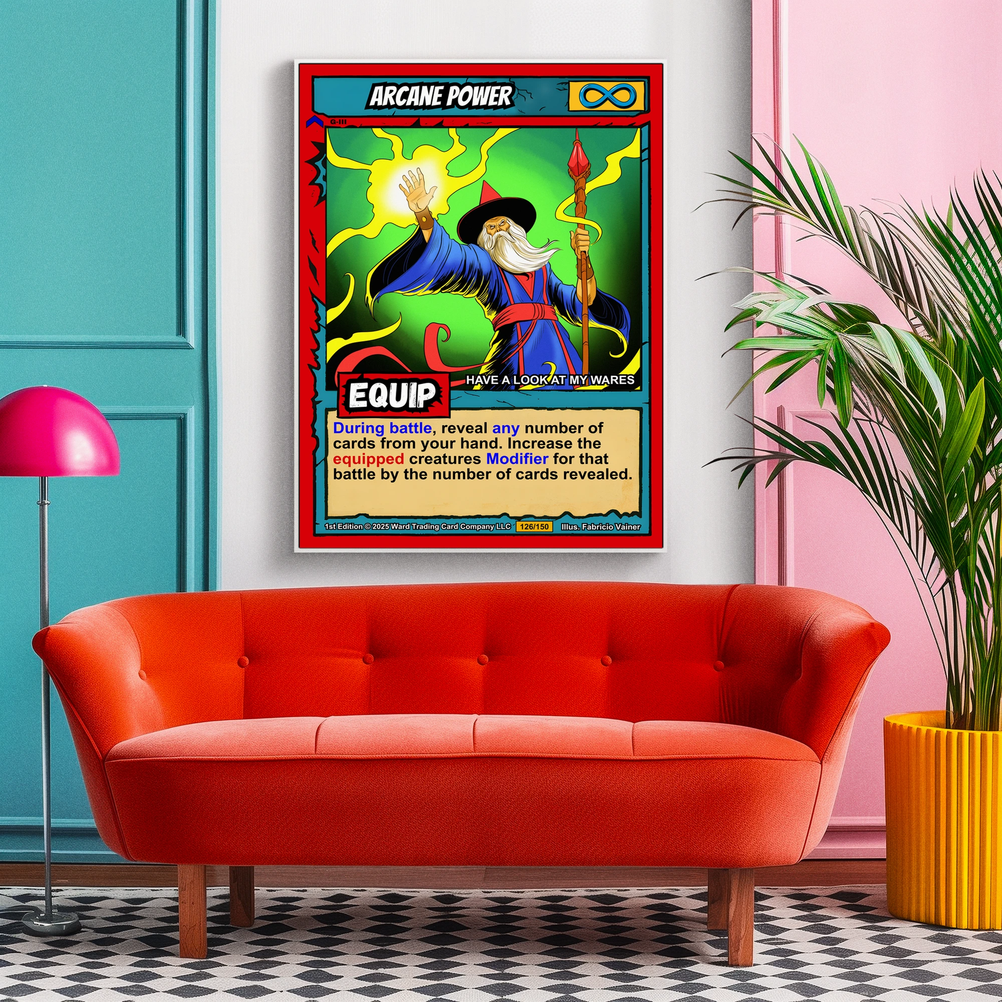 The infinity symbol and red EQUIP label anchor the card’s visual hierarchy. Collectors recognize this arcane power trading card canvas print as equipment-class magic from Ward TCG. At room scale, the saturated colors and bold outlines hold attention across the space.