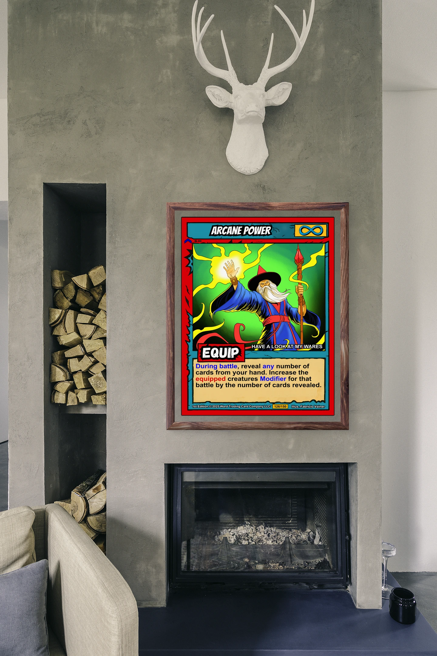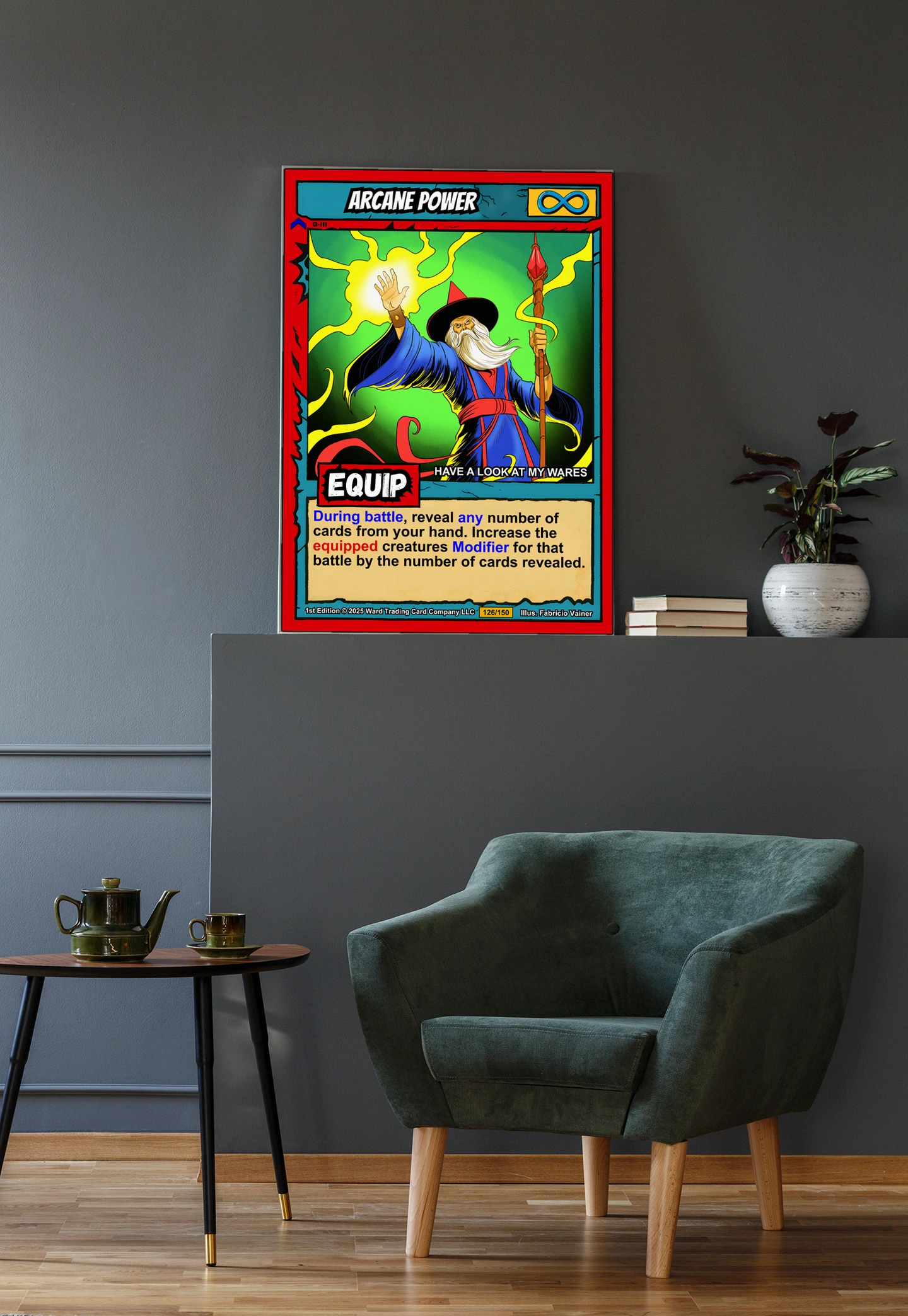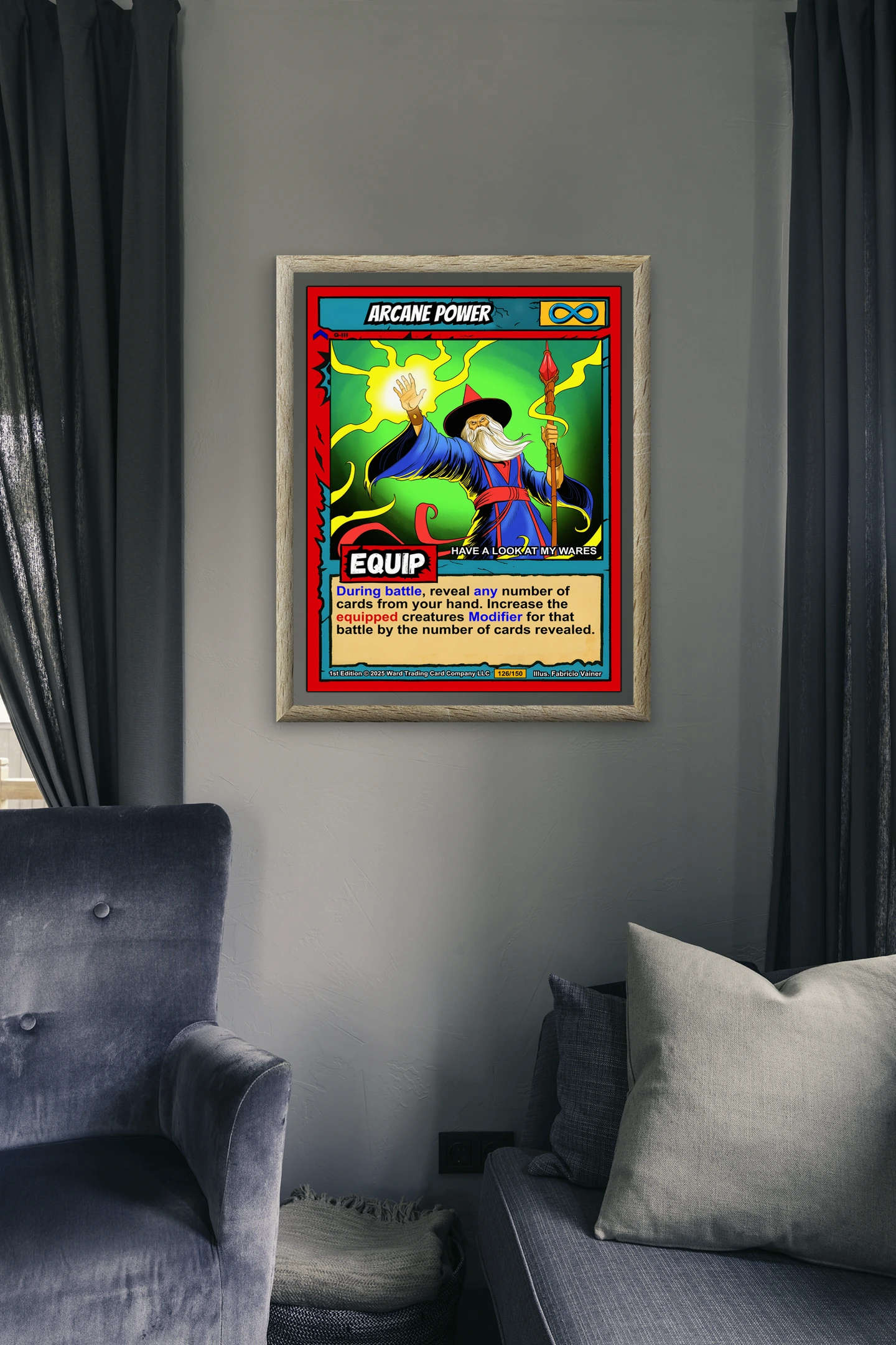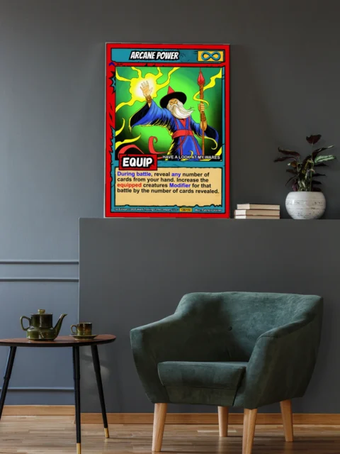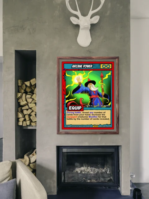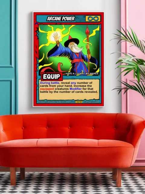 This piece works best in game rooms where trading card nostalgia meets fantasy artwork. Additionally, it fits office spaces where bold color and mystical themes energize creative work.
