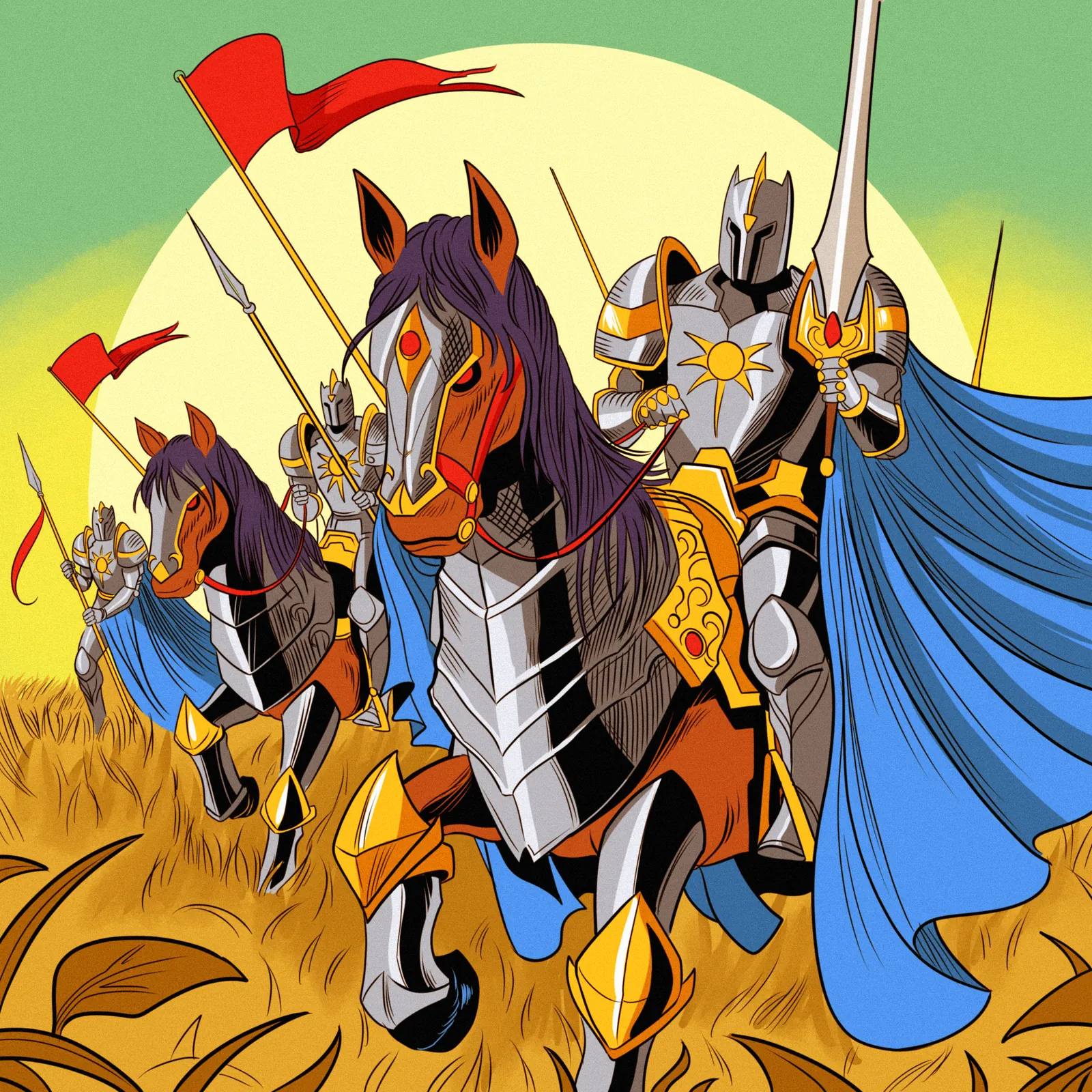 Additionally, the color palette splits between warm golds in the wheat and armor against a gradient teal-to-green sky. The composition uses thick black outlines and flat color fills that create a graphic novel intensity. Moreover, the flowing blue cape and red pennant flags inject movement into the static charge.