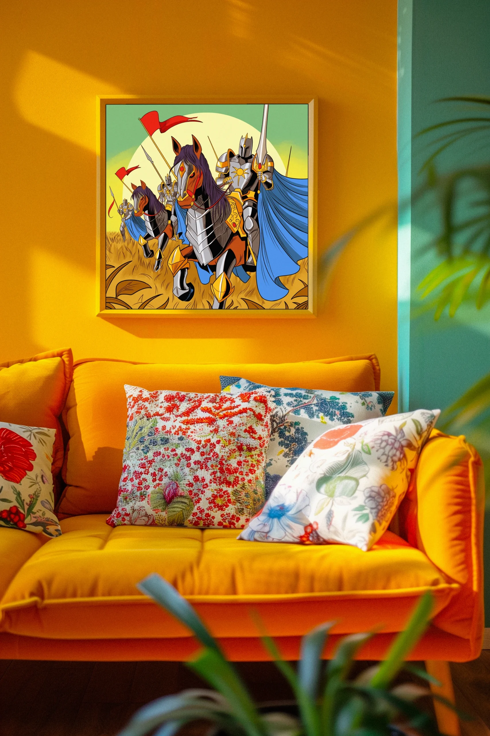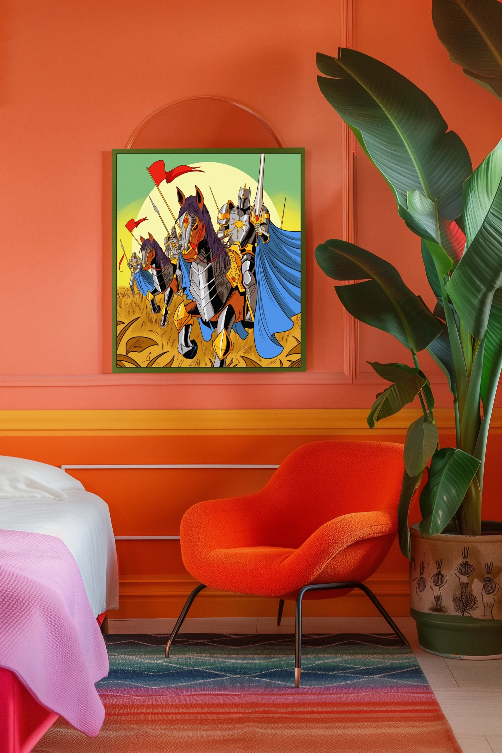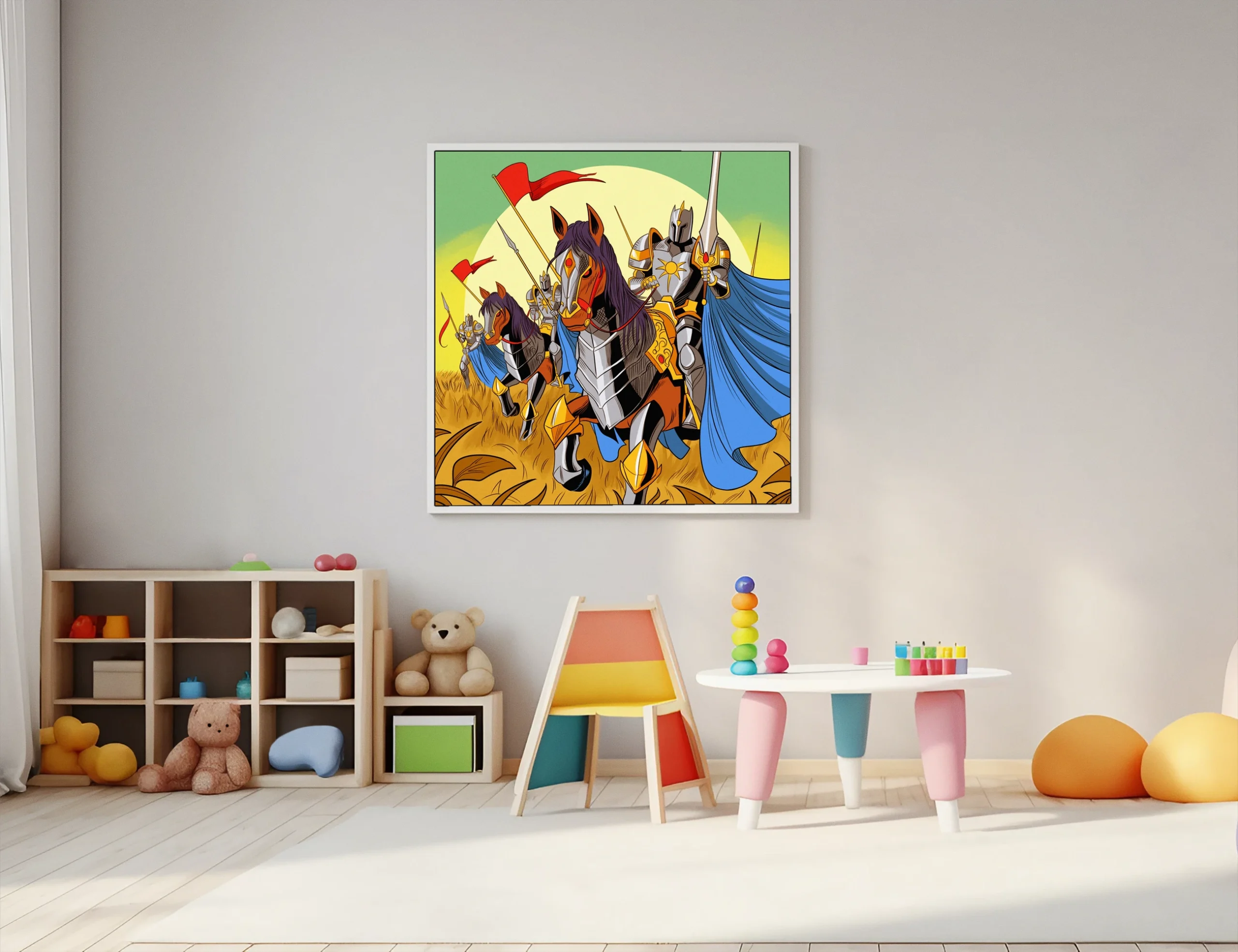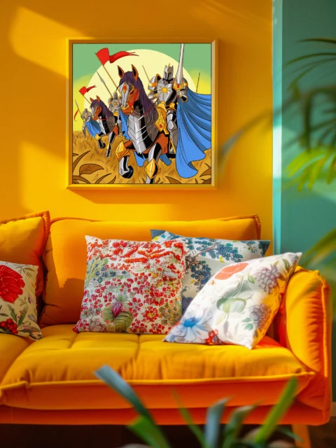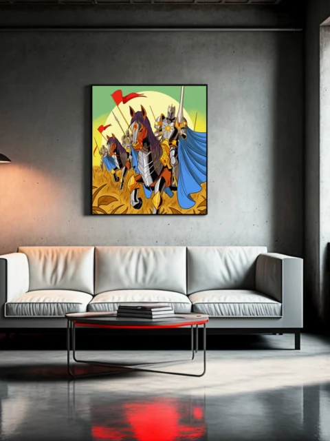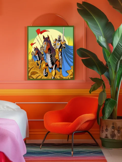 Display in game rooms where the triumphant charge reinforces competitive energy during tabletop sessions. Additionally, the graphic novel aesthetic pairs well with illustration-focused collections and fantasy media shelves.