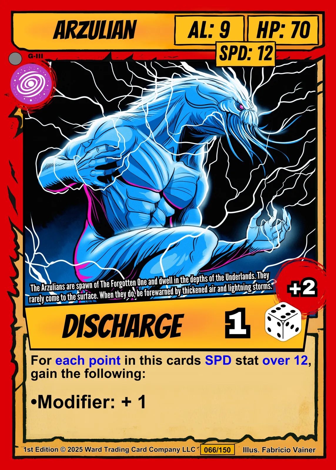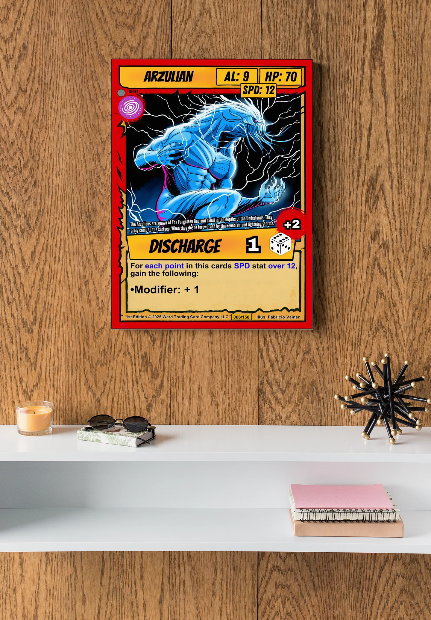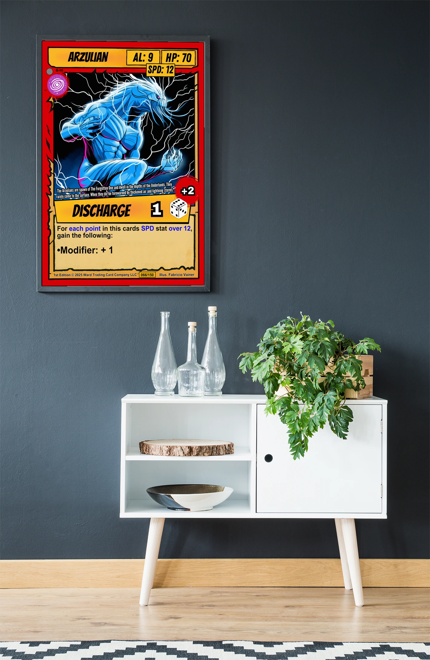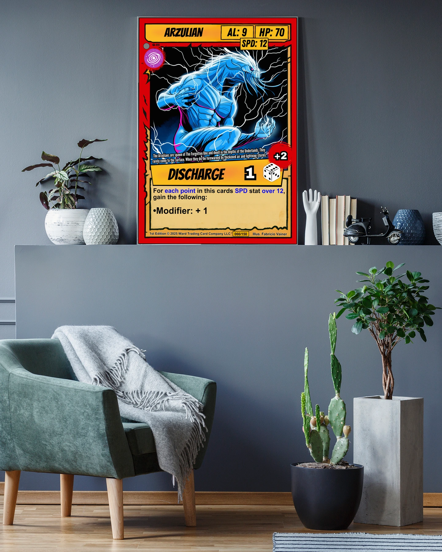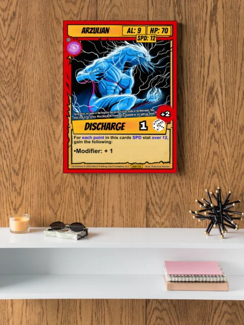 The yellow DISCHARGE ability banner anchors the bottom with a dice icon and red +2 modifier. Bold black outlines and cel-shaded coloring give this piece comic book intensity at room scale. Ward TCG collectors seeking arzulian trading card canvas print options will recognize the signature card structure immediately.