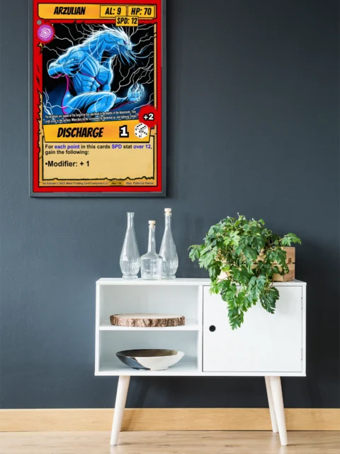 A massive blue-skinned humanoid crouches in an aggressive stance against crackling white lightning. This arzulian trading card canvas print reproduces the full card layout at display scale. Pink glowing eyes and magenta accent lines highlight the creature’s muscular definition.