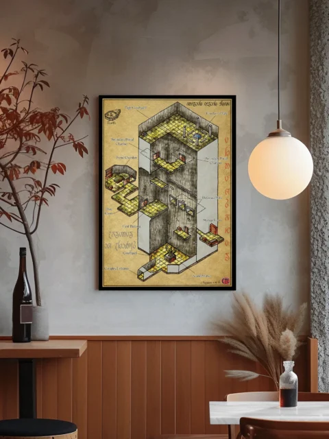 A dedicated display space for tabletop art holds this multi-level dungeon structure beside campaign notes and encounter prep. The architectural cutaway shows sight lines, chokepoints, and vertical movement options during session planning. Furthermore, the grid overlay translates directly to digital VTT imports or printed battle mats.