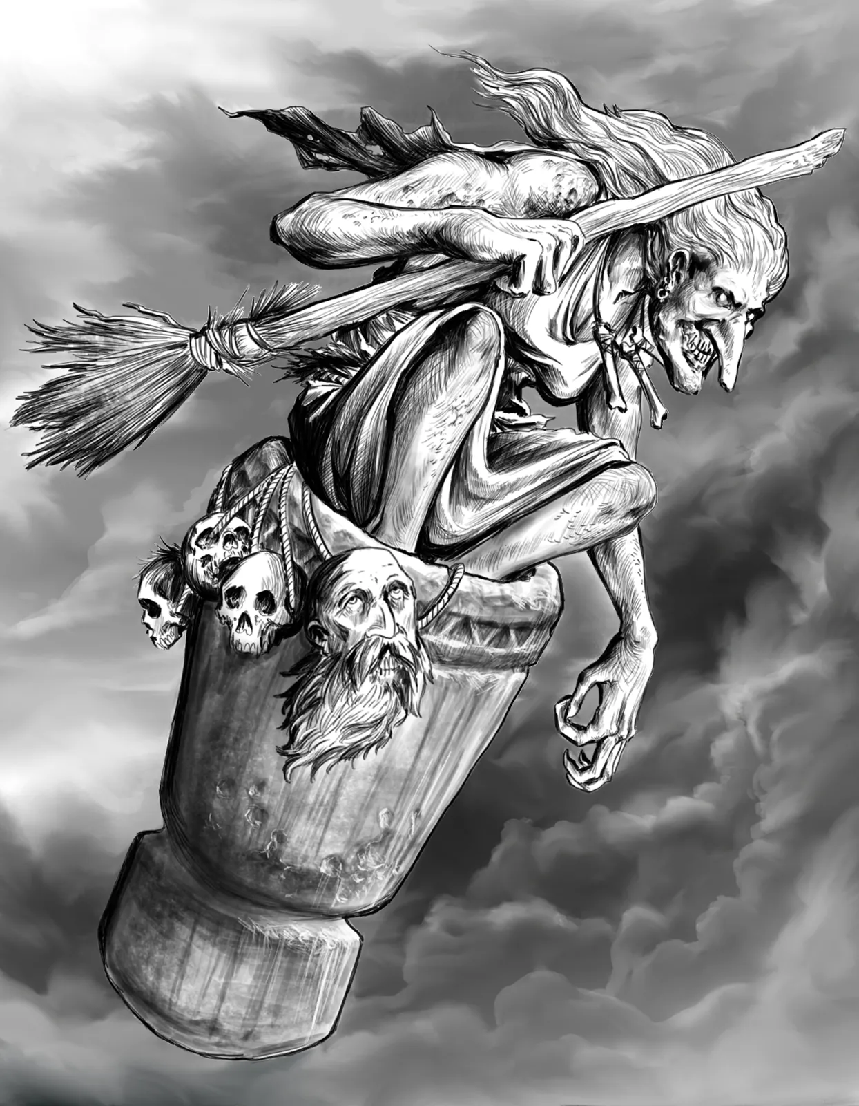 BabaYaga dives through roiling clouds with a predatory grin, hauling grim trophies as she hunts from above. Moreover, the image signals immediate supernatural danger, with teeth, talons, and bone details turning folklore into a direct, living threat.