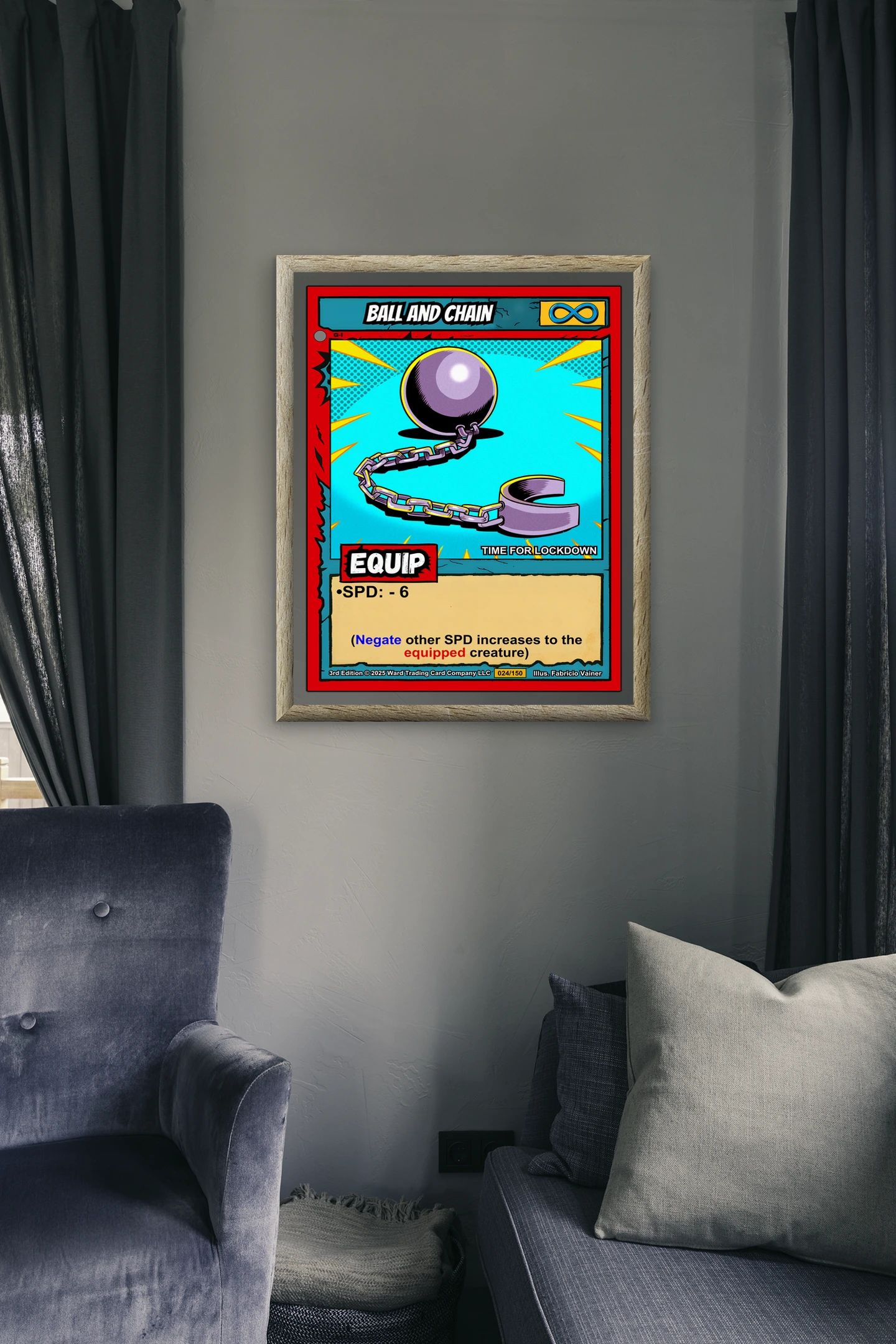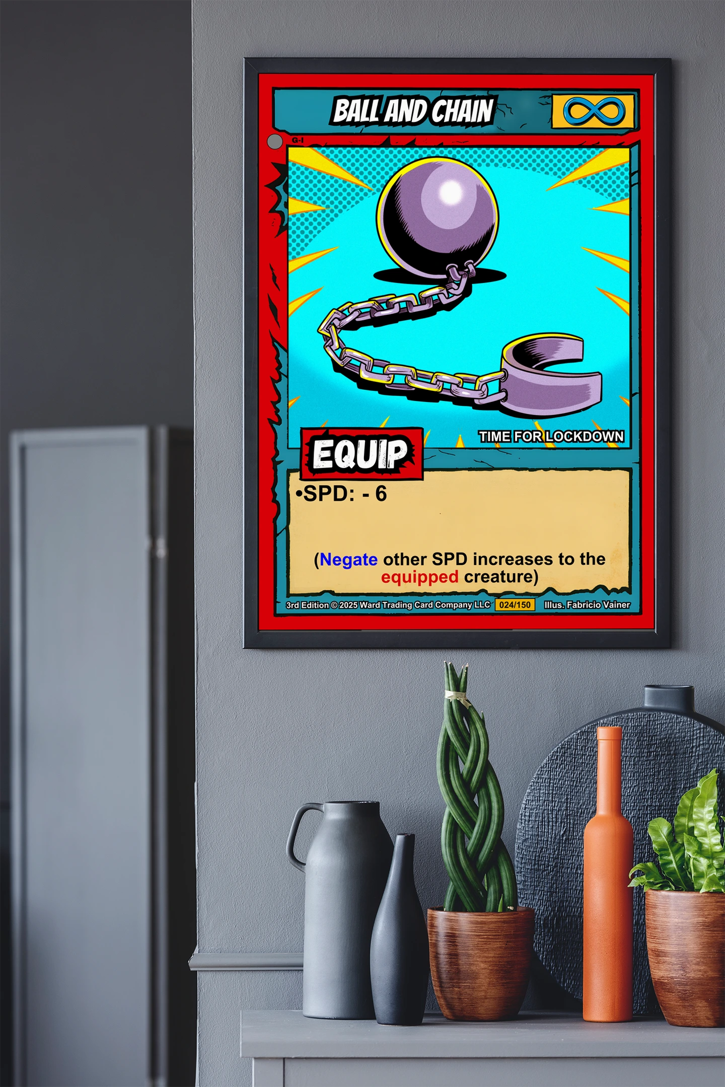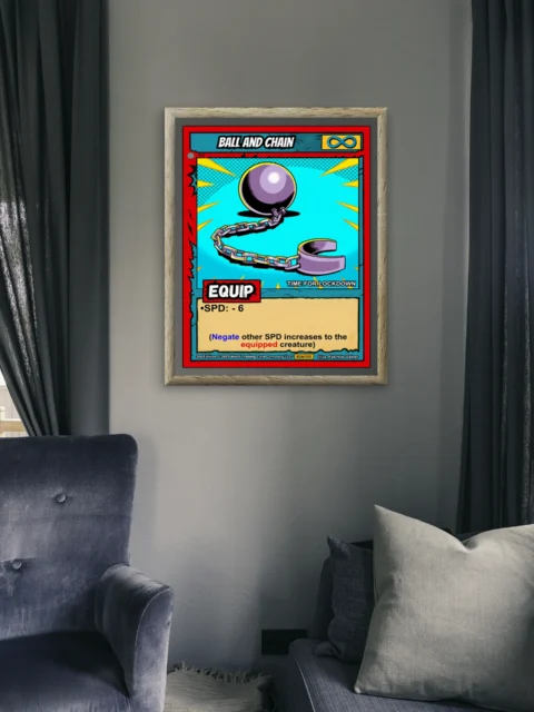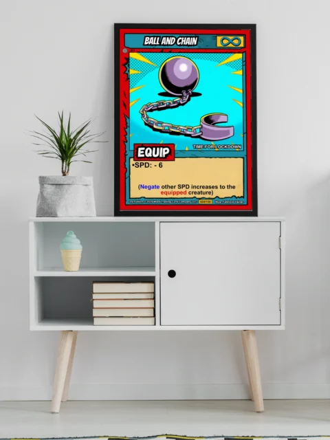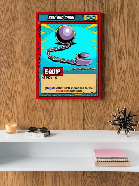 Equipment cards remind players that power comes with consequences and tactical choices. Collectors who appreciate the weight of strategic decisions connect with this piece. Particularly, this ball and chain trading card canvas print anchors any gaming space.