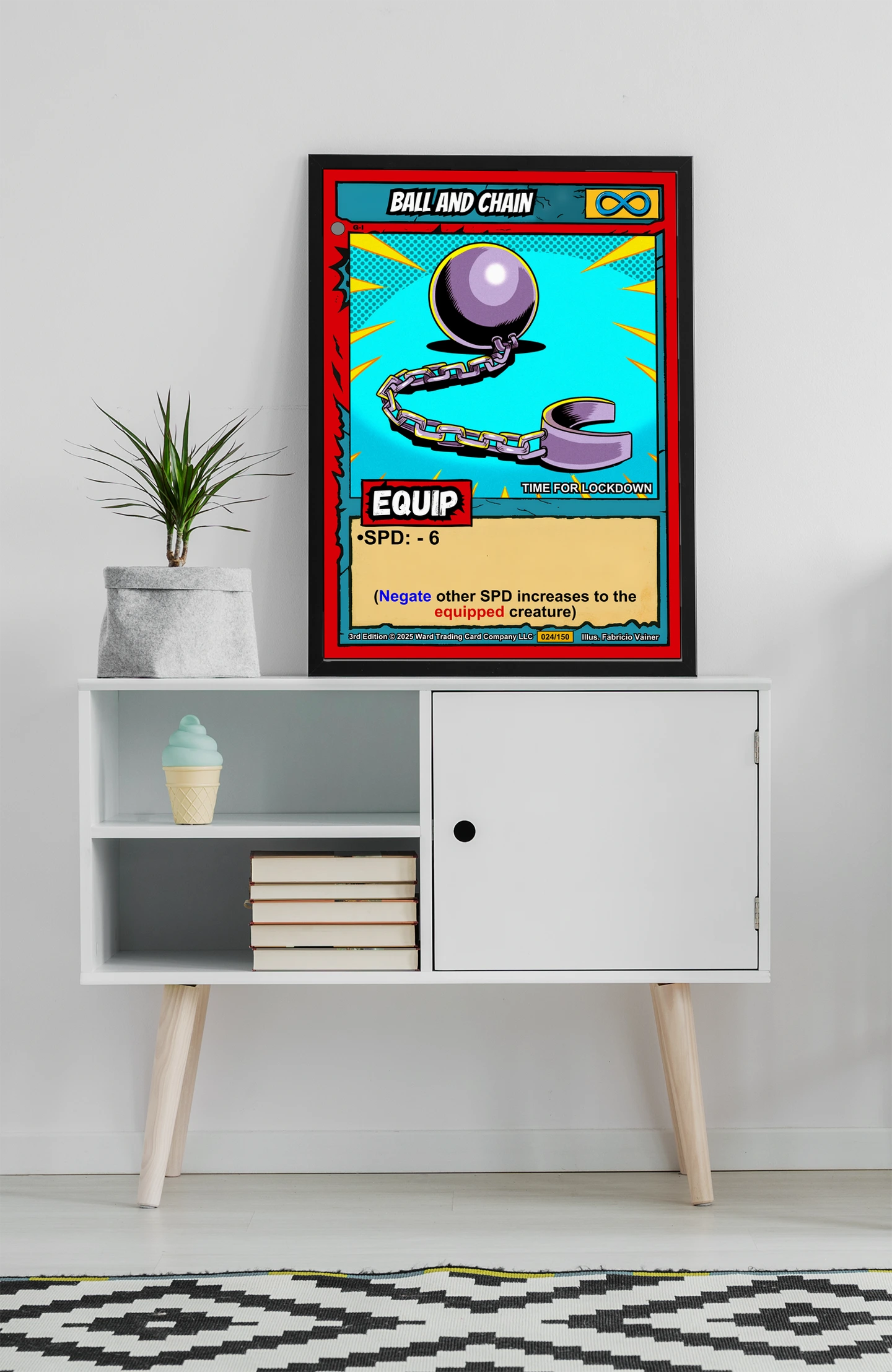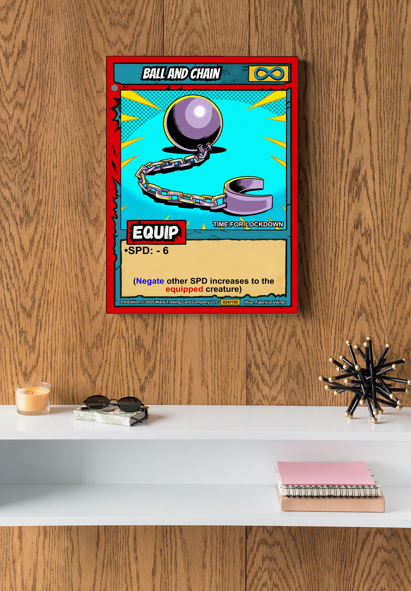 Dedicated display space for tabletop art benefits from equipment cards that show game mechanics. Furthermore, the bold comic styling works well alongside other Ward TCG pieces.